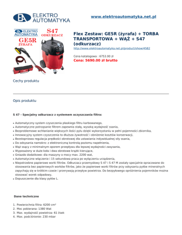www.elektroautomatyka.net.pl Flex Zestaw: GE5R (żyrafa) + TORBA TRANSPORTOWA + WĄŻ + S47 (odkurzacz) http://www.elektroautomatyka.net.pl/product/show/4582 Cena katalogowa : 6753.00 zł Cena: 5690.00 zł brutto Cechy produktu Opis produktu S 47 - Specjalny odkurzacz z systemem oczyszczania filtra: ● ● ● ● ● ● ● ● ● ● ● ● Automatyczny system czyszczenia płaskiego filtru karbowanego, Automatyczne potrząsanie filtrem zapewnia stałą, wysoką wydajność ssania, Bezproblemowe wchłanianie większych ilości pyłu dzięki wykorzystaniu w pełni pojemności zbiornika, Innowacyjny system czyszczenia to dłuższa żywotność i obniżenie kosztów konserwacji, Bezstopniowa regulacja prędkości obrotowej dla ustawiania indywidualnej siły ssania, Do odsysania namokro: z elektroniczną kontrolą poziomu napełnienia, Wąż ssący z minimalnym oporem przepływu dla lepszej wydajności zasysania, Wyposażony w duże koła i dwa obrotowe krążki kierujące, Gniazdo dodatkowe: dla maszyny o mocy max. 2200 wat, Automatyczne włączenie i 15 sekundowa praca po wyłączeniu urządzenia, Niepotrzebne papierowe worki filtrów. Odkurzacz przemysłowy S 47 i S 47 M zostały specjalnie opracowane do stosowania bez papierowych worków filtrów, jako że papierowe worki filtrów przy odsysaniu pyłów mineralnych zapychają się w krótkim czasie i przerywają przepływ powietrza. Do bezpyłowego opróżnienia pojemników można stosować worek odpadowy, Dopuszczenie dla klasy pyłów L. Dane techniczne 1. 2. 3. 4. Powierzchnia filtra: 6200 cm² Moc pobierana: 1380 Wat Max. wydajność powietrza: 61 l/sek Max. podciśnienie: 230 mbar 5. Pojemność zbiornika: 45 l 6. Waga: 13,5 kg Wyposażenie podstawowe: ● ● ● ● ● ● ● 4 m węża giętkiego śr.32 z przejściem na śr.28mm, adapter śr.25-32mm 1 filtr płaski 1 kątownik 2 x 0,5 m metalowa rura ssąca 1 dysza podłogowa do dywanów i wykładzin 1 dysza wąska do spoin 1 PP worek odpadowy FLEX GE5R + TB-L + SH Giraffe®. Szlifierka do ścian i sufitów, najbardziej poręczna ze wszystkich. ● ● ● ● ● ● ● ● ● ● Osłona przeciwpyłowa z obrzeżem szczotkowym. Resorowane obrzeże szczotkowe zapobiega powstawaniu rowków i zadrapań podczas pracy i zapewnia optymalne odsysanie pyłów. Zawieszenie kardanowe. Zawieszona kardanowo głowica szlifierska z zoptymalizowanym przegubem zapewnia dużą elastyczność i doskonałe dopasowanie głowicy do powierzchni ścian i sufitów. Obrotowa głowica szlifierska, krawędziowa. Zarówno kąty jak i przejścia między ścianą a sufitem nie stanowią dla niej problemu. Teraz możesz szlifować miejsca, które do tej pory wymagały zastosowania specjalnych maszyn do prac wykończeniowych. Elastyczny wał napędowy. Dużą elastyczność oraz zminimalizowanie ciężaru na głowicy szlifierki zapewnia prawidłowe przeniesienie napędu w celu ułatwienia obsługi Ergonomiczna rurka prowadząca. Wygodna obsługa dzięki owalnej, wąskiej rurce prowadzącej z uchwytem wpuszczanym - opcjonalnie łatwa regulacja długości do prac na max. wysokości do 3,20 m Elektronika pełno falowa. Regulacja obrotów umożliwia dopasowanie prędkości podczas szlifowania, podczas gdy elektronika pełno falowa utrzymuje stałą liczbę obrotów pod obciążeniami. Ponadto zapewnia ochronę przed przeciążeniem Włącznik / Wyłącznik. Włącznik pozwalający na łagodny rozruch z blokadą do pracy ciągłej Ergonomiczny uchwyt, który zapewnia wygodę i efektywność pracy. Chroni wąż przed zagięciem Przedłużenie. Dzięki przedłużeniu montowanemu na zatrzask można teraz pewnie i wygodnie szlifować nową szlifierką FLEX Giraffe® powierzchnie w pomieszczeniach do 3,20 m wysokości Innowacyjne przyłącze odsysania. Bezpośrednie podłączenie do węża odsysającego dzięki systemowi FLEX Clip-System Dane techniczne 1. 2. 3. 4. 5. 6. 7. 8. 9. 10. Średnica tarczy szlifierskiej maks.: 225 mm Moc pobierana: 500 Wat Prędkość obrotowa biegu jałowego: 1100-1650 / min Uchwyt narzędzia: talerz szlifierski na rzep Przedłużenie: wtykowe, 500 mm Kąt nachylenia na głowicy: 100° Regulacja obrotów: bezstopniowa, 6 pozycji Długość (talerz 90°): 1520 mm Ciężar: 3,9 kg Kabel podłączeniowy: H07 RN-F,5m Wyposażenie podstawowe: ● ● ● ● 1 pad szlifierski miękki 1 pierścień zaciskowy SH-FC 32 1 torba transportowa 1 Antyelektrostatyczny wąż ssący Ø 32 mmx 4 m z zatrzaskiem i złączką do przyłączenia do odkurzacza ELEKTRO-AUTOMATYKA Sprzedaż elektronarzędzi, urządzeń spawalniczych, maszyn budowlanych, pneumatyki, narzędzi warsztatowych, firmowych ubrań roboczych oraz maszyn ogrodowo leśnych. Sklep Bochnia ul. Brzeska 50 32-700 Bochnia Sklep Brzesko ul. Szarych Szeregów 23 32-800 Brzesko Serwis, Magazyn ul. Św. Brata Alberta 4 32-800 Brzesko tel. 691 572 333 e-mail: [email protected] tel. 609 523 230 e-mail: [email protected] tel. 609 523 645 e-mail: [email protected]