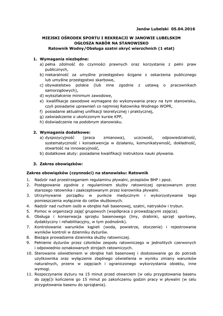 Janów Lubelski 05.04.2016 MIEJSKI OŚRODEK SPORTU I REKREACJI W JANOWIE LUBELSKIM OGŁOSZA NABÓR NA STANOWISKO Ratownik Wodny/Obsługa szatni okryć wierzchnich (1 etat) 1. Wymagania niezbędne: a) pełna zdolność do czynności prawnych oraz korzystanie z pełni praw publicznych, b) niekaralność za umyślne przestępstwo ścigane z oskarżenia publicznego lub umyślne przestępstwo skarbowe, c) obywatelstwo polskie (lub inne zgodnie z ustawą o pracownikach samorządowych), d) wykształcenie minimum zawodowe, e) kwalifikacje zawodowe wymagane do wykonywania pracy na tym stanowisku, czyli posiadanie uprawnień co najmniej Ratownika Wodnego WOPR, f) posiadanie aktualnej unifikacji teoretycznej i praktycznej, g) zaświadczenie o ukończonym kursie KPP, h) doświadczenie na podobnym stanowisku. 2. Wymagania dodatkowe: a) dyspozycyjność (praca zmianowa), uczciwość, odpowiedzialność, systematyczność i konsekwencja w działaniu, komunikatywność, dokładność, otwartość na innowacyjność, b) dodatkowe atuty: posiadanie kwalifikacji instruktora nauki pływania. 3. Zakres obowiązków: Zakres obowiązków (czynności) na stanowisku: Ratownik 1. 2. Nadzór nad przestrzeganiem regulaminu pływalni, przepisów BHP i ppoż. Postępowanie zgodnie z regulaminem służby ratowniczej opracowanym przez starszego ratownika i zaakceptowanym przez kierownika pływalni. 3. Utrzymywanie porządku w punkcie medycznym i wykorzystywanie tego pomieszczenia wyłącznie do celów służbowych. 4. Nadzór nad ruchem osób w obrębie hali basenowej, szatni, natrysków i trybun. 5. Pomoc w organizacji zajęć grupowych (współpraca z prowadzącymi zajęcia). 6. Obsługa i konserwacja sprzętu basenowego (liny, drabinki, sprzęt sportowy, dydaktyczny i rehabilitacyjny, w tym podnośnik). 7. Kontrolowanie warunków kąpieli (woda, powietrze, otoczenie) i rejestrowanie wyników kontroli w dzienniku dyżurów. 8. Bieżące prowadzenie dziennika służby ratowniczej. 9. Pełnienie dyżurów przez członków zespołu ratowniczego w jednolitych czerwonych i odpowiednio oznakowanych strojach ratowniczych. 10. Sterowanie oświetleniem w obrębie hali basenowej i dostosowanie go do potrzeb użytkownika oraz wyłączenie zbędnego oświetlenia w wyniku zmiany warunków naturalnych, przerw w zajęciach i ograniczonego wykorzystania obiektu, inne wymogi. 11. Rozpoczynanie dyżuru na 15 minut przed otwarciem (w celu przygotowania basenu do zajęć)i kończenie go 15 minut po zakończeniu godzin pracy w pływalni (w celu przygotowania basenu do sprzątania). 12. Zgłaszanie konieczności uzupełniania sprzętu ratowniczego i medycznego w zależności od potrzeb i terminów ważności ich użycia zgodnie z obowiązującymi standardami medycznymi. 13. Dbanie o stan techniczny sprzętu ratowniczego oraz medycznego będącego na wyposażeniu pływalni. 14. Zapoznanie się i przestrzeganie instrukcji bezpieczeństwa na imprezach o charakterze masowym zgodnie z obowiązującymi przepisami bezpieczeństwa oraz regulaminem danej imprezy. 15. Przestrzeganie zarządzeń, regulaminów i innych przepisów wewnętrznych zleceniodawcy. 16. Wykonanie poleceń kierownictwa obiektu oraz przełożonego. Zakres obowiązków wierzchnich (czynności) na stanowisku: Obsługa szatni okryć 1. Obsługa klientów, przyjmowanie i wydawanie okryć wierzchnich i obuwia, wydawanie numerów. 2. Informacyjna obsługa klientów, zapoznanie z ofertą i cennikiem MOSiR, charakterem usług wykonywanych przez najemców, kierowanie, celem załatwienia konkretnej sprawy do osób kompetentnych w tym zakresie. 3. Pilnowanie przestrzegania przez klientów regulaminów obowiązujących na obiekcie, w szczególności pozostawiania ubrań wierzchnich i obuwia w szatni, oraz ścisła w tym zakresie współpraca z działami KP/K i KP/HP, celem uniemożliwienia osobom niekorzystającym z szatni okryć wierzchnich dalszej ich obsługi na obiekcie. 4. Wspólnie z działem KP/HP utrzymanie wszystkich objętych stanowiskiem pracy powierzchni podłogowych w stanie należytej czystości. 5. Zgłaszanie działowi KP/T konieczności oczyszczenia mat wycieraczkowych. 6. Monitorowanie stanu należytej czystości powierzchni szklanych drzwi i okien, klamek, balustrad i zgłaszanie działowi KP/HP konieczności jej poprawy. 7. Monitorowanie stanu należytej czystości poczekalni i toalety Jaskini Solnej i zgłaszanie działom KP/HP i KP/T konieczności jej poprawy. 8. Udzielanie pomocy klientom sygnalizującym problem z korzystaniem z Jaskini Solnej przy współpracy z działami KP/T i KP/K. 9. Dbałość o stan koszy i zapobieganie ich przepełnieniu. 10.Dbałość o zieleń doniczkową na objętej stanowiskiem powierzchni. 11.Racjonalne gospodarowanie energią elektryczną i oświetleniem. 12.Dbałość o racjonalne gospodarowanie energią cieplną poprzez kontrolę termostatów grzejników c. o. 13.Dbałość o przestrzeganie obowiązujących regulaminów oraz ład i porządek. 4. Wymagane dokumenty: a) list motywacyjny, życiorys (CV), b) oświadczenie o niekaralności za umyślne przestępstwo ścigane z oskarżenia publicznego lub umyślne przestępstwo skarbowe, c) oświadczenie o pełnej zdolności do czynności prawnych oraz korzystania z pełni praw publicznych, d) kopie dokumentów potwierdzających wykształcenie i kwalifikacje, e) kopie innych dodatkowych dokumentów o kwalifikacjach i umiejętnościach, referencje, opinie. Za wiarygodność przedstawionych kopii dokumentów ponosi pełna odpowiedzialność osoba składająca dokumenty. Oryginały dokumentów będą weryfikowane w przypadku pozytywnego dla kandydata rozstrzygnięcia naboru. 5. Oferujemy: a) Miejsce świadczenie pracy: Miejski Ośrodek Sportu i Rekreacji w Janowie Lubelskim b) Rodzaj zatrudnienia: Umowa o pracę na czas określony ok. 1 roku c) Wymiar etatu: w pełnym wymiarze d) Liczba godzin pracy w tygodniu: 40 e) Zmianowość: dwie zmiany 6. Termin składania dokumentów: Wymagane dokument