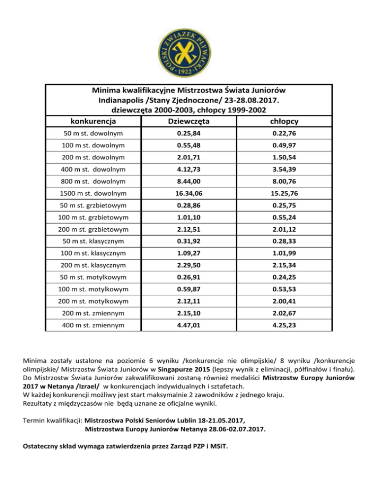 Minima kwalifikacyjne Mistrzostwa Świata Juniorów Indianapolis /Stany Zjednoczone/ 23-28.08.2017. dziewczęta 2000-2003, chłopcy 1999-2002 konkurencja Dziewczęta chłopcy 50 m st. dowolnym 0.25,84 0.22,76 100 m st. dowolnym 0.55,48 0.49,97 200 m st. dowolnym 2.01,71 1.50,54 400 m st. dowolnym 4.12,73 3.54,39 800 m st. dowolnym 8.44,00 8.00,76 1500 m st. dowolnym 16.34,06 15.25,76 50 m st. grzbietowym 0.28,86 0.25,75 100 m st. grzbietowym 1.01,10 0.55,24 200 m st. grzbietowym 2.12,51 2.01,12 50 m st. klasycznym 0.31,92 0.28,33 100 m st. klasycznym 1.09,27 1.01,99 200 m st. klasycznym 2.29,50 2.15,34 50 m st. motylkowym 0.26,91 0.24,25 100 m st. motylkowym 0.59,87 0.53,53 200 m st. motylkowym 2.12,11 2.00,41 200 m st. zmiennym 2.15,10 2.02,67 400 m st. zmiennym 4.47,01 4.25,23 Minima zostały ustalone na poziomie 6 wyniku /konkurencje nie olimpijskie/ 8 wyniku /konkurencje olimpijskie/ Mistrzostw Świata Juniorów w Singapurze 2015 (lepszy wynik z eliminacji, półfinałów i finału). Do Mistrzostw Świata Juniorów zakwalifikowani zostaną również medaliści Mistrzostw Europy Juniorów 2017 w Netanya /Izrael/ w konkurencjach indywidualnych i sztafetach. W każdej konkurencji możliwy jest start maksymalnie 2 zawodników z jednego kraju. Rezultaty z międzyczasów nie będą uznane ze oficjalne wyniki. Termin kwalifikacji: Mistrzostwa Polski Seniorów Lublin 18-21.05.2017, Mistrzostwa Europy Juniorów Netanya 28.06-02.07.2017. Ostateczny skład wymaga zatwierdzenia przez Zarząd PZP i MSiT.