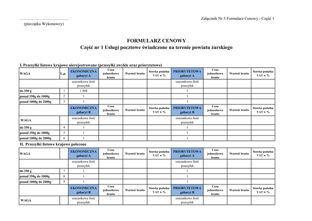 ………………………………………. (pieczątka Wykonawcy) Załącznik Nr 3 Formularz Cenowy - Część 1 FORMULARZ CENOWY Część nr 1 Usługi pocztowe świadczone na terenie powiatu żarskiego I. Przesyłki listowe krajowe nierejestrowane (przesyłki zwykłe oraz priorytetowe) WAGA L.p. EKONOMICZNA gabaryt A Cena jednostkowa brutto Wartość brutto Stawka podatku VAT w % PRIORYTETOWA gabaryt A szacunkowa ilość przesyłek szacunkowa ilość przesyłek do 350 g 1 1 888 1 ponad 350g do 1000g 2 1 1 ponad 1000g do 2000g 3 1 EKONOMICZNA gabaryt B WAGA Cena jednostkowa brutto Wartość brutto Stawka podatku VAT w % Cena jednostkowa brutto Wartość brutto Stawka podatku VAT w % Cena jednostkowa brutto Wartość brutto Stawka podatku VAT w % Cena jednostkowa brutto Wartość brutto Stawka podatku VAT w % 1 Cena jednostkowa brutto Wartość brutto Stawka podatku VAT w % PRIORYTETOWA gabaryt B szacunkowa ilość przesyłek szacunkowa ilość przesyłek do 350 g 4 1 1 ponad 350g do 1000g 5 1 1 ponad 1000g do 2000g 6 1 1 II. Przesyłki listowe krajowe polecone EKONOMICZNA gabaryt A WAGA Cena jednostkowa brutto Wartość brutto Stawka podatku VAT w % PRIORYTETOWA gabaryt A szacunkowa ilość przesyłek szacunkowa ilość przesyłek do 350 g 7 1 1 ponad 350g do 1000g 8 1 1 ponad 1000g do 2000g 9 1 EKONOMICZNA gabaryt B WAGA szacunkowa ilość przesyłek 1 Cena jednostkowa brutto Wartość brutto Stawka podatku VAT w % PRIORYTETOWA gabaryt B szacunkowa ilość przesyłek do 350 g 10 1 1 ponad 350g do 1000g 11 1 1 ponad 1000g do 2000g 12 1 1 III. Przesyłki listowe krajowe polecone z usługą "zwrotne potwierdzenie odbioru" EKONOMICZNA gabaryt A WAGA Cena jednostkowa brutto Wartość brutto Stawka podatku VAT w % PRIORYTETOWA gabaryt A szacunkowa ilość przesyłek szacunkowa ilość przesyłek do 350 g 13 14 698 10 ponad 350g do 1000g 14 1 1 ponad 1000g do 2000g 15 1 EKONOMICZNA gabaryt B WAGA Cena jednostkowa brutto Wartość brutto Stawka podatku VAT w % Cena jednostkowa brutto Wartość brutto Stawka podatku VAT w % Cena jednostkowa brutto Wartość brutto Stawka podatku VAT w % Cena jednostkowa brutto Wartość brutto Stawka podatku VAT w % 1 Cena jednostkowa brutto Wartość brutto Stawka podatku VAT w % PRIORYTETOWA gabaryt B szacunkowa ilość przesyłek szacunkowa ilość przesyłek do 350 g 16 1 1 ponad 350g do 1000g 17 1 1 ponad 1000g do 2000g 18 1 1 IV. Przesyłki listowe krajowe z zadeklarowaną wartością EKONOMICZNA gabaryt A WAGA Cena jednostkowa brutto Wartość brutto Stawka podatku VAT w % PRIORYTETOWA gabaryt A szacunkowa ilość przesyłek szacunkowa ilość przesyłek do 350 g 19 1 1 ponad 350g do 1000g 20 1 1 ponad 1000g do 2000g 21 1 EKONOMICZNA gabaryt B WAGA 1 Cena jednostkowa brutto Wartość brutto Stawka podatku VAT w % PRIORYTETOWA gabaryt B szacunkowa ilość przesyłek szacunkowa ilość przesyłek do 350 g 22 1 1 ponad 350g do 1000g 23 1 1 ponad 1000g do 2000g 24 1 1 V. Przesyłki listowe krajowe z zadeklarowaną wartością z usługą "zwrotne potwierdzenie odbioru" EKONOMICZNA gabaryt A WAGA Cena jednostkowa brutto Wartość brutto Stawka podatku VAT w % PRIORYTETOWA gabaryt A szacunkowa ilość przesyłek szacunkowa ilość przesyłek do 350 g 25 1 1 ponad 350g do 1000g 26 1 1 ponad 1000g do 2000g 27 1 EKONOMICZNA gabaryt B WAGA Cena jednostkowa brutto Wartość brutto Stawka podatku VAT w % Cena jednostkowa brutto Wartość brutto Stawka podatku VAT w % Cena jednostkowa brutto Wartość brutto Stawka podatku VAT w % Cena jednostkowa brutto Wartość brutto Stawka podatku VAT w % Cena jednostkowa brutto Wartość brutto Stawka podatku VAT w % 1 Cena jednostkowa brutto Wartość brutto Stawka podatku VAT w % PRIORYTETOWA gabaryt B szacunkowa ilość przesyłek szacunkowa ilość przesyłek do 350 g 28 1 1 ponad 350g do 1000g 29 1 1 ponad 1000g do 2000g 30 1 1 VI. Paczki pocztowe krajowe EKONOMICZNA gabaryt A WAGA Cena jednostkowa brutto Wartość brutto Stawka podatku VAT w % PRIORYTETOWA gabaryt A szacunkowa ilość przesyłek szacunkowa ilość przesyłek do 1 kg 31 1 1 ponad 1 kg do 2 kg 32 1 1 ponad 2 kg do 5 kg 33 1 1 ponad 5 kg do 10 kg 34 1 EKONOMICZNA gabaryt B WAGA 1 Cena jednostkowa brutto Wartość brutto Stawka podatku VAT w % PRIORYTETOWA gabaryt B szacunkowa ilość przesyłek szacunkowa ilość przesyłek do 1 kg 35 1 1 ponad 1 kg do 2 kg 36 1 1 ponad 2 kg do 5 kg 37 1 1 ponad 5 kg do 10 kg 38 1 1 VII. Paczki pocztowe krajowe z usługą "zwrotne potwierdzenie odbioru" WAGA EKONOMICZNA gabaryt A Cena jednostkowa brutto Wartość brutto Stawka podatku VAT w % PRIORYTETOWA gabaryt A szacunkowa ilość przesyłek szacunkowa ilość przesyłek do 1 kg 39 1 1 ponad 1 kg do 2 kg 40 1 1 ponad 2 kg do 5 kg 41 1 1 ponad 5 kg do 10 kg 42 1 EKONOMICZNA gabaryt B WAGA 1 Cena jednostkowa brutto Wartość brutto Stawka podatku VAT w % PRIORYTETOWA gabaryt B szacunkowa ilość przesyłek szacunkowa ilość przesyłek do 1 kg 43 1 1 ponad 1 kg do 2 kg 44 1 1 ponad 2 kg do 5 kg 45 1 1 ponad 5 kg do 10 kg 46 1 1 Cena jednostkowa brutto Wartość brutto Stawka podatku VAT w % Cena jednostkowa brutto Wartość brutto Stawka podatku VAT w % Cena jednostkowa brutto Wartość brutto Stawka podatku VAT w % Cena jednostkowa brutto Wartość brutto Stawka podatku VAT w % VIII. Paczki pocztowe z zadeklarowaną wartością EKONOMICZNA gabaryt A WAGA Cena jednostkowa brutto Wartość brutto Stawka podatku VAT w % PRIORYTETOWA gabaryt A szacunkowa ilość przesyłek szacunkowa ilość przesyłek do 1 kg 47 1 1 ponad 1 kg do 2 kg 48 1 1 ponad 2 kg do 5 kg 49 1 1 ponad 5 kg do 10 kg 50 1 EKONOMICZNA gabaryt B WAGA 1 Cena jednostkowa brutto Wartość brutto Stawka podatku VAT w % PRIORYTETOWA gabaryt B szacunkowa ilość przesyłek szacunkowa ilość przesyłek do 1 kg 51 1 1 ponad 1 kg do 2 kg 52 1 1 ponad 2 kg do 5 kg 53 1 1 ponad 5 kg do 10 kg 54 1 1 IX. Paczki pocztowe z zadeklarowaną wartością z usługą "zwrotne potwierdzenie odbioru" WAGA EKONOMICZNA gabaryt A 