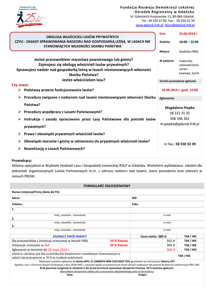 Fundacja Rozwoj u Demokracji Lokal nej Ośrodek Regionalny w Gdańs ku Ul. Gdyńskich Kosynierów 11, 80-866 Gdańsk, Tel.: 58 550 37 00, Fax.: 58 550 32 39 www.gdansk.frdl.pl, [email protected] Zatrudnianie i zwalnianie pracowników zatrudnionych na podstawie wyboru, powołania, OBSŁUGA WŁAŚCICIELI LASÓW PRYWATNYCH umowy o prace oraz kierowników jednostek organizacyjnych gminy” CZYLI - ZASADY SPRAWOWANIA NADZORU NAD GOSPODARKĄ LEŚNĄ W LASACH NIE STANOWIĄCYCH WŁASNOŚCI SKARBU PAŃSTWA Jesteś pracownikiem starostwa powiatowego lub gminy? Zajmujesz się obsługą właścicieli lasów prywatnych? Sprawujesz nadzór nad gospodarką leśną w lasach niestanowiących własności Skarbu Państwa? Jesteś właścicielem lasu? Czy znasz: Podstawy prawne funkcjonowania lasów? Data 23.06.2014 r. Godziny 10:00 – 15:00 Miejsce Siedziba FRDL W pakiecie materiały, zaświadczenia, serwis kawowy, lunch Termin przesyłania zgłoszeń: 16.06.2014 r. godz. 15:00 Procedury związane z nadzorem nad lasami niestanowiącymi własności Skarbu Zgłoszenia: Państwa? Procedury współpracy z Lasami Państwowymi? Instrukcje i zasady opracowane przez Lasy Państwowe dla potrzeb lasów prywatnych? Magdalena Piepke 58 322 25 35 506 546 362 [email protected] Prawa i obowiązki prywatnych właścicieli lasów? Obowiązki starostw i gminy w odniesieniu do prywatnych właścicieli lasów? nr fax.: 58 550 32 39 Nowelizację o Lasach Państwowych? Prowadzący: Główny specjalista w Wydziale Hodowli Lasu i Gospodarki Łowieckiej RDLP w Gdańsku. Wieloletni wykładowca szkoleń dla jednostek organizacyjnych Lasów Państwowych m.in. z zakresu nadzoru nad lasami, stanu posiadania oraz zalesień w ramach PROW. FORMULARZ ZGŁOSZENIOWY Nazwa Instytucji/Firmy (dane do FV): Adres: NIP: Telefon: Faks: 1. Imię, nazwisko , stanowisko e-mail Imię, nazwisko , stanowisko e-mail Imię, nazwisko , stanowisko e-mail 2. 3. ZAZNACZ SWÓJ RABAT! Dla pracowników z instytucji zrzeszonej w forach FRDL Instytucje zrzeszone w ZGP Zgłoszenie w terminie do 19 maja 2014 r. Cena netto: 380 zł 10 % Rabatu 20 % Rabatu 342 zł 304 zł 300 zł Udział w szkoleniu jest dla uczestnika/ów kształceniem zawodowym finansowanym w całości lub przynajmniej w 70 % ze środków publicznych TAK / NIE TAK / NIE TAK / NIE TAK / NIE TAK / NIE Należność zostanie wpłacona do Banku BPH, 21 10600076 0000 3210 0019 7591 przelewem po otrzymaniu faktury VAT Zgodnie z Ust. o Ochronie Danych Osobowych z dnia 29.08.1997 r. wyrażam zgodę na przetwarzanie moich danych osobowych dla potrzeb działalności szkoleniowej FRDL ORG Brak pisemnej rezygnacji ze szkolenia 5 dni przed terminem spowoduje obciążenie Państwa 50 % kosztów ogólnych. Warunkiem otrzymania rabatu jest zaznaczenie odpowiedniego pola na formularzu Data: Podpis: 1. Najważniejsze podstawy prawne dotyczące prowadzenia gospodarki leśnej w lasach niepaństwowych – 30’ 1.1. Podstawy prawne funkcjonowania lasów , w tym lasów nie stanowiących własności Skarbu Państwa. 1.2. Definicje lasu i problemy z tego wynikające 1.3. Regulacje prawne dotyczące gospodarki leśnej w lasach prywatnych (ustawa o lasach, ustawa o ochronie gruntów rolnych i leśnych, ustawa o ochronie przyrody, ustawa o leśnym materiale rozmnożeniowym) 1.4. Prawa i obowiązki prywatnych właścicieli lasów. 2. Kompetencje organów administracji publicznej w zakresie nadzoru nad gospodarka leśną w lasach niepaństwowych - 240’ 2.1. Organizacja nadzoru nad lasami niepaństwowymi 2.2. Narzędzia prawne nadzoru i tryb ich stosowania 2.3. Pomoc państwa dla właścicieli lasów niepaństwowych 2.4. Problem wykonawstwa i finansowania wykonawstwa uproszczonych planów urządzania lasu oraz inwentaryzacji stanu lasu 2.5. Czy sporządzać inwentaryzację stanu lasu ? 2.6. Postępowanie w przypadku niemożności ustalenia właściciela lasu 2.7. Postępowanie w przypadku współwłasności lasu 2.8. Problem dokonywania cięć dewastacyjnych, ich ewidencja i zgłaszanie 2.9. Postępowanie w sprawach o nielegalny wyrąb 2.10. Współpraca z organami ścigania 2.11. Postępowanie administracyjne w starostwie – przygotowanie i wystawianie decyzji 2.12. Postępowania egzekucyjne w administracji na szczeblu starostwa (zasady postępowania egzekucyjnego, właściwość organów w postępowaniu egzekucyjnym, tryb postępowania egzekucyjnego, dokumentacja obowiązująca w postępowaniu egzekucyjnym) 2.13. Obowiązki starostwa i gminy w odniesieniu do prywatnych właścicieli lasów. 3. Powierzanie nadzoru jednostkom organizacyjnym LP - 30’ 3.1. Po co starostwom zlecanie Lasom Państwowym nadzoru nad lasami niepaństwowymi 3.2. Współpraca Nadleśnictw z organami administracji publicznej oraz innymi instytucjami w sprawach dotyczących lasów niepaństwowych 3.3. Wykorzystanie instrukcji i zasad opracowanych przez LP dla potrzeb lasów prywatnych 4. Zagadnienia ważne dla przyszłości lasów prywatnych w Polsce – 30’ 4.1. Planowanie przestrzenne – znaczenie dla lasów prywatnych, ochrona gruntów rolnych i leśnych 4.2. Powszechna ewidencja gruntów , przekwalifikowania gruntów 4.3. Nowelizacja Ustawy o Lasach 4.4. Lasy prywatne a środki unijne 5. Aktualna sytuacja stowarzyszeń właścicieli lasów prywatnych – 10’ Dodatki dla uczestników: Metodyka zajęć – wykład ze stosowaniem prezentacji multimedialnych z elementami seminarium i konwersatorium Krótkie ćwiczenia dla uczestników Przykłady formularzy Kontakt poszkoleniowy