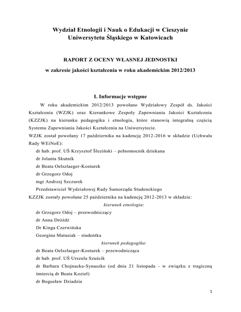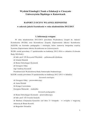 Wydział Etnologii i Nauk o Edukacji w Cieszynie Uniwersytetu Śląskiego w Katowicach RAPORT Z OCENY WŁASNEJ JEDNOSTKI w zakresie jakości kształcenia w roku akademickim 2012/2013 I. Informacje wstępne W roku akademickim 2012/2013 powołano Wydziałowy Zespół ds. Jakości Kształcenia (WZJK) oraz Kierunkowe Zespoły Zapewniania Jakości Kształcenia (KZZJK) na kierunku pedagogika i etnologia, które stanowią integralną częścią Systemu Zapewniania Jakości Kształcenia na Uniwersytecie. WZJK został powołany 17 października na kadencję 2012-2016 w składzie (Uchwała Rady WEiNoE): dr hab. prof. UŚ Krzysztof Śleziński – pełnomocnik dziekana dr Jolanta Skutnik dr Beata Oelszlaeger-Kosturek dr Grzegorz Odoj mgr Andrzej Szczurek Przedstawiciel Wydziałowej Rady Samorządu Studenckiego KZZJK zostały powołane 25 października na kadencję 2012-2013 w składzie: kierunek etnologia: dr Grzegorz Odoj – przewodniczący dr Anna Dróżdż Dr Kinga Czerwińska Georgina Matusiak – studentka kierunek pedagogika: dr Beata Oelszlaeger-Kosturek – przewodnicząca dr hab. prof. UŚ Urszula Szuścik dr Barbara Chojnacka-Synaszko (od dnia 21 listopada - w związku z tragiczną śmiercią dr Beata Kozieł) dr Bogusław Dziadzia 1 dr Sylwia Wrona Dominika Krym - studentka W dniu 5 marca 2013 roku, w związku z usprawnieniem prac oraz wykonaniem zadań nałożonych na KZZJK zostały powołane dodatkowe osoby na kadencję 2012 -2013: kierunek etnologia: prof. zw. dr hab. Halina Rusek dr hab. Rastislava Stolićna dr hab. prof. UŚ Jan Kajfosz kierunek pedagogika: prof. zw. dr hab. Katarzyna Olbrycht dr hab. prof. UŚ Ewa Ogrodzka-Mazur dr hab. prof. UŚ Alina Szczurek-Boruta dr hab. prof. UŚ Eugenia Smyrnova-Trybulska dr hab. prof. UŚ Andrzej Murzyn Po powołaniu WZJK i KZZJK przystąpiono do opracowywania Wewnętrznego Sytemu Zapewniania Jakości Kształcenia (WSZJK). W tym względzie opracowano i przyjęto harmonogram prac WZJK (na zebraniu WZJK w dniu 14 listopada 2012 r.) oraz podjęto konsultacje z wszystkimi podmiotami wewnętrznymi Wydziału Etnologii i Nauk o Edukacji w budowaniu WSZJK. W wyniku podjętych prac 19 grudnia 2012 roku można było na zebraniu WZJK przedstawić i przedyskutować m.in.: zadania dla WSZJK oraz KSZJK (Kierunkowy System Zapewniania Jakości Kształcenia), opracowaną strukturę WSZJK oraz opracowany zestaw procedur WSZJK. Na kolejnych zebraniach WZJK (dnia 30 stycznie 2013 r. i 6 lutego 2013 r.) doprecyzowywano WSZJK. Dniu 20 lutego 2013 roku, po konsultacjach z podmiotami wewnętrznymi Wydziału i Minimum Kadrowym na kierunku etnologia i pedagogika opracowany dokument WSZJK został przedłożony Radzie Wydziału, która go przyjęła – Uchwała Nr 15 Rady Wydziału Etnologii i Nauk o Edukacji z dnia 20 lutego 2013 roku. Należy dodać, że równolegle z pracami nad WSZJK trwały prace nad strategią rozwoju Wydziału. Dnia 20 lutego 2013 roku Rada Wydziału przyjęła dokument: Strategia Rozwoju Wydziału Etnologii i Nauk o Edukacji na lata 2012-2020 (Uchwała Nr 14). WSZJK objęci zostali studenci wszystkich poziomów i form studiów na 2 kierunkach prowadzonych przez Wydział, pracownicy Wydziału uczestniczący w procesie kształcenia oraz pozostałe podmioty związane z realizacją procesu kształcenia na Wydziale. Po przyjęciu WSZJK przez Radę Wydziału, opracowano i przyjęto harmonogram realizacji zadań WSZJK w semestrze letnim 2012-2013 oraz rozpoczęto wdrażać procedury systemu. II. Działania na rzecz jakości kształcenia 1. Doskonalenie programów kształcenia i jego efektów a) Zakres zmian i modyfikacji programów kształcenia dla kierunków etnologia i pedagogika dokonanych w roku akademickim 2012/13 w ramach procesu podnoszenia jakości kształcenia na Wydziale Etnologii i Nauk o Edukacji: - dokonano modernizacji efektów kształcenia na kierunku pedagogika (Uchwała Nr 26 i Nr 27 Rady Wydziału Etnologii i Nauk o Edukacji z dnia 27 marca 2013 roku); - opracowano projekt realizacji zajęć w ramach tzw. pasm wydziałowych z oceną możliwości wdrożenia (jednolite pasma wykładowe nie mogą być aktualnie zrealizowane ze względu na brak sal wykładowych dla dużej grupy studentów, wprowadzenie pasm w proponowanej formie możliwe jest po wyko naniu remontu auli akademickiej); - do programu kształcenia na studiach stacjonarnych i niestacjonarnych II stopnia, na kierunkach etnologia i pedagogika wprowadzono moduły do wyboru w języku angielskim (Uchwała Nr 58 Rady Wydziału Etnologii i Nauk o Edukacji z dnia 26 czerwca 2013 roku); - na kierunkach etnologia i pedagogika dokonano modyfikacji programu kształcenia umożliwiając studentom studiów II stopnia osiąganie efektów kształcenia językowego (w obrębie wybranych modułów) zgodnie z Rozporządzeniem Ministra Nauki i Szkolnictwa Wyższego w Sprawie Krajowych Ram Kwalifikacji dla Szkolnictwa Wyższego (Dz.U.Nr 253, poz.1520) oraz Uchwałą Nr 107 Senatu Uniwersytetu Śląskiego z dnia 6 grudnia 2011 r., Załącznik Nr 108; - na kierunku etnologia i pedagogika dokonano zmian w programie kształcenia (obowiązujących od roku akademickiego 2013/2014) w zakresie zgodnym z zapisem ustawy z dnia 27 lipca 2005 roku Prawo o szkolnictwie wyższym Dz. U. Nr 164, poz.1365, z późn. zm. oraz uchwałą nr 123 Senatu Uniwersytetu Śląskiego w 3 Katowicach z dnia 28 maja 2013 r. w sprawie wytycznych dla rad podstawowych jednostek organizacyjnych Uniwersytetu Śląskiego w zakresie planów studiów i programów kształcenia § 1, §4 ust. 2 i 2a (Uchwała Nr 61 Rady Wydziału Etnologii i Nauk o Edukacji z dnia 26 czerwca 2013 roku, Uchwała Nr 62 Rady Wydziału Etnologii i Nauk o Edukacji z dnia 26 czerwca 2013 roku). b) Na kierunku pedagogika zlikwidowano specjalność wychowanie ekologiczne z etyką środowiskową z powodu niskiego poziom zainteresowania specjalnością (Uchwała Nr 17 Rady Wydziału Etnologii i Nauk o Edukacji z dnia 13 marca 2013 roku). W ramach prac grup roboc