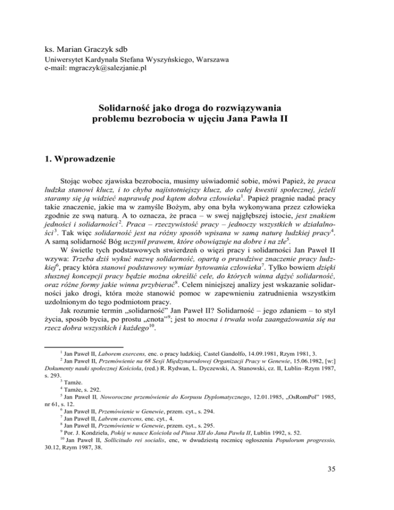 ks. Marian Graczyk sdb Uniwersytet Kardynała Stefana Wyszyńskiego, Warszawa e-mail: [email protected] Solidarność jako droga do rozwiązywania problemu bezrobocia w ujęciu Jana Pawła II 1. Wprowadzenie Stojąc wobec zjawiska bezrobocia, musimy uświadomić sobie, mówi Papież, że praca ludzka stanowi klucz, i to chyba najistotniejszy klucz, do całej kwestii społecznej, jeżeli staramy się ją widzieć naprawdę pod kątem dobra człowieka1. Papież pragnie nadać pracy takie znaczenie, jakie ma w zamyśle Bożym, aby ona była wykonywana przez człowieka zgodnie ze swą naturą. A to oznacza, że praca – w swej najgłębszej istocie, jest znakiem jedności i solidarności 2. Praca – rzeczywistość pracy – jednoczy wszystkich w działalności 3. Tak więc solidarność jest na różny sposób wpisana w samą naturę ludzkiej pracy 4. A samą solidarność Bóg uczynił prawem, które obowiązuje na dobre i na złe5. W świetle tych podstawowych stwierdzeń o więzi pracy i solidarności Jan Paweł II wzywa: Trzeba dziś wykuć nazwę solidarność, opartą o prawdziwe znaczenie pracy ludzkiej6, pracy która stanowi podstawowy wymiar bytowania człowieka7. Tylko bowiem dzięki słusznej koncepcji pracy będzie można określić cele, do których winna dążyć solidarność, oraz różne formy jakie winna przybierać8. Celem niniejszej analizy jest wskazanie solidarności jako drogi, która może stanowić pomoc w zapewnieniu zatrudnienia wszystkim uzdolnionym do tego podmiotom pracy. Jak rozumie termin „solidarność” Jan Paweł II? Solidarność – jego zdaniem – to styl życia, sposób bycia, po prostu „cnota” 9; jest to mocna i trwała wola zaangażowania się na rzecz dobra wszystkich i każdego10. Jan Paweł II, Laborem exercens, enc. o pracy ludzkiej, Castel Gandolfo, 14.09.1981, Rzym 1981, 3. Jan Paweł II, Przemówienie na 68 Sesji Międzynarodowej Organizacji Pracy w Genewie, 15.06.1982, [w:] Dokumenty nauki społecznej Kościoła, (red.) R. Rydwan, L. Dyczewski, A. Stanowski, cz. II, Lublin–Rzym 1987, s. 293. 3 Tamże. 4 Tamże, s. 292. 5 Jan Paweł II, Noworoczne przemówienie do Korpusu Dyplomatycznego, 12.01.1985, „OsRomPol” 1985, nr 61, s. 12. 6 Jan Paweł II, Przemówienie w Genewie, przem. cyt., s. 294. 7 Jan Paweł II, Labrem exercens, enc. cyt., 4. 8 Jan Paweł II, Przemówienie w Genewie, przem. cyt., s. 295. 9 Por. J. Kondziela, Pokój w nauce Kościoła od Piusa XII do Jana Pawła II, Lublin 1992, s. 52. 10 Jan Paweł II, Sollicitudo rei socialis, enc, w dwudziestą rocznicę ogłoszenia Populorum progressio, 30.12, Rzym 1987, 38. 1 2 35 Papież pragnie, aby solidarność stała się podstawą życia społecznego, życia międzynarodowego, życia w skali całego globu ziemskiego 11. W przemówieniu na 58 Sesji Międzynarodowej Organizacji Pracy (Genewa 1982) powiedział: Solidarność świata pracy będzie więc solidarnością, która rozszerza horyzonty, by wraz z interesem jednostek i poszczególnych grup objąć dobro wspólne całej społeczności, tak na płaszczyźnie narodowej, jak i międzynarodowej, i planetarnej. Będzie to więc solidarność dla pracy, która się objawia w walce o sprawiedliwość i prawdę społecznego życia 12. Tak rozumiana solidarność ma na celu nie walkę przeciw innym, lecz walkę o sprawiedliwy ład społeczny [...] musi obalić podstawy nienawiści, egoizmu i niesprawiedliwości [...]. W ramach tej samej wspólnoty pracy solidarność prowadzi raczej do odkrycia wymogów jedności tkwiących w naturze pracy13. W istocie, praca bowiem ze swej natury jednoczy ludzi, tworzy wspólnotę opartą na dialogu, której obce są postawy tworzące zjawisko bezrobocia. Aby jednak przezwyciężyć postawy tworzące zjawisko bezrobocia konieczna jest solidarność, która początek i swoją siłę bierze z natury pracy ludzkiej, a więc z prymatu osoby nad rzeczami, która będzie umiała tworzyć narzędzie dialogu i współpracy, narzędzie pozwalające rozwiązywać sprzeczności bez dążenia do zniszczenia. Podstawowa zasada owej solidarnej działalności mówi, że należy z całą świadomością traktować człowieka nie pod kątem tego, czy jest on użyteczny dla pracy, ale traktować pracę w odniesieniu do człowieka, do każdego człowieka; rozważać pracę ze względu na to, czy jest ona użyteczna lub nieużyteczna dla człowieka14, bo zgodnie z zasadą solidarności praca jest dla człowieka, a nie człowiek dla pracy. Papież wzywa do promocji tak rozumianej solidarności w wymiarze światowym. Konieczne są nowe wybory etyczne; musi ukształtować się nowa świadomość światowa; każdy człowiek [...] musi uważać się za członka tej wielkiej rodziny: wspólnoty światowej 15. Solidarność w ujęciu Papieża posiada wymiar uniwersalny 16, wszyscy bowiem jesteśmy naprawdę odpowiedzialni za wszystkich17. Solidarność jest konieczna, aby odkryć zgodne z naturą znaczenie pracy ludzkiej, wynikające stąd właściwe jej zadania, a zarazem dokonać w oparciu o to odkrycie transformacji rzeczywistości społecznej w kierunku sprawiedliwości. Aby ten zamysł urzeczywistnić Ojciec Święty wzywa do potrójnej solidarności: – do solidarności z ludźmi pracy; – do solidarności z pracą; – i do solidarności ludzi pracy pomiędzy sobą 18. Ukonkretyzowaną według tych założeń rzeczywistość Papież nazywa kulturą pracy19, cywilizacją pracy20, Ewangelią pracy21, cywilizacją solidarności, cywilizacją miłości czło- Por. F. Kampka, Zasada solidarności a działalność związków zawodowych, „Ethos” 1990, nr 11–12, s. 80. Jan Paweł II, Przemówienie w Genewie, przem. cyt., s. 295. 13 Tamże. 14 Tamże. 15 Tamże, s. 296. 16 Por. Jan Paweł II, Przemówienie do świata pracy w Weronie, 17.04.1988, „OsRomPol” 1988, nr 102, s. 13. 17 Jan Paweł II, Sollicitudo resi socialis, enc. cyt., 38. 18 Por. Jan Paweł II, Przemówienie w Genewie, przem. cyt., s. 296; por