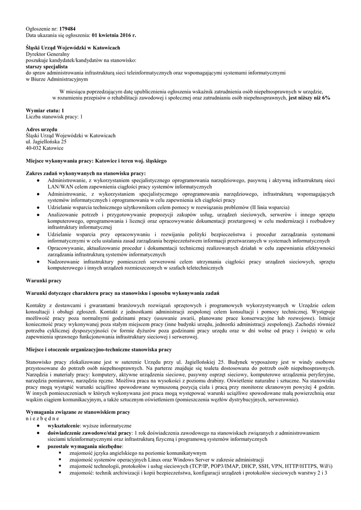 Ogłoszenie nr: 179484 Data ukazania się ogłoszenia: 01 kwietnia 2016 r. Śląski Urząd Wojewódzki w Katowicach Dyrektor Generalny poszukuje kandydatek/kandydatów na stanowisko: starszy specjalista do spraw administrowania infrastrukturą sieci teleinformatycznych oraz wspomagającymi systemami informatycznymi w Biurze Administracyjnym W miesiącu poprzedzającym datę upublicznienia ogłoszenia wskaźnik zatrudnienia osób niepełnosprawnych w urzędzie, w rozumieniu przepisów o rehabilitacji zawodowej i społecznej oraz zatrudnianiu osób niepełnosprawnych, jest niższy niż 6% Wymiar etatu: 1 Liczba stanowisk pracy: 1 Adres urzędu Śląski Urząd Wojewódzki w Katowicach ul. Jagiellońska 25 40-032 Katowice Miejsce wykonywania pracy: Katowice i teren woj. śląskiego Zakres zadań wykonywanych na stanowisku pracy: Administrowanie, z wykorzystaniem specjalistycznego oprogramowania narzędziowego, pasywną i aktywną infrastrukturą sieci LAN/WAN celem zapewnienia ciągłości pracy systemów informatycznych Administrowanie, z wykorzystaniem specjalistycznego oprogramowania narzędziowego, infrastrukturą wspomagających systemów informatycznych i oprogramowania w celu zapewnienia ich ciągłości pracy Udzielanie wsparcia technicznego użytkownikom celem pomocy w rozwiązaniu problemów (II linia wsparcia) Analizowanie potrzeb i przygotowywanie propozycji zakupów usług, urządzeń sieciowych, serwerów i innego sprzętu komputerowego, oprogramowania i licencji oraz opracowywanie dokumentacji przetargowej w celu modernizacji i rozbudowy infrastruktury informatycznej Udzielanie wsparcia przy opracowywaniu i rozwijaniu polityki bezpieczeństwa i procedur zarządzania systemami informatycznymi w celu ustalania zasad zarządzania bezpieczeństwem informacji przetwarzanych w systemach informatycznych Opracowywanie, aktualizowanie procedur i dokumentacji technicznej realizowanych działań w celu zapewniania efektywności zarządzania infrastrukturą systemów informatycznych Nadzorowanie infrastruktury pomieszczeń serwerowni celem utrzymania ciągłości pracy urządzeń sieciowych, sprzętu komputerowego i innych urządzeń rozmieszczonych w szafach teletechnicznych Warunki pracy Warunki dotyczące charakteru pracy na stanowisku i sposobu wykonywania zadań Kontakty z dostawcami i gwarantami branżowych rozwiązań sprzętowych i programowych wykorzystywanych w Urzędzie celem konsultacji i obsługi zgłoszeń. Kontakt z jednostkami administracji zespolonej celem konsultacji i pomocy technicznej. Występuje możliwość pracy poza normalnymi godzinami pracy (usuwanie awarii, planowane prace konserwacyjne lub rozwojowe). Istnieje konieczność pracy wykonywanej poza stałym miejscem pracy (inne budynki urzędu, jednostki administracji zespolonej). Zachodzi również potrzeba cyklicznej dyspozycyjności (w formie dyżurów poza godzinami pracy urzędu oraz w dni wolne od pracy i święta) w celu zapewnienia sprawnego funkcjonowania infrastruktury sieciowej i serwerowej. Miejsce i otoczenie organizacyjno-techniczne stanowiska pracy Stanowisko pracy zlokalizowane jest w suterenie Urzędu przy ul. Jagiellońskiej 25. Budynek wyposażony jest w windy osobowe przystosowane do potrzeb osób niepełnosprawnych. Na parterze znajduje się toaleta dostosowana do potrzeb osób niepełnosprawnych. Narzędzia i materiały pracy: komputery, aktywne urządzenia sieciowe, pasywny osprzęt sieciowy, komputerowe urządzenia peryferyjne, narzędzia pomiarowe, narzędzia ręczne. Możliwa praca na wysokości z poziomu drabiny. Oświetlenie naturalne i sztuczne. Na stanowisku pracy mogą wystąpić warunki uciążliwe spowodowane wymuszoną pozycją ciała i pracą przy monitorze ekranowym powyżej 4 godzin. W innych pomieszczeniach w których wykonywana jest praca mogą występować warunki uciążliwe spowodowane małą powierzchnią oraz wąskim ciągiem komunikacyjnym, a także sztucznym oświetleniem (pomieszczenia węzłów dystrybucyjnych, serwerownie). Wymagania związane ze stanowiskiem pracy niezbędne wykształcenie: wyższe informatyczne doświadczenie zawodowe/staż pracy: 1 rok doświadczenia zawodowego na stanowiskach związanych z administrowaniem sieciami teleinformatycznymi oraz infrastrukturą fizyczną i programową systemów informatycznych pozostałe wymagania niezbędne: znajomość języka angielskiego na poziomie komunikatywnym znajomość systemów operacyjnych Linux oraz Windows Server w zakresie administracji znajomość technologii, protokołów i usług sieciowych (TCP/IP, POP3/IMAP, DHCP, SSH, VPN, HTTP/HTTPS, WiFi) znajomość: technik archiwizacji i kopii bezpieczeństwa, konfiguracji urządzeń i protokołów sieciowych warstwy 2 i 3 znajomość ustaw: o informatyzacji działalności podmiotów realizujących zadania publiczne, o ochronie danych osobowych, o świadczeniu usług drogą elektroniczną, o dostępie do informacji publicznej znajomość rozporządzenia RM ws. Krajowych Ram Interoperacyjności, minimalnych wymagań dla rejestrów publicznych i wymiany informacji w postaci elektronicznej oraz minimalnych wymagań dla systemów teleinformatycznych organizacja pracy i orientacja na osiąganie celów, komunikacja, współpraca wymagania dodatkowe studia podyplomowe z zakresu: administracji systemami Windows/Linux lub administrowania (zarządzania) infrastrukturą sieciową znajomość języka angielskiego na poziomie bardzo dobrym znajomość ustawy o wojewodzie i administracji rządowej w województwie znajomość ustawy o służbie cywilnej w zakresie statusu członka korpusu służby cywilnej znajomość Statutu Śląskiego Urzędu Wojewódzkiego w Katowicach kreatywność, podejmowanie decyzji i odpowiedzialność, radzenie sobie w sytuacjach kryzysowych Wymagane dokumenty i oświadczenia: życiorys i list motywacyjny oświadczenie o wyrażeniu zgody na przetwarzanie danych osobowych do celów rekrutacji oświadczenie o korzystaniu z pełni praw publicznych