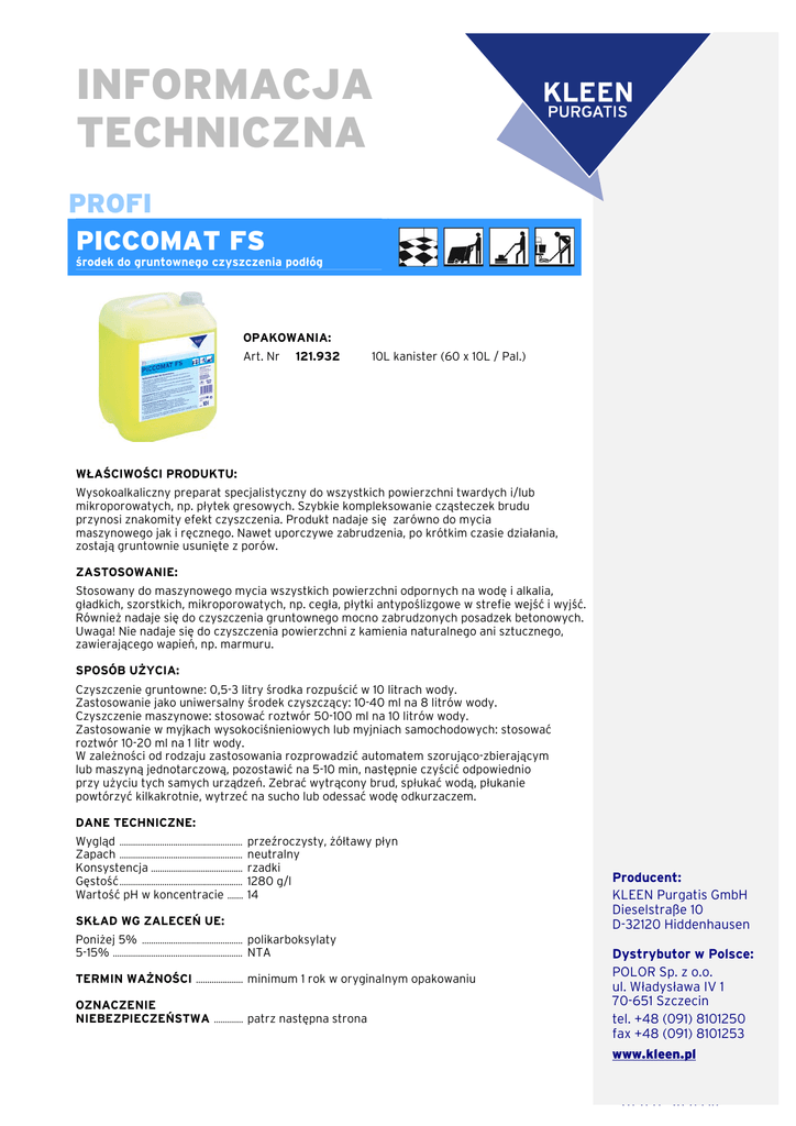 INFORMACJA TECHNICZNA PROFI PICCOMAT FS środek do gruntownego czyszczenia podłóg OPAKOWANIA: Art. Nr 121.932 10L kanister (60 x 10L / Pal.) WŁAŚCIWOŚCI PRODUKTU: Wysokoalkaliczny preparat specjalistyczny do wszystkich powierzchni twardych i/lub mikroporowatych, np. płytek gresowych. Szybkie kompleksowanie cząsteczek brudu przynosi znakomity efekt czyszczenia. Produkt nadaje się zarówno do mycia maszynowego jak i ręcznego. Nawet uporczywe zabrudzenia, po krótkim czasie działania, zostają gruntownie usunięte z porów. ZASTOSOWANIE: Stosowany do maszynowego mycia wszystkich powierzchni odpornych na wodę i alkalia, gładkich, szorstkich, mikroporowatych, np. cegła, płytki antypoślizgowe w strefie wejść i wyjść. Również nadaje się do czyszczenia gruntownego mocno zabrudzonych posadzek betonowych. Uwaga! Nie nadaje się do czyszczenia powierzchni z kamienia naturalnego ani sztucznego, zawierającego wapień, np. marmuru. SPOSÓB UŻYCIA: Czyszczenie gruntowne: 0,5-3 litry środka rozpuścić w 10 litrach wody. Zastosowanie jako uniwersalny środek czyszczący: 10-40 ml na 8 litrów wody. Czyszczenie maszynowe: stosować roztwór 50-100 ml na 10 litrów wody. Zastosowanie w myjkach wysokociśnieniowych lub myjniach samochodowych: stosować roztwór 10-20 ml na 1 litr wody. W zależności od rodzaju zastosowania rozprowadzić automatem szorująco-zbierającym lub maszyną jednotarczową, pozostawić na 5-10 min, następnie czyścić odpowiednio przy użyciu tych samych urządzeń. Zebrać wytrącony brud, spłukać wodą, płukanie powtórzyć kilkakrotnie, wytrzeć na sucho lub odessać wodę odkurzaczem. DANE TECHNICZNE: Wygląd ....................................................... Zapach ....................................................... Konsystencja ......................................... Gęstość ....................................................... Wartość pH w koncentracie ....... przeźroczysty, żółtawy płyn neutralny rzadki 1280 g/l 14 SKŁAD WG ZALECEŃ UE: Poniżej 5% ............................................. polikarboksylaty 5-15% .......................................................... NTA TERMIN WAŻNOŚCI ..................... OZNACZENIE NIEBEZPIECZEŃSTWA ............. minimum 1 rok w oryginalnym opakowaniu patrz następna strona Producent: KLEEN Purgatis GmbH Dieselstraße 10 D-32120 Hiddenhausen Dystrybutor w Polsce: POLOR Sp. z o.o. Producent: ul. Władysława IV 1 KLEENSzczecin Purgatis GmbH 70-651 Dieselstraße 10 tel. +48 (091) 8101250 D-32120 Hiddenhausen fax +48 (091) 8101253 www.kleen.pl Dystrybutor w Polsce: POLOR Sp. z o.o. ul. Władysława IV 1 70-651 Szczecin INFORMACJA TECHNICZNA PICCOMAT FS środek do gruntownego czyszczenia podłóg OZNACZENIE NIEBEZPIECZEŃSTWA .............. Preparat żrący, zawiera powyżej 5% wodorotlenku sodu SYMBOL ZAGROŻENIA: ŻRĄCY Rodzaj zagrożenia: R 35 Powoduje poważne oparzenia Sposób postępowania z preparatem niebezpiecznym: S 1/2 Przechowywać pod zamknięciem i chronić przed dziećmi S 24/25 Unikać zanieczyszczenia skóry i oczu S 26 Zanieczyszczone oczy przemyć natychmiast dużą ilością wody i zasięgnąć porady lekarza S 27 Natychmiast zdjąć całą zanieczyszczoną odzież S 28 Zanieczyszczoną skórę przemyć dużą ilością wody S 36/37/39 Nosić odpowiednią odzież ochronną, odpowiednie rękawice ochronne i okulary lub ochronę twarzy S 45 W przypadku awarii lub złego samopoczucia, niezwłocznie zasięgnąć porady lekarza – jeśli to możliwe pokazać etykietę TRANSPORT Numer UN .................................... 1824 Nazwa produktu ......................... roztwór wodorotlenku sodu Główne zagrożenie .................... 8 Grupa opakowań ......................... II ADR