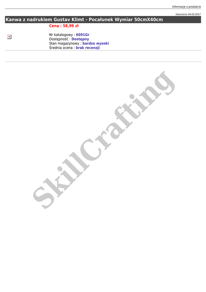 Informacje o produkcie Utworzono 04-03-2017 Kanwa z nadrukiem Gustav Klimt - Pocałunek Wymiar 50cmX40cm Cena : 58,99 zł Sk ill C ra ft in g Nr katalogowy : 6091Gr Dostępność : Dostępny Stan magazynowy : bardzo wysoki Średnia ocena : brak recenzji