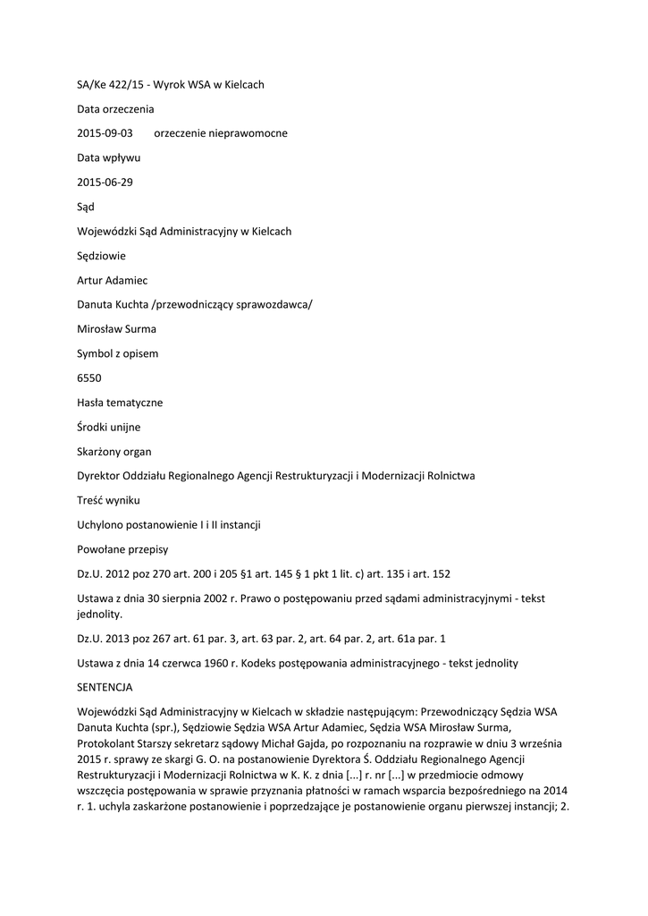 SA/Ke 422/15 - Wyrok WSA w Kielcach Data orzeczenia 2015-09-03 orzeczenie nieprawomocne Data wpływu 2015-06-29 Sąd Wojewódzki Sąd Administracyjny w Kielcach Sędziowie Artur Adamiec Danuta Kuchta /przewodniczący sprawozdawca/ Mirosław Surma Symbol z opisem 6550 Hasła tematyczne Środki unijne Skarżony organ Dyrektor Oddziału Regionalnego Agencji Restrukturyzacji i Modernizacji Rolnictwa Treść wyniku Uchylono postanowienie I i II instancji Powołane przepisy Dz.U. 2012 poz 270 art. 200 i 205 §1 art. 145 § 1 pkt 1 lit. c) art. 135 i art. 152 Ustawa z dnia 30 sierpnia 2002 r. Prawo o postępowaniu przed sądami administracyjnymi - tekst jednolity. Dz.U. 2013 poz 267 art. 61 par. 3, art. 63 par. 2, art. 64 par. 2, art. 61a par. 1 Ustawa z dnia 14 czerwca 1960 r. Kodeks postępowania administracyjnego - tekst jednolity SENTENCJA Wojewódzki Sąd Administracyjny w Kielcach w składzie następującym: Przewodniczący Sędzia WSA Danuta Kuchta (spr.), Sędziowie Sędzia WSA Artur Adamiec, Sędzia WSA Mirosław Surma, Protokolant Starszy sekretarz sądowy Michał Gajda, po rozpoznaniu na rozprawie w dniu 3 września 2015 r. sprawy ze skargi G. O. na postanowienie Dyrektora Ś. Oddziału Regionalnego Agencji Restrukturyzacji i Modernizacji Rolnictwa w K. K. z dnia [...] r. nr [...] w przedmiocie odmowy wszczęcia postępowania w sprawie przyznania płatności w ramach wsparcia bezpośredniego na 2014 r. 1. uchyla zaskarżone postanowienie i poprzedzające je postanowienie organu pierwszej instancji; 2. zasądza od Dyrektora Ś. Oddziału Regionalnego Agencji Restrukturyzacji i Modernizacji Rolnictwa w K. na rzecz G. O. kwotę 200 (dwieście) złotych tytułem zwrotu kosztów postępowania. UZASADNIENIE Uzasadnienie: Dyrektor Ś. Oddziału Regionalnego Agencji Restrukturyzacji Modernizacji Rolnictwa w K. postanowieniem z dnia [...] r. Nr [...] utrzymał w mocy zaskarżone zażaleniem przez G. O. (skarżący, strona) postanowienie Kierownika Biura Powiatowego ARiMR w S. Nr [...] z dnia [...] r. o odmowie wszczęcia postępowania w sprawie przyznania płatności w ramach systemów wsparcia bezpośredniego na rok 2014. W uzasadnieniu postanowienia, organ odwoławczy przedstawił stan faktyczny z którego wynika, że do Biura Powiatowego ARiMR w S. w dniu 13 maja 2014 r. wpłynął wniosek G. O. o przyznanie płatności w ramach systemów wsparcia bezpośredniego na rok 2014. Kierownik Biura Powiatowego ARiMR w S. wezwał skarżącego do usunięcia braków formalnych wniosku - brak podpisu na załącznikach graficznych. W dniu 3 lipca 2014 r. w odpowiedzi na skutecznie doręczone w tym samym dniu wezwanie, G. O. podpisał załączniki graficzne dołączone do wniosku. Kierownik Biura Powiatowego ARiMR w S. postanowieniem z dnia [...] odmówił wszczęcia postępowania w sprawie wniosku strony o przyznanie płatności w ramach systemów wsparcia bezpośredniego na rok 2014. Na przedmiotowe postanowienie skarżący w terminie złożył zażalenie. W wyniku przeprowadzonego postępowania organ odwoławczy wskazał, że szczegółowe warunki i tryb udzielania płatności do gruntów rolnych na rok 2014 określają przepisy ustawy z dnia 26 stycznia 2007 r. o płatnościach w ramach systemów wsparcia bezpośredniego (Dz. U. z 2012 r., poz. 1164, ze zm.), dalej zwana ,,u.p.w.b." wraz z wydanymi na jej podstawie aktami wykonawczymi oraz przepisy unijne m. in. Rozporządzenie Komisji (WE) Nr 1122/2009 z dnia 30 listopada 2009 r. ustanawiające szczegółowe zasady wykonania rozporządzenia Rady (WE) nr 73/2009 odnośnie do zasady wzajemnej zgodności, modulacji oraz zintegrowanego systemu zarządzania i kontroli w ramach systemów wsparcia bezpośredniego przewidzianych w wymienionym rozporządzeniu oraz wdrażania rozporządzenia Rady (WE) nr 1234/2007 w odniesieniu do zasady wzajemnej zgodności w ramach systemu wsparcia ustanowionego dla sektora wina (Dz. Urz. UE L 316 z 02.12.2009, str. 65 ze zm.).Organ odwoławczy podkreślił, że wnioski o przyznanie płatności zgodnie z określonym w art. 18 ust. 1-3 w/w ustawy terminie składa się od dnia 15 marca do dnia 15 maja i termin ten nie podlega przywróceniu. Wskazał również, że stosownie do art. 23 ust. 1 akapit 1 Rozporządzenia Komisji (WE) Nr 1122/2009 wniosek o przyznanie przedmiotowych płatności może zostać złożony w terminie 25 dni kalendarzowych po terminie składania wniosków, jednak opóźnienie powoduje zmniejszenie kwot płatności o 1% za każdy dzień roboczy. Zasada ta ma zastosowanie do dokumentów, umów oraz oświadczeń, które należy przedstawić właściwym organom zgodnie z art. 12 i 13 tego Rozporządzenia, jeśli takie dokumenty, umowy lub oświadczenia stanowią o kwalifikowalności do przedmiotowej pomocy. Jeśli opóźnienie wynosi ponad 25 dni kalendarzowych, wniosek uznaje się za niedopuszczalny. Dalej organ argumentował, że zgodnie z art. 23 ust. 2 akapit 1 i 2 rozporządzenia Komisji (WE) Nr 1122/2009, z wyjątkiem przypadków siły wyższej oraz okoliczności nadzwyczajnych o których mowa w art. 75, złożenie poprawki do pojedynczego wniosku po ostatecznym terminie, prowadzi do zmniejszenia kwot płatności odnoszących się do faktycznego użytkowania przedmiotowych działek rolnych o 1 % za każdy dzień roboczy. Poprawki do pojedynczego wniosku uwzględnia się wyłącznie, jeśli wnoszone są przed ostatecznym terminem składania pojedynczych wniosków, jak określono w ust. 1 akapit trzeci. Jeśli jednak termin jest wcześniejszy lub taki sam jak ostateczny termin przewidziany w art. 14 ust. 2, poprawki do pojedynczego wniosku uznaje się za niedopuszczalne określonym w art. 14 ust. 2. Mając na względzie art. 12 ust. 1 lit. d Rozporządzenia Nr 1122/2009, czyli fakt, że wniosek winien zawierać szczegóły pozwalające na identyfikację wszystkich działek rolnych w gospodarstwie, ich powierzchnię wyrażoną w hektarach z dokładnością do dwóch miejsc po przecinku, ich położenie 