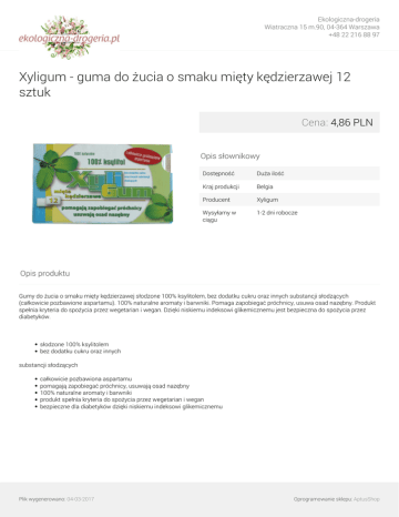 Ekologiczna-drogeria Wiatraczna 15 m.90, 04-364 Warszawa +48 22 216 88 97 Xyligum - guma do żucia o smaku mięty kędzierzawej 12 sztuk Cena: 4,86 PLN Opis słownikowy Dostępność Duża ilość Kraj produkcji Belgia Producent Xyligum Wysyłamy w ciągu 1-2 dni robocze Opis produktu Gumy do żucia o smaku mięty kędzierzawej słodzone 100% ksylitolem, bez dodatku cukru oraz innych substancji słodzących (całkowicie pozbawione aspartamu). 100% naturalne aromaty i barwniki. Pomaga zapobiegać próchnicy, usuwa osad nazębny. Produkt spełnia kryteria do spożycia przez wegetarian i wegan. Dzięki niskiemu indeksowi glikemicznemu jest bezpieczna do spożycia przez diabetyków. słodzone 100% ksylitolem bez dodatku cukru oraz innych substancji słodzących całkowicie pozbawiona aspartamu pomagają zapobiegać próchnicy, usuwają osad nazębny 100% naturalne aromaty i barwniki produkt spełnia kryteria do spożycia przez wegetarian i wegan bezpieczne dla diabetyków dzięki niskiemu indeksowi glikemicznemu Plik wygenerowano: 04-03-2017 Powered by TCPDF (www.tcpdf.org) Oprogramowanie sklepu: AptusShop