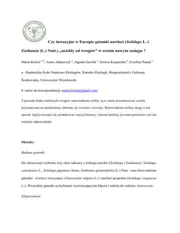 Czy inwazyjne w Europie gatunki nawłoci (Solidago L. i Euthamia (L.) Nutt.) „uciekły od wrogów” w swoim nowym zasięgu ? Maria Kolon a, b, Anna Adamczyk a, Jagoda Gawlik a, Sylwia Kacperska a, Ewelina Panek a a –Studenckie Koło Naukowe Ekologów, Katedra Ekologii, Biogeochemii i Ochrony Środowiska, Uniwersytet Wrocławski b -autor do korespondencji [email protected] Z powodu braku rodzimych wrogów wprowadzone rośliny są w stanie przemieszczać zasoby przeznaczone na mechanizmy obronne, do wzrostu i rozwoju. Wprowadzone rośliny mogą w ten sposób lepiej rozwijać się, produkować więcej biomasy i dawać bardziej żywotne potomstwo niż ich rodzime odpowiedniki. Metody: Badane gatunki: Do obserwacji wybrano trzy obce taksony z rodzaju nawłoć (Solidago i Euthamia): Solidago canadensis L., Solidago gigantea Aiton, Euthamia graminifolia (L.) Nutt. oraz dwa rodzime gatunki: wrotycz zwyczajny (Tanacetum vulgare L.) i nawłoć pospolita (Solidago virgaurea L.). Wszystkie gatunki są bylinami wytwarzającymi kłącza i należą do rodziny Asteraceae. Eksperyment: Doświadczenie założono w Stacji Doświadczalnej Uniwersytetu Przyrodniczego we Wrocławiu (południowozachodnia Polska, środkowa Europa 51°6’54 N, 17°7’42 E), położonej na wysokości 115 m n.p.m. Średnia temperatura roczna w miejscu badań wynosi 9°C (lipiec 18,8, styczeń -0,4). Rośliny rosły w pełnym nasłonecznieniu. Do doświadczenia użyta została lokalna gleba użytkowana rolniczo Parametry chemiczne podłoża przedstawia tabela 1. Tab.1 Właściwości chemiczne podłoży użytych w eksperymencie. Oznaczenie pH w H2O pH w KCL N g / kg P mg /kg 6,90 6,50 0,52 155,37 K mg /kg Mg mg/kg 113,33 46,87 %C 0,78 Rośliny były sadzone w plastikowych doniczach o wymiarach 22 x 25. Donice umieszczono w odstępach, aby uniknąć oddziaływania roślin z sąsiednich pojemników. Rośliny sadzono w terminie 11 – 12 maja 2015 roku. W obrębie każdego gatunku badano 2 klony (młode ramety pochodzące z jednej kępy). Klon w obrębie zabiegu był repreze4ntowany przez 4 ramety. Zastosowano dwa zabiegi: oprysk środkiem owadobójczym (Mospilan 20 SP, producent NIPPON SODA Co Ltd.), i środkiem grzybobójczym (Topsin M 500 SC, producent NIPPON SODA Co Ltd.). Oprysków dokonywano co miesiąc, od 15 czerwca do 15 września. W trakcie sezonu wegetacyjnego rośliny podlewano i odchwaszczano. Pomiarów dokonano 18 września 2015 roku. Termin pomiarów został wybrany na podstawie wcześniejszych obserwacji, które wskazują, że w tym okresie rośliny osiągają maksimum biomasy (Szymura i Szymura 2014). Mierzono wysokość roślin, określano liczbę ramet oraz kwitnienie (1-rośliny kwitnące, 0-brak kwitnienia). Metody statystyczne: Do zbadania istotności różnic pomiędzy średnimi wysokościami i liczbą ramet roślin rosnących na różnych podłożach zastosowano test Anova rang Kruskala-Wallisa. Aby porównać zmienność pomiędzy gatunkami obliczono współczynnik zmienności, istotność jego zróżnicowania pomiędzy taksonami testowano również Anovą rang. Wyniki Wyniki pomiarów i rezultaty testów statystycznych przedstawiono w tabelach 2, 3 i 4, W tabelach i na rysunkach użyto następujących skrótów:; S.can - Solidago canadensis L.; S.gig - Solidago gigantea Aiton; E.gram - Euthamia graminifolia (L.) Nutt.; S.virg - Solidago virgaurea L.; T.v. - Tanacetum vulgare L. Tab. 2 Średnie (średn.) wysokości, odchylenia standardowe (S.D) i wyniki testów statystycznych (H i p) ramet badanych gatunków S. can S. gig E. gram S. virg T.v. Std. Średnia Std. Średnia Std. Średnia Std. Średnia Std. 82 24 73 20 49 6 55 11 48 10 69 27 73 20 52 13 61 12 56 13 94 17 71 16 49 5 61 10 55 7 H=3,643 p=,0161 H=0,167 p=0,919 H=0,380 p=0,826 H=2,645 p =0,266 H=2,328 p=0,3122 Średnia G K O Tab. 3 Średnie (średn.) liczby pędów, odchylenia standardowe (S.D) i wyniki testów statystycznych (H i p) ramet badanych gatunków S. can S. gig E. gram S. virg T.v. Std. Średnia Std. Średnia Std. Średnia Std. Średnia Std. 1,0 0,0 2,5 2,1 1,0 0,0 1,9 1,1 2,0 0,9 1,3 0,5 3,3 2,6 1,1 0,4 2,3 1,8 3,4 1,1 1,1 0,4 2,9 3,2 1,0 0,0 1,9 0,8 2,8 0,7 H=0,000 p=1,000 H=4,017 p=,7777 H=0,000 p=1,000 H=0,000 p=1,000 H=0,000 p=1,000 Średnia G K O Tab. 4 Frekwencja statystyczna osobników kwitnących G K O Sc 75% 29% 75% Sgig 88% 88% 63% Sgr 100% 100% 88% Sv 100% 100% 100% Tv 100% 100% 100%