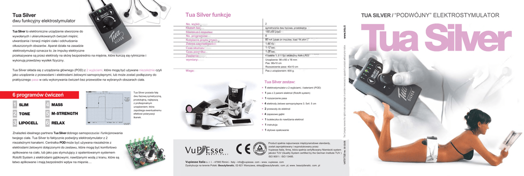 Tua Silver funkcje Tua Silver dwu funkcyjny elektrostymulator TUA SILVER / “PODWÓJNY” ELEKTROSTYMULATOR 2 wykonują prawdziwy wysiłek fizyczny. No. wyjść: Kształt fali: Szerokość impulsu: No. programów: Natężenie prądu (max): Zakres częstotliwości: Czas skurczu: Czas powrotu: Zasilanie: wymiary: Tua Silver składa się z urządzenia głównego (POD) z 2 wyjściami, które mogą być używane niezależnie czyli Waga: Pas z urządzeniem: 600 g. Tua Silver to elektroniczne urządzenie stworzone do wywołanych i ukierunkowanych ćwiczeń mięśni; utwardzania i tonacji mięśni ciała i odchudzania otłuszczonych obszarów. Aparat działa na zasadzie elektrostymulacji oznacza to; że impulsy elektryczne przekazywane są przez elektrody na skórę bezpośrednio na mięśnie, które kurczą się rytmicznie i symetryczna dwu fazowa, prostokątna 150-200 pSec 6 80 mA (peak on impulse, load 1K ohm ) 1-80 Hz 1-12 sec. 1-25 sec. 4 baterie 1. 5 V typ alkaliczny AAA-LR03 Urządzenie: 98 x 60 x 18 mm Pas: 98x10 cm Rozszerzenie pasa: 40x10 cm jako urządzenie z przewodami i elektrodami żelowymi samoprzylepnymi, lub może zostać podłączony do praktycznego pasa w celu wykonywania ćwiczeń bez przewodów na wybranych obszarach ciała. Tua Silver zestaw: 1 elektrostymulator z 2 wyjściami, i bateriami (POD) 6 programów ćwiczeń Tua Silver posiada falę dwu fazową symetryczną, prostokątną, najlepszą z profesjonalnym urządzeniem; która zapobiega ewentualnemu efektowi polaryzacji tkanek. 1 pas z 2 parami elektrod (Rotofit system) 1 rozszerzenie pasa 4 elektrody żelowe samoprzylepne 3. 5x4. 5 cm 2 przewody do elektrod 4 zapasowe gąbki 1 buteleczka do nawilżania elektrod 1 instrukcja 1 stylowe opakowanie Znalazłeś idealnego partnera Tua Silver dobrego samopoczucia i funkcjonowania twojego ciała. Tua Silver to faktycznie podwójny elektrostymulator z 2 niezależnymi kanałami. Centralka POD może być używana niezależnie z elektrodami żelowymi dołączonymi do zestawu, które mogą być komfortowo aplikowane na ciało, lub jako pas stymulujący z opatentowanym systemem Rotofit System z elektrodami gąbkowymi, nawilżanymi wodą z kranu, które są łatwo aplikowane i mają bezpośredni wpływ na mięsnie.... Product spełnia najsurowsze międzynarodowe standardy, został zaprojektowany i wyprodukowany przez Vupiesse Italia, firmę, która spełnia certyfikowany Niemiecki system jakości TUV (Quality System certified by the German Institute TUV ) ISO 9001 i ISO 13485. Vupiesse Italia s. r. l. - 47900 Rimini - Italy - info@vupiesse. com - www. vupiesse. com Dystrybucja na terenie Polski: Beautyfanatic, 02-821 Warszawa, sklep@beautyfanatic. com. pl, www. beautyfanatic. com. pl ... w ułamku sekundy Tua Silver staje się podręcznym elektrostymulatorem z 2 niezależnym wyjściami. Do zwalczania zlokalizowanego cellulitu, wyszczuplanie i tonacja ud. Światowy patent najbardziej "oryginalny" sposób na ukształtowanie twojego ciała, dzięki opatentowanemu światowemu systemowi Rotofit System®. Na odchudzanie, tonację i spłaszczanie brzucha Do ukierunkowanych ćwiczeń całego ciała takie jak mięsień piersiowy, biceps, triceps, plecy, itp... Do ujędrniania, kształtowania i skutecznego podnoszenia pośladków Prosty i całkowicie mobilny system pozwalający na umieszczenie i dokładne dopasowanie elektrod na wszystkich grupach mięśni i konformacjach fizycznych 2 niezależene wyjścia Odległość między elektrodami może być regulowana. Obracanie elektrod Elektrody każdej pary można przesuwać po klipie do przodu i do tyłu tak aby zmieniać odległość; bliżej lub dalej od siebie. Przesuwane elektrody można obracać wokół własnej osi pod dowolnym kątem. “Podwójny” elektrostymulator: Pas Rotofit system + aparat podręczny