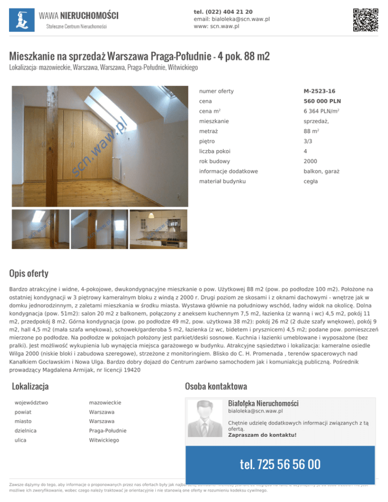 tel. (022) 404 21 20 email: [email protected] www: scn.waw.pl Mieszkanie na sprzedaż Warszawa Praga-Południe - 4 pok. 88 m2 Lokalizacja: mazowieckie, Warszawa, Warszawa, Praga-Południe, Witwickiego numer oferty M-2523-16 cena 560 000 PLN cena m 6 364 PLN/m2 mieszkanie sprzedaż, metraż 88 m2 piętro 3/3 liczba pokoi 4 rok budowy 2000 informacje dodatkowe balkon, garaż materiał budynku cegła 2 Opis oferty Bardzo atrakcyjne i widne, 4-pokojowe, dwukondygnacyjne mieszkanie o pow. Użytkowej 88 m2 (pow. po podłodze 100 m2). Położone na ostatniej kondygnacji w 3 piętrowy kameralnym bloku z windą z 2000 r. Drugi poziom ze skosami i z oknami dachowymi - wnętrze jak w domku jednorodzinnym, z zaletami mieszkania w środku miasta. Wystawa głównie na południowy wschód, ładny widok na okolicę. Dolna kondygnacja (pow. 51m2): salon 20 m2 z balkonem, połączony z aneksem kuchennym 7,5 m2, łazienka (z wanną i wc) 4,5 m2, pokój 11 m2, przedpokój 8 m2. Górna kondygnacja (pow. po podłodze 49 m2, pow. użytkowa 38 m2): pokój 26 m2 (2 duże szafy wnękowe), pokój 9 m2, hall 4,5 m2 (mała szafa wnękowa), schowek/garderoba 5 m2, łazienka (z wc, bidetem i prysznicem) 4,5 m2; podane pow. pomieszczeń mierzone po podłodze. Na podłodze w pokojach położony jest parkiet/deski sosnowe. Kuchnia i łazienki umeblowane i wyposażone (bez pralki). Jest możliwość wykupienia lub wynajęcia miejsca garażowego w budynku. Atrakcyjne sąsiedztwo i lokalizacja: kameralne osiedle Wilga 2000 (niskie bloki i zabudowa szeregowe), strzeżone z monitoringiem. Blisko do C. H. Promenada , terenów spacerowych nad Kanałkiem Gocławskim i Nowa Ulga. Bardzo dobry dojazd do Centrum zarówno samochodem jak i komuniakcją publiczną. Pośrednik prowadzący Magdalena Armijak, nr licencji 19420 Lokalizacja Osoba kontaktowa Białołęka Nieruchomości województwo mazowieckie powiat Warszawa [email protected] miasto Warszawa dzielnica Praga-Południe ulica Witwickiego Chętnie udzielę dodatkowych informacji związanych z tą ofertą. Zapraszam do kontaktu! tel. 725 56 56 00 Zawsze dążymy do tego, aby informacje o proponowanych przez nas ofertach były jak najbardziej dokładne. Niekiedy jednak, ze względu na fakt, iż uzyskujemy je od osób trzecich nie jest możliwe ich zweryfikowanie, wobec czego należy traktować je orientacyjnie i nie stanowią one oferty w rozumieniu kodeksu cywilnego.
