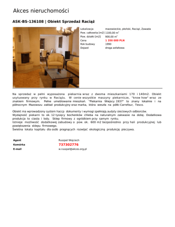 Akces nieruchomości ASK-BS-136108 | Obiekt Sprzedaż Raciąż Lokalizacja mazowieckie, płoński, Raciąż, Zawada Pow. całkowita [m2] 1100,00 m2 Pow. działki [m2] 900,00 m2 Cena 1 350 000 PLN Rok budowy 1990 Dojazd droga asfaltowa Na sprzedaż w pełni wyposażona piekarnia wraz z dwoma mieszkaniami 170 i 140m2. Obiekt usytuowany przy rynku w Raciążu. W cenie wszystkie maszyny piekarnicze, "know how" wraz ze znakiem firmowym. Pełne umeblowanie mieszkań. "Piekarnia Wiejscy 1937" to znany lokalnie i na północnym Mazowszu zakład produkcyjny oraz marka, która weszła na półki Carrefour, Tesco. Obiekt ma wprowadzony system haccp dokumenty i wymogi spełniają audyty sieciowych odbiorców. Wydajność piekarni to ok. 12 tysięcy bochenków chleba na naturalnym zakwasie na dobę. Dodatkowa produkcja to ciasta i lody. Sklep firmowy z ogródkiem przy samym rynku. Istnieje możliwość dodatkowej zabudowy o pow. ok. 600 m2 bezpośrednio przy hali produkcyjnej lub powiększenia sklepu firmowego. Świetna lokata kapitału dla osób pragnących rozwijać ekologiczną produkcję pieczywa. Agent Ruszpel Wojciech Komórka 737302776 E-mail [email protected]