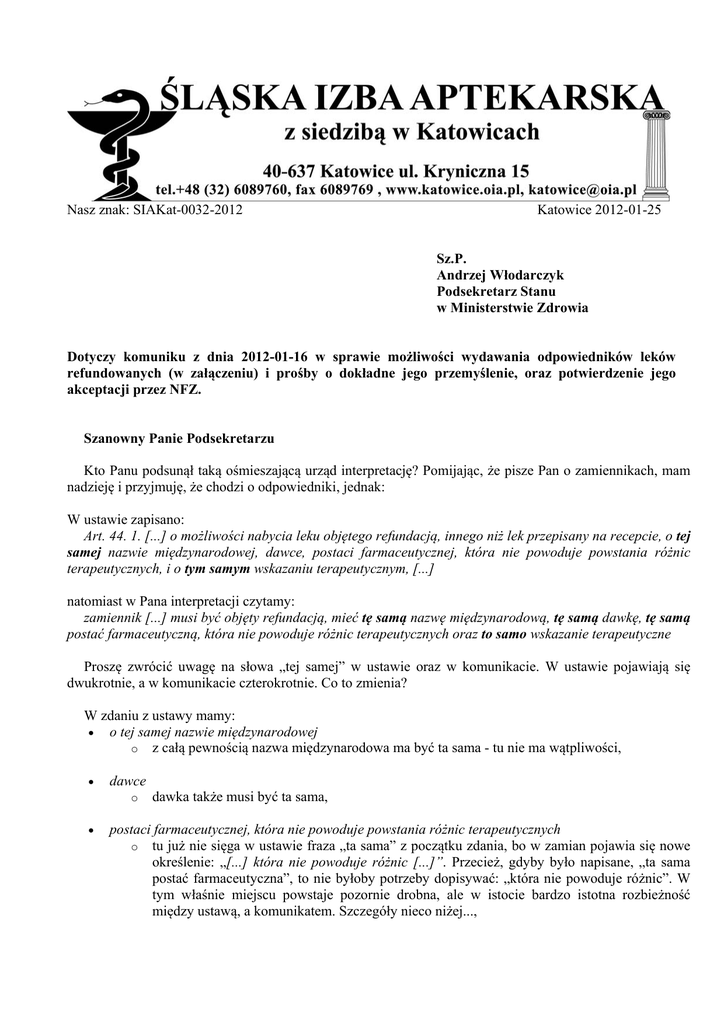 Nasz znak: SIAKat-0032-2012 Katowice 2012-01-25 Sz.P. Andrzej Włodarczyk Podsekretarz Stanu w Ministerstwie Zdrowia Dotyczy komuniku z dnia 2012-01-16 w sprawie możliwości wydawania odpowiedników leków refundowanych (w załączeniu) i prośby o dokładne jego przemyślenie, oraz potwierdzenie jego akceptacji przez NFZ. Szanowny Panie Podsekretarzu Kto Panu podsunął taką ośmieszającą urząd interpretację? Pomijając, że pisze Pan o zamiennikach, mam nadzieję i przyjmuję, że chodzi o odpowiedniki, jednak: W ustawie zapisano: Art. 44. 1. [...] o możliwości nabycia leku objętego refundacją, innego niż lek przepisany na recepcie, o tej samej nazwie międzynarodowej, dawce, postaci farmaceutycznej, która nie powoduje powstania różnic terapeutycznych, i o tym samym wskazaniu terapeutycznym, [...] natomiast w Pana interpretacji czytamy: zamiennik [...] musi być objęty refundacją, mieć tę samą nazwę międzynarodową, tę samą dawkę, tę samą postać farmaceutyczną, która nie powoduje różnic terapeutycznych oraz to samo wskazanie terapeutyczne Proszę zwrócić uwagę na słowa „tej samej” w ustawie oraz w komunikacie. W ustawie pojawiają się dwukrotnie, a w komunikacie czterokrotnie. Co to zmienia? W zdaniu z ustawy mamy: o tej samej nazwie międzynarodowej o z całą pewnością nazwa międzynarodowa ma być ta sama - tu nie ma wątpliwości, dawce o dawka także musi być ta sama, postaci farmaceutycznej, która nie powoduje powstania różnic terapeutycznych o tu już nie sięga w ustawie fraza „ta sama” z początku zdania, bo w zamian pojawia się nowe określenie: „[...] która nie powoduje różnic [...]”. Przecież, gdyby było napisane, „ta sama postać farmaceutyczna”, to nie byłoby potrzeby dopisywać: „która nie powoduje różnic”. W tym właśnie miejscu powstaje pozornie drobna, ale w istocie bardzo istotna rozbieżność między ustawą, a komunikatem. Szczegóły nieco niżej..., o tym samym wskazaniu terapeutycznym o Tu znów komunikat zgadza się z ustawą. Zwracam jedynie uwagę na powtórzenie w ustawie słów "tym samym", co może dodatkowo potwierdzać, że w punkcie dotyczącym postaci farmaceutycznej słowa "ta sama" nie mają zastosowania i właśnie dlatego tu zostały powtórzone. Reasumując: w zakresie postaci farmaceutycznej wydanego zamiennika ustawa wymaga jedynie, by nie powodowała powstania różnic terapeutycznych. Wróćmy teraz do Pana komunikatu. Napisano w nim m. in.: „Zamiennik musi [...] mieć [...] tę samą postać farmaceutyczną, która nie powoduje [...]”. To nie jest interpretacja, tylko przeinaczenie. Dopisano słowa „tę samą”. Czy tabletki, drażetki, kapsułki, itd. ... to ta sama postać? Nie, skoro sam minister w obwieszczeniach używa różnych określeń i nie zastąpił ich jednym wybranym. Jednak ustawa mimo to nakazuje poinformować i - na życzenie pacjenta - wydać taki odpowiednik, o ile różnica postaci nie wywoduje różnic terapeutycznych i tak dotychczas postępowaliśmy w aptekach, co było zgodne z ustawą. Czy Pana komunikat ma zabronić takiej zamiany? W interpretacji w ostatnim akapicie napisano: Niezależnie od powyższego, zgodnie z brzmieniem ust. 2 aptekarz ma obowiązek na żądanie [...] Nie można rozpatrywać ustępu drugiego „niezależnie od powyższego”, ponieważ omawiany zapis sam w swojej treści jest od ustępu pierwszego uzależniony: Art. 44. 2. Osoba wydająca leki [...] ma obowiązek, na żądanie świadczeniobiorcy, wydać lek, o którym mowa w ust. 1, którego cena [...]. A więc ust. 2 jest zależny od pierwszego. Nieco dalej Pan napisał swój wniosek: Takie brzmienie ust. 2 zapewnia możliwość wydania pacjentowi leku, którego cena detaliczna przekracza limit finansowania, ale nie przekracza ceny detalicznej leku przepisanego na recepcie. [...] możliwość [...]??? o ustawa informuje o obowiązku, a nie o możliwości, [...] cena detaliczna przekracza limit [...] o w ustawie ustępie drugi odwołuje się do pierwszego („[...] wydać lek, o którym mowa w ust. 1 [...]”), a w nim mamy m. in. „cena detaliczna nie przekracza limitu”, co Pan dyskretnie w wyciągniętym wniosku odwrócił (pominął słowo „nie”), cena [...] nie przekracza ceny detalicznej [...] o z ustawy: „[...] którego cena detaliczna jest niższa niż cena leku przepisanego [...]” zaś „nie przekracza” oznacza coś innego niż „jest niższa”. W pierwszym przypadku może być równa, w drugim - nie. Zresztą nawet w samym komunikacie w poprzednim zdaniu napisano: „którego cena detaliczna jest niższa niż cena leku przepisanego” czyli słowo w słowo dokładnie tak, jak w ustawie, ale wyciągnięto z tego wniosek, że „cena nie przekracza [...]” W jednym zdaniu trzy istotne różnice semantyczne w porównaniu z ustawą. To ci dopiero (nad)interpretacja! Komunikat MZ nie wskazuje nawet podstawy, na której można oprzeć przypuszczenie, że słowa „o którym mowa w ust. 1” dotyczą jedynie nazwy międzynarodowej, postaci, dawki, ..., ale już nie dotyczą limitu. A wystarczy zauważyć, że cały ustęp pierwszy to pojedyncze zdanie, w którym wymieniono kilka kryteriów, jakie spełniać ma odpowiednik. Są to po kolei: ma być refundowany (czyli musi pochodzić z wykazów), ma być inny niż przepisany (co jest oczywiste i nie wymaga komentarza), ma mieć tę samą nazwę międzynarodową, mieć zgodną lub tę samą postać, tę samą dawkę, to samo wskazanie terapeutyczne (ten zapis też stwarza problemy, ale to raczej temat na osobną dyskusję), cenę nie przekraczającą limitu leku przepisanego oraz cenę nie przekraczającą ceny leku przepisanego. Pan natomiast informuje, że przedostatnia z powyższych cech w ustępie drugim już nie obowiązuje. Uzasadnienia na wszelki wypadek nie podano. Ustawa nie jest wystarczająco jednoznaczna, jednak takie podejście do interpretacji prawa jakie proponuje Podsekretarz w Minis