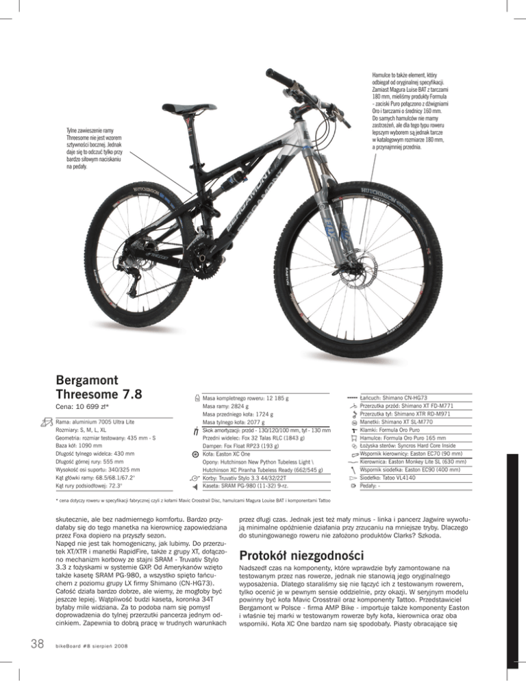 Hamulce to także element, który odbiegał od oryginalnej specyfikacji. Zamiast Magura Luise BAT z tarczami 180 mm, mieliśmy produkty Formula - zaciski Puro połączono z dźwigniami Oro i tarczami o średnicy 160 mm. Do samych hamulców nie mamy zastrzeżeń, ale dla tego typu roweru lepszym wyborem są jednak tarcze w katalogowym rozmiarze 180 mm, a przynajmniej przednia. Tylne zawieszenie ramy Threesome nie jest wzorem sztywności bocznej. Jednak daje się to odczuć tylko przy bardzo siłowym naciskaniu na pedały. Bergamont Threesome 7.8 Cena: 10 699 zł* Rama: aluminium 7005 Ultra Lite Rozmiary: S, M, L, XL Geometria: rozmiar testowany: 435 mm - S Baza kół: 1090 mm Długość tylnego widelca: 430 mm Długość górnej rury: 555 mm Wysokość osi suportu: 340/325 mm Kąt główki ramy: 68.5/68.1/67.2° Kąt rury podsiodłowej: 72.3° Masa kompletnego roweru: 12 185 g Masa ramy: 2824 g Masa przedniego koła: 1724 g Masa tylnego koła: 2077 g Skok amortyzacji: przód - 130/120/100 mm, tył - 130 mm Przedni widelec: Fox 32 Talas RLC (1843 g) Damper: Fox Float RP23 (193 g) Koła: Easton XC One Opony: Hutchinson New Python Tubeless Light \ Hutchinson XC Piranha Tubeless Ready (662/545 g) Korby: Truvativ Stylo 3.3 44/32/22T Kaseta: SRAM PG-980 (11-32) 9-rz. Łańcuch: Shimano CN-HG73 Przerzutka przód: Shimano XT FD-M771 Przerzutka tył: Shimano XTR RD-M971 Manetki: Shimano XT SL-M770 Klamki: Formula Oro Puro Hamulce: Formula Oro Puro 165 mm Łożyska sterów: Syncros Hard Core Inside Wspornik kierownicy: Easton EC70 (90 mm) Kierownica: Easton Monkey Lite SL (630 mm) Wspornik siodełka: Easton EC90 (400 mm) Siodełko: Tatoo VL4140 Pedały: - * cena dotyczy roweru w specyfikacji fabrycznej czyli z kołami Mavic Crosstrail Disc, hamulcami Magura Louise BAT i komponentami Tattoo skutecznie, ale bez nadmiernego komfortu. Bardzo przydałaby się do tego manetka na kierownicę zapowiedziana przez Foxa dopiero na przyszły sezon. Napęd nie jest tak homogeniczny, jak lubimy. Do przerzutek XT/XTR i manetki RapidFire, także z grupy XT, dołączono mechanizm korbowy ze stajni SRAM - Truvativ Stylo 3.3 z łożyskami w systemie GXP. Od Amerykanów wzięto także kasetę SRAM PG-980, a wszystko spięto łańcuchem z poziomu grupy LX firmy Shimano (CN-HG73). Całość działa bardzo dobrze, ale wiemy, że mogłoby być jeszcze lepiej. Wątpliwość budzi kaseta, koronka 34T byłaby mile widziana. Za to podoba nam się pomysł doprowadzenia do tylnej przerzutki pancerza jednym odcinkiem. Zapewnia to dobrą pracę w trudnych warunkach 38 bi k eB oar d #8 si erpień 2008 przez długi czas. Jednak jest też mały minus - linka i pancerz Jagwire wywołują minimalne opóźnienie działania przy zrzucaniu na mniejsze tryby. Dlaczego do stuningowanego roweru nie założono produktów Clarks? Szkoda. Protokół niezgodności Nadszedł czas na komponenty, które wprawdzie były zamontowane na testowanym przez nas rowerze, jednak nie stanowią jego oryginalnego wyposażenia. Dlatego staraliśmy się nie łączyć ich z testowanym rowerem, tylko ocenić je w pewnym sensie oddzielnie, przy okazji. W seryjnym modelu powinny być koła Mavic Crosstrail oraz komponenty Tattoo. Przedstawiciel Bergamont w Polsce - firma AMP Bike - importuje także komponenty Easton i właśnie tej marki w testowanym rowerze były koła, kierownica oraz oba wsporniki. Koła XC One bardzo nam się spodobały. Piasty obracające się