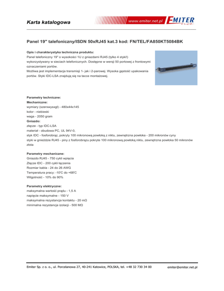 Karta katalogowa ___________________________________________________________________________ Panel 19" talefoniczny/ISDN 50xRJ45 kat.3 kod: FN/TEL/FA850KT5084BK Opis i charakterystyka techniczna produktu: Panel telefoniczny 19" o wysokości 1U z gniazdami RJ45 (tylko 4 styki!) wykorzystywany w sieciach telefonicznych. Dostępne w wersji 50 portowej z frontowymi oznaczeniami portów. Możliwa jest implementacja transmisji 1- jak i 2-parowej. Wysoka gęstość upakowania portów. Styki IDC-LSA znajdują się na tacce montażowej. Parametry techniczne: Mechaniczne: wymiary (szerxwysxgł) - 480x44x145 kolor - niebieski waga - 2050 gram Gniazdo: złącze - typ IDC-LSA materiał - obudowa PC, UL 94V-0, styk IDC - fosforobrąz, pokryty 100 mikronową powłoką z niklu, zewnętrzna powłoka - 200 mikronów cyny styki w gnieździe RJ45 - piny z fosforobrązu pokryte 100 mikronową powłoką niklu, zewnętrzna powłoka 50 mikronów złota Parametry mechaniczne: Gniazdo RJ45 - 750 cykli wpięcia Złącze IDC - 200 cykli łączenia Rozmiar kabla - 24 do 26 AWG Temperatura pracy: -10'C do +68'C Wilgotność - 10% do 90% Parametry elektryczne: maksymalna wartość prądu - 1,5 A napięcie maksymalne - 150 V maksymalna rezystancja kontaktu - 20 mΩ minimalna rezystancja izolacji - 500 MΩ Emiter Sp. z o. o., ul. Porcelanowa 27, 40-241 Katowice, POLSKA, tel. +48 32 730 34 00 [email protected]