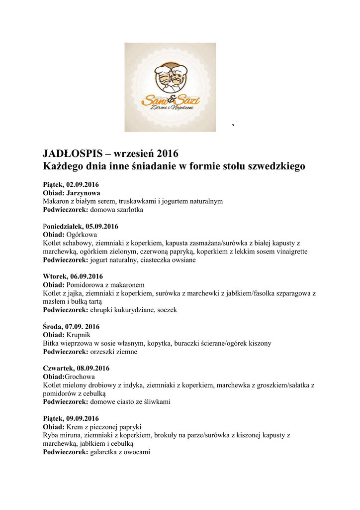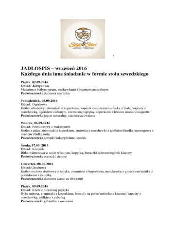 ` JADŁOSPIS – wrzesień 2016 Każdego dnia inne śniadanie w formie stołu szwedzkiego Piątek, 02.09.2016 Obiad: Jarzynowa Makaron z białym serem, truskawkami i jogurtem naturalnym Podwieczorek: domowa szarlotka Poniedziałek, 05.09.2016 Obiad: Ogórkowa Kotlet schabowy, ziemniaki z koperkiem, kapusta zasmażana/surówka z białej kapusty z marchewką, ogórkiem zielonym, czerwoną papryką, koperkiem z lekkim sosem vinaigrette Podwieczorek: jogurt naturalny, ciasteczka owsiane Wtorek, 06.09.2016 Obiad: Pomidorowa z makaronem Kotlet z jajka, ziemniaki z koperkiem, surówka z marchewki z jabłkiem/fasolka szparagowa z masłem i bułką tartą Podwieczorek: chrupki kukurydziane, soczek Środa, 07.09. 2016 Obiad: Krupnik Bitka wieprzowa w sosie własnym, kopytka, buraczki ścierane/ogórek kiszony Podwieczorek: orzeszki ziemne Czwartek, 08.09.2016 Obiad:Grochowa Kotlet mielony drobiowy z indyka, ziemniaki z koperkiem, marchewka z groszkiem/sałatka z pomidorów z cebulką Podwieczorek: domowe ciasto ze śliwkami Piątek, 09.09.2016 Obiad: Krem z pieczonej papryki Ryba miruna, ziemniaki z koperkiem, brokuły na parze/surówka z kiszonej kapusty z marchewką, jabłkiem i cebulką Podwieczorek: galaretka z owocami Poniedziałek, 12.09.2016 Obiad: Krem z marchwi z grzankami Pierogi z mięsem domowej produkcji, sałatka z pomidora z cebulką/warzywa gotowane Podwieczorek: domowe ciasto drożdżowe Wtorek, 13.09.2016 Obiad: Barszcz biały z ziemniakami i kiełbaską Pieczony indyk w sosie własnym, kasza jęczmienna, mizeria/fasolka szparagowa żółta i zielona z dodatkiem kolorowej papryki Podwieczorek: musli z jogurtem naturalnym Środa, 14. 09.2016 Obiad: Pomidorowa Tortilla z piersią kurczaka i warzywami, sałatka jesienna/warzywa grillowane Podwieczorek: batonik owsiany, owoc Czwartek, 15.09.2016 Obiad: Rosół Spaghetti Bolognese, warzywa gotowane/surówka z białej kapusty z papryką, kukurydzą, ogórkiem zielonym i natką pietruszki Podwieczorek: chipsy z jabłuszek suszonych PIĄTEK, 16.09.2016 Obiad: Barszcz czerwony czysty z uszkami z kapustą i pieczarkami Naleśniki z białym serem i jogurtem naturalnym Podwieczorek: drożdżówka Poniedziałek, 19.09.2016 Obiad: Krem warzywny z groszkiem ptysiowym Kotlet schabowy, ziemniaki z koperkiem, kapusta zasmażana /mizeria Podwieczorek: wafle ryżowe Wtorek, 20.09.2016 Obiad: Koperkowa Kluski leniwe, surówka z marchewki i jabłka z pestkami słonecznika Podwieczorek: domowe ciasto marchewkowe Środa, 21.09.2016 Obiad: Ogórkowa Lasagne z mięsem z sosem pomidorowym, mix warzyw gotowanych/surówka ze świeżej kapusty Podwieczorek: budyń waniliowy z sokiem malinowym Czwartek, 22.09.2016 Obiad: Kapuśniak z białej kapusty z pomidorami Nugetsy z piersi kurczaka, ryż jaśminowy, marchewka gotowana/sałatka na bazie papryk kolorowych Podwieczorek: jogurt naturalny z owocami Piątek, 23.09.2016 Obiad: Pieczarkowa Burger z mintaja, ziemniaki, surówka z kiszonej kapusty/brokuły gotowane Podwieczorek: ciasteczka owsiane, kakao Poniedziałek, 26.09.2016 Obiad: Krem brokułowy z groszkiem ptysiowym Pierś kurczaka w cieście naleśnikowym, ziemniaki z koperkiem, sałatka „wiosenna” z sosem jogurtowo-ziołowym/cukinia grillowana Podwieczorek: serek waniliowy Wtorek, 27.09. 2016 Obiad: Szczawiowa z ziemniakami i jajkiem Bitka z szynki wieprzowej w sosie własnym, kasza gryczana, buraczki gotowane/surówka na bazie sałaty zielonej z pomidorem, rzodkiewką, szczypiorkiem, papryką i ogórkiem z sosem czosnkowo-jogurtowym Podwieczorek: domowy sernik z brzoskwinią Środa, 28.09.2016 Obiad: Rosół Tortilla z piersią kurczaka i warzywami, surówka Colesław Podwieczorek: galaretka z owocami Czwartek, 29.09.2016 Obiad: Zupa z fasolki szparagowej Gulasz z szynki wieprzowej, kluski śląskie, surówka na bazie czerwonej kapusty/brokuł i kalafior Podwieczorek: drożdżowka Piątek, 30.09.2016 Obiad: Kapuśniak Spaghetti Napoli z serem żółtym, mix warzyw gotowanych/surówka Podwieczorek: domowe racuchy z jabłkiem 28.09.2015 Obiad: Pomidorowa z makaronem lub Krem z brokuł z grzankami Grillowana pierś kurczaka, dwa sosy do wyboru, ziemniaki z koperkiem/ryż jaśminowy, sałatka wiosenna/brukselka gotowana Lub Pierogi z kapustą i pieczarkami, z cebulką, sałatka wiosenna/brukselka gotowana 29.09.2015 Obiad: Rosół lub Krupnik Sznycelki z indyka , ziemniaki z koperkiem/ryż paraboliczny, surówka z buraczków na zimno/fasolka szparagowa z bułką tartą i masełkiem Lub Kotlet z kaszy gryczanej, surówka z buraczków na zimno/fasolka szparagowa z bułką tartą i masełkiem 30.09.2015 Obiad: Ogórkowa lub Zupa neapolitańska Pulpeciki wieprzowe w sosie pomidorowym, kasza perłowa/kopytka, sałata zielona z ogórkiem, koperkiem i śmietaną/mix warzyw Lub Naleśniki z białym serem i truskawkami, z polewą jogurtową