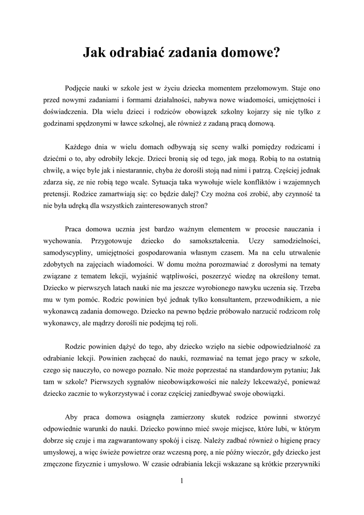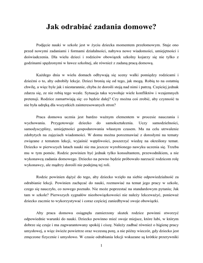 Jak odrabiać zadania domowe? Podjęcie nauki w szkole jest w życiu dziecka momentem przełomowym. Staje ono przed nowymi zadaniami i formami działalności, nabywa nowe wiadomości, umiejętności i doświadczenia. Dla wielu dzieci i rodziców obowiązek szkolny kojarzy się nie tylko z godzinami spędzonymi w ławce szkolnej, ale również z zadaną pracą domową. Każdego dnia w wielu domach odbywają się sceny walki pomiędzy rodzicami i dziećmi o to, aby odrobiły lekcje. Dzieci bronią się od tego, jak mogą. Robią to na ostatnią chwilę, a więc byle jak i niestarannie, chyba że dorośli stoją nad nimi i patrzą. Częściej jednak zdarza się, ze nie robią tego wcale. Sytuacja taka wywołuje wiele konfliktów i wzajemnych pretensji. Rodzice zamartwiają się: co będzie dalej? Czy można coś zrobić, aby czynność ta nie była udręką dla wszystkich zainteresowanych stron? Praca domowa ucznia jest bardzo ważnym elementem w procesie nauczania i wychowania. Przygotowuje dziecko do samokształcenia. Uczy samodzielności, samodyscypliny, umiejętności gospodarowania własnym czasem. Ma na celu utrwalenie zdobytych na zajęciach wiadomości. W domu można porozmawiać z dorosłymi na tematy związane z tematem lekcji, wyjaśnić wątpliwości, poszerzyć wiedzę na określony temat. Dziecko w pierwszych latach nauki nie ma jeszcze wyrobionego nawyku uczenia się. Trzeba mu w tym pomóc. Rodzic powinien być jednak tylko konsultantem, przewodnikiem, a nie wykonawcą zadania domowego. Dziecko na pewno będzie próbowało narzucić rodzicom rolę wykonawcy, ale mądrzy dorośli nie podejmą tej roli. Rodzic powinien dążyć do tego, aby dziecko wzięło na siebie odpowiedzialność za odrabianie lekcji. Powinien zachęcać do nauki, rozmawiać na temat jego pracy w szkole, czego się nauczyło, co nowego poznało. Nie może poprzestać na standardowym pytaniu; Jak tam w szkole? Pierwszych sygnałów nieobowiązkowości nie należy lekceważyć, ponieważ dziecko zacznie to wykorzystywać i coraz częściej zaniedbywać swoje obowiązki. Aby praca domowa osiągnęła zamierzony skutek rodzice powinni stworzyć odpowiednie warunki do nauki. Dziecko powinno mieć swoje miejsce, które lubi, w którym dobrze się czuje i ma zagwarantowany spokój i ciszę. Należy zadbać również o higienę pracy umysłowej, a więc świeże powietrze oraz wczesną porę, a nie późny wieczór, gdy dziecko jest zmęczone fizycznie i umysłowo. W czasie odrabiania lekcji wskazane są krótkie przerywniki 1 które są forma relaksu. Po krótkiej przerwie można wrócić do przerwanej pracy. Niekiedy po takiej przerwie odprężenia rozwiązania trudnych problemów przychodzą same. Są rodzice, którzy pozostawiają dziecko sam na sam z zadaną pracą. Nie troszczą się o jej poziom, a pilnują jedynie by lekcje zostały odrobione tylko te „pisemne”. Nie troszczą się o powtórzenie materiału pamięciowego. Takie postępowanie powoduje luki w materiale i w coraz większym stopniu utrudnia zrozumienie i przyswojenie nowych wiadomości. Dzieciom w młodszym wieku szkolnym pomoc rodziców w odrabianiu prac domowych jest niezbędna. Daje poczucie bezpieczeństwa, radości i zadowolenia, buduje więź emocjonalną między dziećmi i rodzicami. Dziecko wyrastające w atmosferze zainteresowania, poszanowania dla pracy, utwierdza się w przekonaniu, że to co robi jest ważne i potrzebne. Czasem jednak sytuacja wymaga, aby zawrzeć z dzieckiem swoistą umowę. Należy przekonać dziecko, że odrabianie zadań domowych leży w jego interesie. Wymaga to opracowania planu z pewnymi regułami dla obu stron. Rodzice musza być wtedy konsekwentni, bez taryfy ulgowej z byle powodu. Większość dzieci po opanowaniu sztuki odrabiania pracy domowej doskonale radzi sobie w szkole i nie wymaga wyczerpującej pomocy ze strony dorosłych. Bibliografia: Halina Kozak Rodzina i dom. Organizacja pracy domowej uczniów klas I-III; Instytut wydawniczy CRZZ; W-wa 1978 Irena Żywno Nauka domowa ucznia w klasach I-III; Życie Szkoły 1/2001 Z materiałów edukacyjnych na portalu http://edukator.edux.pl/ 2