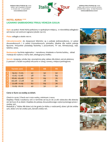Italiatour Biuro Podróży Sp. z o.o. tel/fax +48 12 6330663 ; 6237400 ul. Asnyka 10/1; 31-144 Kraków www.italiatour.travel Italiatour Biuro Podróży Sp. z o.o. tel/fax +48 22 4127171; 4127272; 4127373 ul. Emilii Plater 10/54; 00-669 Warszawa [email protected] HOTEL ADRIA *** LIGNANO SABBIADORO/ FRIULI VENEZIA GIULIA Opis: 42 pokoi. Hotel Adria położony w spokojnym miejscu, w niewielkiej odległości od morza i od centrum Lignano (około 150 m). Plaża: odległa o około 100 m. Zakwaterowanie: do dyspozycji klientów są 3 pokoje jednoosobowe, 27 pokoi dwuosobowych i 12 pokoi trzyosobowych, ponadto, idealne dla rodzin pokoje łączone. Wszystkie posiadają łazienkę z prysznicem, TV sat, klimatyzację, sejf, telefon, taras. Restauracja: kuchnia regionalna i narodowa, śniadanie w formie bufetu, obiad i kolacja do wyboru z karty dań, obsługa przy stoliku. Serwis: recepcja, winda, bar, zewnętrzny plac zabaw dla dzieci, serwis plażowy (1 parasol i 2 leżaki na pokój wliczone w cenę), rowery, miejsce parkingowe. A B C D E F Termin 2016 BB HB FB 19.03 – 11.05 12.05 - 17.06 18.06 - 05.08 06.08 – 21.08 22.08 - 11.09 12.09 - 02.10 42 58 62 70 62 42 50 62 69 78 69 50 50 69 76 86 76 50 Cena w Euro za osobę za dzień. Check in 14:00 / Check out 11:00: wolny, minimum 2 noce. Dopłaty: Pokój 1-osobowy 20% w terminie od 05.07 do 31.08. Łóżeczko dla dziecka 0/2 lat Euro 8 za dzień. Dopłata do pokoju dwuosobowego wykorzystanego przez 1 osobę: 35%. Redukcje 3 ° łóżka: BB dzieci 0/2 lat gratis (w łóżku z rodzicami), dzieci 3/6 lat zniżka 50%, dzieci 7/12 lat zniżka 30%, dorośli zniżka 10%.