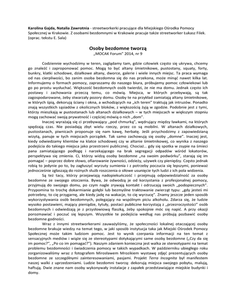 Karolina Gajda, Natalia Zawrotnia - streetworkerki pracujące dla Miejskiego Ośrodka Pomocy Społecznej w Krakowie. Z osobami bezdomnymi w Krakowie pracuje także streetworker Łukasz Filek. (oprac. tekstu E. Sala) Osoby bezdomne tworzą „MOCAK Forum” 2014, nr 9 Codziennie wychodzimy w teren, zaglądamy tam, gdzie człowiek często się ukrywa, chcemy go znaleźd i zaproponowad pomoc. Mogą to byd altany śmietnikowe, pustostany, squaty, forty, bunkry, klatki schodowe, działkowe altany, dworce, galerie i wiele innych miejsc. Ta praca wymaga od nas cierpliwości, bo zanim osoba bezdomna się do nas przekona, może minąd nawet kilka lat. Informujemy o formach pomocy, zapraszamy do naszego biura, próbujemy pomoc człowiekowi lub go po prostu wysłuchad. Większośd bezdomnych osób twierdzi, że nie ma domu. Jednak często ich postawy i zachowania przeczą temu, co mówią. Miejsca, w których przebywają, są tak zagospodarowane, żeby stwarzały pozory domu. Osoby te na przykład zamiatają altany śmietnikowe, w których śpią, dekorują ściany i okna, a wchodzących na „ich teren” traktują jak intruzów. Ponadto znają wszystkich sąsiadów z okolicznych bloków, z większością żyją w zgodzie. Podobnie jest z tymi, którzy mieszkają w pustostanach lub altanach działkowych – w tych miejscach w większym stopniu mogą zachowad swoją prywatnośd i częściej mówią o nich „dom”. Inaczej wyrażają się ci przebywający „pod chmurką”, wędrujący między ławkami, na których spędzają czas. Nie posiadają zbyt wielu rzeczy, przez co są mobilni. W altanach działkowych, pustostanach, piwnicach proponuje się nam kawę, herbatę. Jeśli przychodzimy z zapowiedzianą wizytą, panuje w tych miejscach porządek. Tak samo zachowują się osoby „domne”. Inaczej jest, kiedy odwiedzamy klientów na klatce schodowej czy w altanie śmietnikowej, co wynika z naszego podejścia do takiego miejsca jako przestrzeni publicznej. Chociaż… gdy się spotka w zsypie na śmieci pana zamiatającego podłogę i narzekającego na brak segregacji odpadów wśród lokatorów, perspektywa się zmienia. Ci, którzy widzą osoby bezdomne „na swoim podwórku”, starają się im pomagad – poprzez dobre słowo, ofiarowanie żywności, odzieży, używek czy pieniędzy. Często jednak robią to jedynie po to, by zagłuszyd wyrzuty sumienia i z potrzeby poczucia się lepszymi, ponieważ jednocześnie zgłaszają do rożnych służb roszczenia o siłowe usunięcie tych ludzi z ich pola widzenia. Są też tacy, którzy przejawiają nadopiekuoczośd i przejmują odpowiedzialnośd za osoby bezdomne ze swojego otoczenia. Bywa, że odwodzą je od korzystania z profesjonalnej pomocy, przyjmują do swojego domu, po czym nagle zrywają kontakt i odrzucają swoich „podopiecznych”. Przypomina to trochę dokarmianie gołębi lub bezmyślne traktowanie zwierząt typu: „gdy jesteś mi potrzebny, to cię przygarnę, ale kiedy jadę na wakacje, to cię wyrzucę”. Znamy jeszcze jeden sposób wykorzystywania osób bezdomnych, polegający na wspólnym piciu alkoholu. Zdarza się, że ludzie wysoko postawieni, mający pieniądze, tytuły, postaci publiczne korzystają z „przezroczystości” osób bezdomnych i odwiedzają je z przysłowiową flaszką, żeby spokojnie móc się napid. A przy okazji porozmawiad i poczud się lepszym. Wszystkie te podejścia według nas próbują pozbawid osoby bezdomne godności. Wraz z innymi streetworkerami zauważyliśmy, że społeczności lokalnej otaczającej osoby bezdomne brakuje wiedzy na temat tego, w jaki sposób instytucja taka jak Miejski Ośrodek Pomocy Społecznej może takim ludziom pomoc. Jest to wynik czerpania informacji na ten temat z sensacyjnych mediów i wiąże się ze stereotypami dotykającymi same osoby bezdomne („Czy da się im pomoc?”, „Po co im pomagad?”). Naszym zdaniem konieczna jest walka ze stereotypami na temat problemu bezdomności i świadczenia pomocy w takich wypadkach. W październiku ubiegłego roku zorganizowaliśmy wraz z fotografem Mirosławem Mrozikiem wystawę zdjęd prezentujących osoby bezdomne ze szczególnymi zainteresowaniami, pasjami. Projekt Terra Incognita był manifestem naszej walki z uprzedzeniami. Ludzie bezdomni tworzą: dekorują miejsca swojego pobytu, malują, haftują. Dwie znane nam osoby wykonywały instalacje z zapałek przedstawiające miejskie budynki i domy.