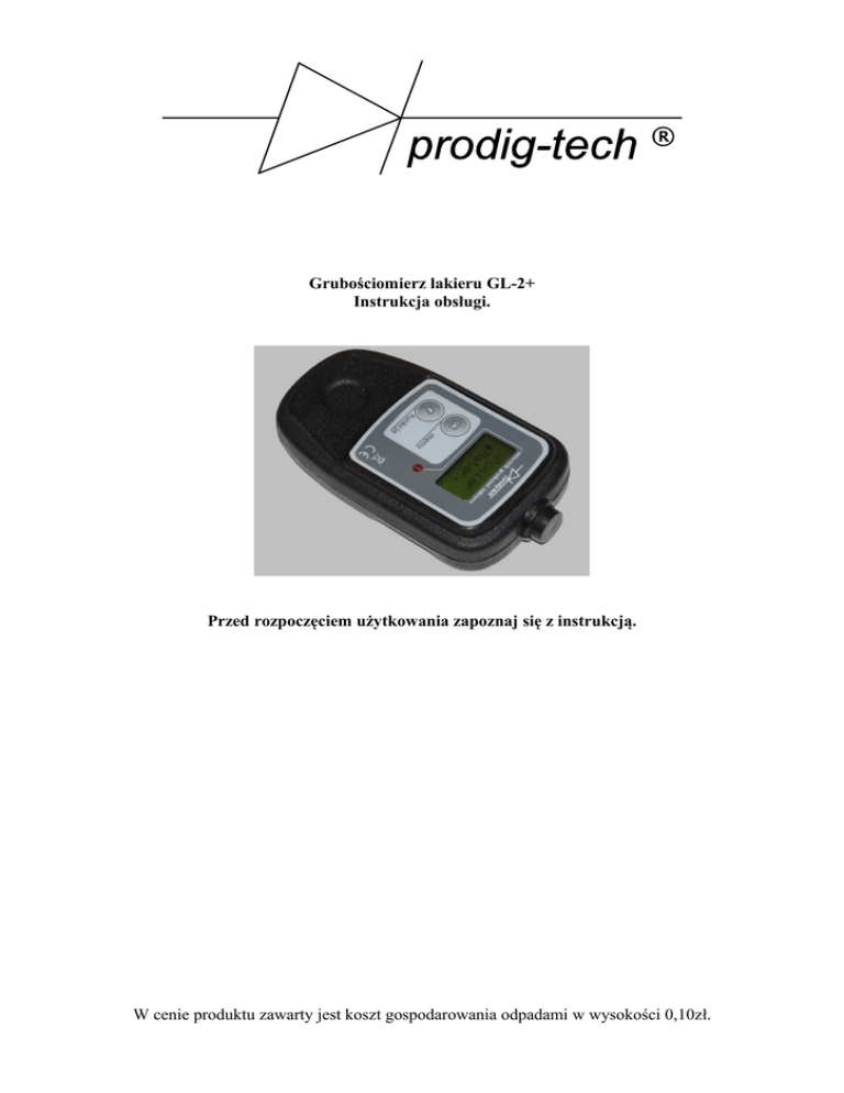 Grubościomierz lakieru GL-2+ Instrukcja obsługi. Przed rozpoczęciem użytkowania zapoznaj się z instrukcją. W cenie produktu zawarty jest koszt gospodarowania odpadami w wysokości 0,10zł. Spis treści 1. Specyfikacja………………………………………………………………………………2 2. Przygotowanie do pomiaru……………………….……………………………………...2 3. Obsługa miernika..……………………………………………………………………….2 Gwarancja…………………………………………………………………………………..4 1. Specyfikacja Podstawowe parametry przyrządu: - pomiar na blachach samochodowych stalowych, stalowych ocynkowanych i aluminiowych; - rozdzielczość pomiaru: 10µm; - zakres pomiaru: 0µm do 2000µm; - funkcja ASYSTENT LED; - funkcja zerowania; - podświetlanie LCD; - intuicyjna obsługa za pomocą MENU; - automatyczne wyłączenie miernika dłuższej bezczynności; - zasilanie: 2 x bateria alkaliczna AAA („cienkie paluszki”); - dwa języki (polski, angielski). 2. Uwagi ogólne oraz przygotowanie do pomiaru Grubościomierz lakieru GL-2+ służy do pomiaru grubości warstwy lakieru nałożonej na blachę samochodową stalową, stalową ocynkowaną lub aluminiową. Rozdzielczość pomiaru wynosi 10µm. Urządzenie ma wbudowane podświetlanie wyświetlacza, dzięki temu łatwiejsze jest dokonanie pomiaru w ciemniejszych pomieszczeniach (jak np. garaż). Funkcja ASYSTENT POMIARU® podpowiada za pomocą diody LED oceniającemu samochód czy miał on naprawy blacharsko-lakiernicze. Przed rozpoczęciem pomiarów należy umieścić sprawne baterie w tylnej części obudowy. W tym celu otwieramy klapkę i umieszczamy w koszyku dwie baterie alkaliczne AAA (!). UWAGA! Miernik domyślnie ustawiony jest na blachę ocynkowaną i aluminium (Zn/Al), jeżeli pomiar będzie wykonywany na starszych samochodach z blachą nieocynkowaną, należy wybrać materiał (Fe). Przed rozpoczęciem pomiarów, należy sprawdzić czy miernik jest wyzerowany (patrz strona 3). UWAGA !!! 1. Bateria powinna być alkaliczna. Zwykła bateria bardzo szybko wyczerpie się. 2. Nieprawidłowa praca może być spowodowana słabą baterią. Pomiaru dokonuje się przykładając czujnik do badanej powierzchni. Czujnik powinien możliwie płasko przylegać. Badana powierzchnia powinna być czysta i gładka – brud i chropowatość powodują dodatkową warstwę mierzoną. Miernik należy trzymać przyłożony do blachy aż wynik ustabilizuje się. Zaleca się trzymać miernik w dwóch rękach i delikatnie dociskać do blachy – eliminuje to drgania ręki. 3. Obsługa miernika Miernik wyposażony jest w dwa przyciski, za pomocą których obsługujemy przyrząd: - (OK / MENU): służy do włączenia miernika, zatwierdzania wybranych funkcji z MENU oraz do wychodzenia z funkcji z powrotem do MENU; - (FUNKCJA): służy do przełączania funkcji w MENU głównym. Miernik włączamy przyciskając na chwilę przycisk OK. Po wyświetleniu loga firmy oraz nazwy przyrządu, miernik przejdzie do menu głównego. Na wyświetlaczu w pierwszej linii będzie wyświetlany napis „*MENU*” oraz wskaźnik stanu baterii a w drugiej linii wybrana funkcja. Znak „>” w drugiej linii sygnalizuje aktualnie zaznaczoną funkcję. Funkcje przełączamy przyciskiem FUNKCJA: - POMIAR - powoduje przejście miernika w stan pomiaru; - MATER. - wybór rodzaju blachy, domyślnie ustawiony na Zn/Al (większość samochodów); - WYLACZ - powoduje wyłączenie miernika; - ZERO - zerowanie miernika; - JĘZYK - wybór języka. W celu zatwierdzenia wybranej funkcji należy wcisnąć przycisk OK. 2 FUNKCJA POMIAR Po wybraniu tej funkcji na wyświetlaczu w pierwszej linii będzie wyświetlany aktualnie wybrany materiał, np. „Zn/Al” oraz po lewej stronie wskaźnik stanu baterii a w drugiej linii „----um”. Miernik w tym momencie oczekuje na przyłożenie do badanej blachy samochodowej. ^ Zn/Al ----um Po przyłożeniu sondy do karoserii na wyświetlaczu w drugiej linii przedstawiony zostanie pomiar. ^ Zn/Al 140um Po przeprowadzeniu pomiarów, należy wyjść do MENU głównego wciskając przycisk (OK / MENU). FUNKCJA MATERIAŁ Po wybraniu tej funkcji, mamy możliwość wyboru materiału, na którym będziemy dokonywać pomiaru: - Stal ocynkowana / Aluminium (Zn/Al) – ustawienie prawidłowe dla większości samochodów; - Stal czarna (Fe) Przyciskiem FUNKCJA przełączamy kolejno rodzaj blachy, natomiast przyciskiem OK zatwierdzamy wybór. FUNKCJA WYŁĄCZ Po zatwierdzeniu przyciskiem OK tej funkcji, miernik wyłączy się. FUNKCJA ZERO [Zerowanie (kalibracja)] Przed rozpoczęciem pomiarów, należy sprawdzić czy miernik jest wyzerowany. W tym celu wybieramy w MENU głównym funkcję „ZERO” i przykładamy miernik do płytki kalibracyjnej. Jeżeli wskazanie wyniesie 0 +/-10um oznacza to, że miernik jest wyzerowany prawidłowo. Jeżeli odchylenie będzie większe niż +/-10um to należy miernik przyłożyć NA ŚRODEK płytki kalibracyjnej, poczekać aż wynik ustabilizuje się i wcisnąć przycisk (OK). Na wyświetlaczu pojawi się napis „Zapis…” i miernik przejdzie do MENU głównego. Z funkcji „ZERO” można wyjść przyciskając przycisk OK. UWAGA! Przycisk należy nacisnąć dopiero po pojawieniu się w drugiej linii ciągu znaków „------„ – w innym wypadku miernik rozkalibruje się i będzie konieczne ponowne zerowanie. UWAGA! Podczas zerowania, płytka do zerowania powinna leżeć na płaskiej powierzchni niemetalicznej (nie powinno się kłaść płytki np. na karoserii samochodowej, metalowym blacie itp.), nie powinna też być trzymana w dłoni. Zerowanie należy przeprowadzać np. przy dużych zmianach temperatury otoczenia lub dłuższej przerwie w użytkowaniu przyrządu. WYBÓR JĘZYKA Miernik obsługuje dwa języki (polski, angielski). W celu wybrania języka należy wejść do funkcji JĘZYK i przyciskie