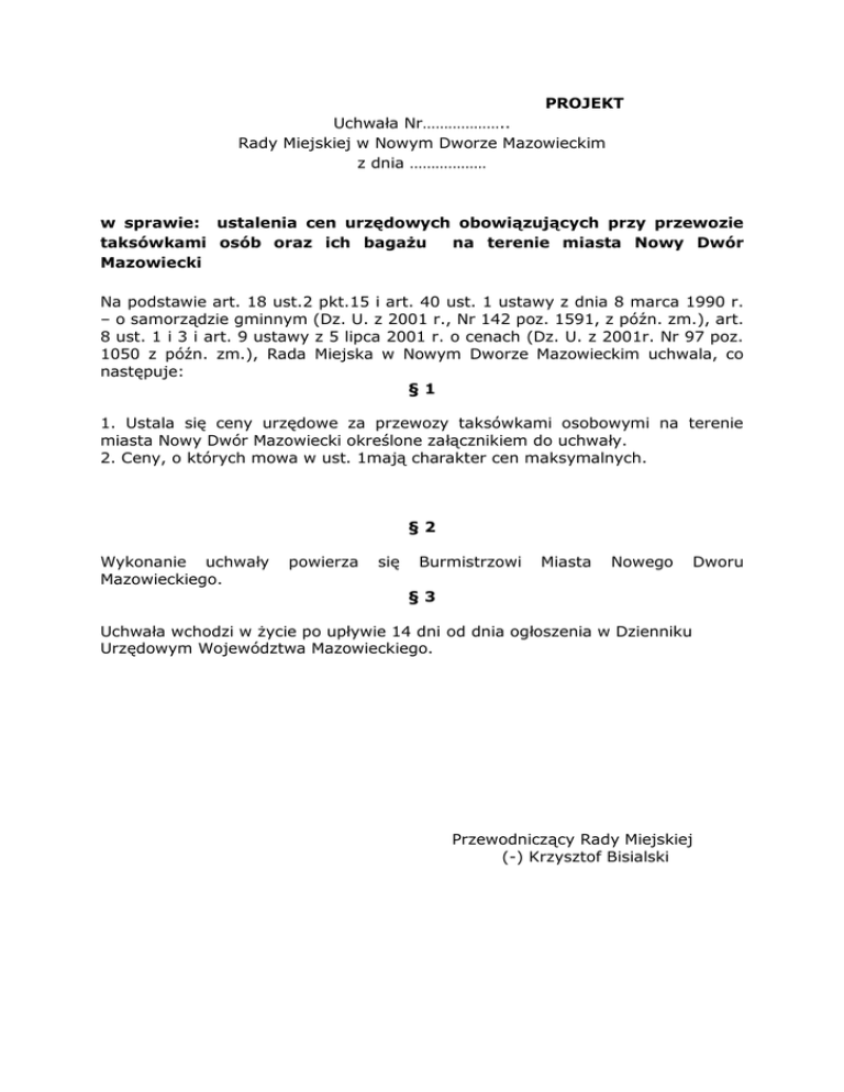 PROJEKT Uchwała Nr……………….. Rady Miejskiej w Nowym Dworze Mazowieckim z dnia ……………… w sprawie: ustalenia cen urzędowych obowiązujących przy przewozie taksówkami osób oraz ich bagażu na terenie miasta Nowy Dwór Mazowiecki Na podstawie art. 18 ust.2 pkt.15 i art. 40 ust. 1 ustawy z dnia 8 marca 1990 r. – o samorządzie gminnym (Dz. U. z 2001 r., Nr 142 poz. 1591, z późn. zm.), art. 8 ust. 1 i 3 i art. 9 ustawy z 5 lipca 2001 r. o cenach (Dz. U. z 2001r. Nr 97 poz. 1050 z późn. zm.), Rada Miejska w Nowym Dworze Mazowieckim uchwala, co następuje: §1 1. Ustala się ceny urzędowe za przewozy taksówkami osobowymi na terenie miasta Nowy Dwór Mazowiecki określone załącznikiem do uchwały. 2. Ceny, o których mowa w ust. 1mają charakter cen maksymalnych. §2 Wykonanie uchwały Mazowieckiego. powierza się Burmistrzowi Miasta Nowego Dworu §3 Uchwała wchodzi w życie po upływie 14 dni od dnia ogłoszenia w Dzienniku Urzędowym Województwa Mazowieckiego. Przewodniczący Rady Miejskiej (-) Krzysztof Bisialski Załącznik do Uchwały Nr .................... Rady Miejskiej w Nowym Dworze Mazowieckim z dnia ............................ §1 1.Ustala się maksymalne ceny urzędowe za przewozy taksówkami osobowymi na terenie miasta Nowy Dwór Mazowiecki w następujących wysokościach: Opłata początkowa dla wszystkich taryf Taryfa 1 Taryfa 2 Taryfa 3 Taryfa 4 Opłata za wynajęcie taksówki i przejazd pierwszego kilometra Opłata za przejazd kolejnego kilometra między godz. 600 a 22 00 w granicach administracyjnych miasta Nowego Dworu Mazowieckiego, w dni powszednie, z wyjątkiem niedziel i świąt. Opłata za przejazd kolejnego kilometra między godz. 2200 a 6 00 w granicach administracyjnych miasta Nowego Dworu Mazowieckiego, w dni powszednie oraz w ciągu całej doby w niedziele i święta (wyższa o 50% od taryfy 1) 10,00 zł 2,40 zł. 3,60 zł. Opłata za przejazd kolejnego kilometra między godz.600 a 22 00 przy wyjazdach poza granice administracyjne miasta Nowego Dworu Mazowieckiego, bez wykorzystania jazdy w kierunku powrotnym, w dni powszednie, z wyjątkiem niedziel i świąt ( wyższa o 100% od taryfy 1) 4,80 zł. Opłata za przejazd kolejnego kilometra między godz.2200 a 6 00 przy wyjazdach poza granice administracyjne miasta Nowego Dworu Mazowieckiego, bez wykorzystania jazdy w kierunku powrotnym, w dni powszednie oraz w niedziele i święta w ciągu całej doby ( wyższa o 100% od taryfy 2) 7,20 zł. Opłata za 1 godz. postoju dla wszystkich taryf 2. Wartość jednostki taryfowej ( skok opłat) jest nie większa niż 1,20 zł. 3. Wartość stałej taryfy „C” jest nie mniejsza niż 2. 40,00 zł Uzasadnienie uchwały Rady Miejskiej w Nowym Dworze Mazowieckim w sprawie ustalenia cen urzędowych obowiązujących przy przewozie taksówkami osób oraz ich bagażu na terenie miasta Nowy Dwór Mazowiecki. Na ustalenie cen urzędowych obowiązujących przy przewozie osób i bagażu taksówkami oraz określenie stref cen na terenie miasta pozwalają zapisy zawarte w art. 8 ust. 1 i 3 i art. 9 ustawy z 5 lipca 2001 r. o cenach (Dz. U. Nr 97 poz. 1050 z późn. zm.) Art. 8 ust.1. w/w ustawy stanowi, iż Rada gminy może ustalać ceny urzędowe za usługi za przewozy taksówkami na terenie gminy. Art. 8 ust.3. stanowi, iż Rada gminy określa strefy cen (stawki taryfowe) obowiązujące przy przewozie osób i ładunków taksówkami. Natomiast art. 9 powołanej wyżej ustawy stanowi, iż ceny urzędowe mają charakter cen maksymalnych, chyba, że przepisy odrębne stanowią inaczej. Z uwagi na wzrastające zainteresowanie przedsiębiorców na wykonywanie przewozu osób taksówkami osobowymi na terenie miasta Nowy Dwór Mazowiecki, należy skorzystać z możliwości ustalenia cen urzędowych obowiązujących przy przewozie taksówkami osób oraz ich bagażu na terenie miasta. Podjęcie uchwały pozwoli na ewentualne wyeliminowanie nieuczciwych przedsiębiorców świadczących usługi w zakresie przewozu osób, bowiem nieprzestrzeganie przez przedsiębiorcę przepisów określonych niniejszą uchwałą, zgodnie z zapisem zawartym w art. 15 ust. 1 pkt. 2 lit. b ustawy z dnia 6 września 2011 r. o transporcie drogowym (Dz. U. z 2007 r. Nr 125 poz. 874 z późn. zm.) stanowi podstawę do obligatoryjnego cofnięcia licencji. Powołany wyżej przepis prawny stanowi, iż organ wydający licencję, obligatoryjnie cofa licencję, w przypadku, gdy przedsiębiorca rażąco naruszył warunki określone w licencji lub inne warunki wykonywania działalności objętej licencją określone przepisami prawa. W dniu 18.06.2012r. w sali konferencyjnej Urzędu Miejskiego w Nowym Dworze Mazowieckim zostało zorganizowane spotkanie z przedsiębiorcami wykonującymi zarobkowy przewóz osób TAXI na terenie Nowego Dworu Mazowieckiego Celem spotkania była konsultacja w sprawie projektów uchwał regulujących wykonywanie zarobkowego przewozu osób TAXI na terenie miasta, w tym m.in. wprowadzenia obowiązku stosowania dodatkowego oznaczenia taksówek osobowych, ustalenia maksymalnych cen urzędowych za przewóz osób taksówką i określenia przepisów porządkowych związanych z przewozem osób i bagażu. Taksówkarze, po wysłuchaniu uzasadnienia, nie wnieśli uwag do zaproponowanej treści uchwały. Uchwała nie rodzi skutków finansowych dla budżetu gminy.