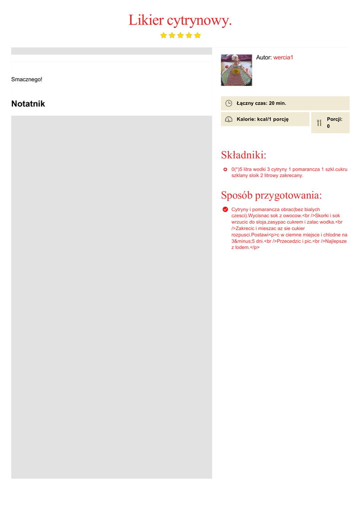Likier cytrynowy. Autor: wercia1 Smacznego! Notatnik Łączny czas: 20 min. Kalorie: kcal/1 porcję Porcji: 0 Składniki: 0(*)5 litra wodki 3 cytryny 1 pomarancza 1 szkl.cukru szklany sloik 2 litrowy zakrecany. Sposób przygotowania: Cytryny i pomarancza obrac(bez bialych czesci).Wycisnac sok z owocow.<br />Skorki i sok wrzucic do sloja,zasypac cukrem i zalac wodka.<br />Zakrecic i mieszac az sie cukier rozpusci.Postawi<p>c w ciemne miejsce i chlodne na 3&minus;5 dni.<br />Przecedzic i pic.<br />Najlepsze z lodem.</p>