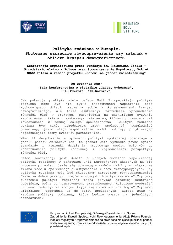 Polityka rodzinna w Europie. Skuteczne narzędzie równouprawnienia czy ratunek w obliczu kryzysu demograficznego? Konferencja organizowana przez Fundację im. Heinricha Boella – Przedstawicielstwo w Polsce oraz Stowarzyszenie Współpracy Kobiet NEWW-Polska w ramach projektu „Gotowi na gender mainstreaming” 20 września 2007 Sala konferencyjna w siedzibie „Gazety Wyborczej, ul. Czerska 8/10,Warszawa Jak pokazuje praktyka wielu państw Unii Europejskiej, polityka rodzinna może być nie tylko instrumentem wspierania osób wychowujących dzieci, radzenia sobie z konsekwencjami kryzysu demograficznego, ale także skutecznym narzędziem wprowadzania równości płci w praktyce, odpowiedzią na ekonomiczne wyzwania współczesnego świata i systemowym działaniem, któremu przyświeca cel inwestowania w rozwój całego społeczeństwa. Polityka rodzinna powinna być także przedmiotem umowy społecznej, uwzględniać przemiany, jakim ulega współcześnie model rodziny, przybierając najróżniejsze formy związków partnerskich. Mimo iż decydowanie w sprawach polityki społecznej pozostaje w gestii państw członkowskich, to jednak Unia wyznacza pewne ogólne standardy i kierunki działania, motywując swoich członków do konstruowania polityki rodzinnej z uwzględnieniem perspektywy równości płci. Celem konferencji jest debata o różnych modelach współczesnej polityki rodzinnej w państwach Unii Europejskiej ukazanych na tle procesów przemian, jakie się dokonują w modelu rodziny w związku ze zmianą modelu społecznego i aktywnością ruchów emancypacyjnych. Czy polityka rodzinna może być skutecznym narzędziem równouprawnienia? Jakie są dobre praktyki krajów europejskich w tym zakresie? Czy przy tworzeniu polityki rodzinnej można przyjąć bardziej neutralne podejście, wolne od normatywnych, uwarunkowanych kulturowo wyobrażeń na temat rodziny, za którymi kryje się określona ideologia? Czy mimo „miękkiego” podejścia UE do spraw społecznych, Europę stać na wspólna politykę rodzinną, która będzie oparta na jednolitych standardach? Przy wsparciu Unii Europejskiej, Głównego Dyrektoriatu do Spraw Zatrudnienia, Kwestii Społecznych i Równouprawnienia, Akcja Równa Pozycja Kobiet i Mężczyzn. Odpowiedzialność za zawartość niniejszej publikacji ponosi wyłącznie jej autor; Komisja nie odpowiada za dalsze użycie materiałów i danych tu przedstawionych. PROGRAM KONFERENCJI 16:00-16:15 – Powitanie Agnieszka Grzybek, Program Demokracja Płci/ Polityka Kobiet, Przedstawicielstwo Fundacji im. Heinricha Bölla w Polsce Małgorzata Tarasiewicz, Dyrektorka Stowarzyszenia Współpracy Kobiet NEWW Polska 16.15-18.00 – Różne państwa, różne modele? W Czechach i Niemczech jednym z elementów programów polityki rodzinnej jest potrzeba włączenia mężczyzn w znacznie większym stopniu w dzielenie się obowiązkami związanymi z prowadzeniem domu i wychowywaniem dzieci. W Czechach obecny rząd realizuje program opracowany i przyjęty przez poprzedników z dziś opozycji politycznej. W Niemczech chadecka minister d.s. rodziny, seniorów, kobiet i młodzieży realizuje w ramach polityki rodzinnej progresywny program na rzecz równouprawnienia płci. W Polsce polityka rodzinna nie ma najlepszej passy. Niezależnie od opcji politycznej, bywa najczęściej mylona z opieką socjalną, ma charakter doraźnych zrywów (np. becikowe). W konstruowaniu rozwiązań nie brano pod uwagę perspektywy długofalowej, ani tego, że cele polityki rodzinnej powinny być łączone z celami rozwoju społecznego i gospodarczego. W marcu br., po dwóch latach od objęcia władzy przez konserwatywny rząd, został ogłoszony program polityki rodzinnej. Z deklaracji wynika, że ma wspierać rodziców w godzeniu pracy i życia rodzinnego, zapewniać wsparcie finansowe dla rodzin i promować rozwój społeczeństwa przyjaznego dzieciom i rodzinom. Jakie modele polityki rodzinnej realizowane są w Polsce, Niemczech i Czechach? Jakie proponują rozwiązania, aby ułatwić pracującym rodzicom łączenie aktywności zawodowej i rodzinnej na równych i partnerskich zasadach? Jak tworzyć nowoczesną, długofalową politykę rodzinną promującą równe szanse kobiet i mężczyzn, wolną od ideologizacji? Na ile propagowane w krajach Unii modele wspierania rodziny uwzględniają unijne standardy? Czy możliwa jest w Europie wspólna polityka rodzinna, budowana ponad podziałami politycznymi, uwzględniająca perspektywę równości płci i dopasowana do współczesnych przemian, którym ulega tradycyjny model rodziny? Model polskiej polityki rodzinnej – Joanna Kluzik-Rostkowska, Wiceminister polityki społecznej i szefowa Departamentu Kobiet, Przy wsparciu Unii Europejskiej, Głównego Dyrektoriatu do Spraw Zatrudnienia, Kwestii Społecznych i Równouprawnienia, Akcja Równa Pozycja Kobiet i Mężczyzn. Odpowiedzialność za zawartość niniejszej publikacji ponosi wyłącznie jej autor; Komisja nie odpowiada za dalsze użycie materiałów i danych tu przedstawionych. Rodziny i Przeciwdziałania Dyskryminacji (Polska) Model niemieckiej polityki rodzinnej – przedstawicielka/ przedstawiciel instytucji rządowej (Niemcy) Model czeskiej polityki rodzinnej - Michaela Marksova-Tominova, prezeska Stowarzyszenia na rzecz Równych Szans, była dyrektorka Departamentu ds. Polityki Rodzinnej i na rzecz Równego Statusu Kobiet i Mężczyzn w Ministerstwie Pracy i Polityki Społecznej (Czechy) Komentują: Prof. Irena Wóycicka, Instytut Badań nad Gospodarką Rynkową Ute Meier-Gräwer, Lehrstuhl für Wirtschaftslehre des Privathaushalts und Familienwissenschaft, Justus-Liebig-Universität Gießen Moderacja: Adam Leszczyński, „Gazeta Wyborcza” 18.00-18.15 – przerwa na kawę 18.15-20.00 – Inna rodzina? Polityka rodzinna powinna być przedmiotem umowy społecznej, powinna uwzględniać przemiany, jakim ulega współcześnie model rodziny, przybierając najróżniejsze formy zwią