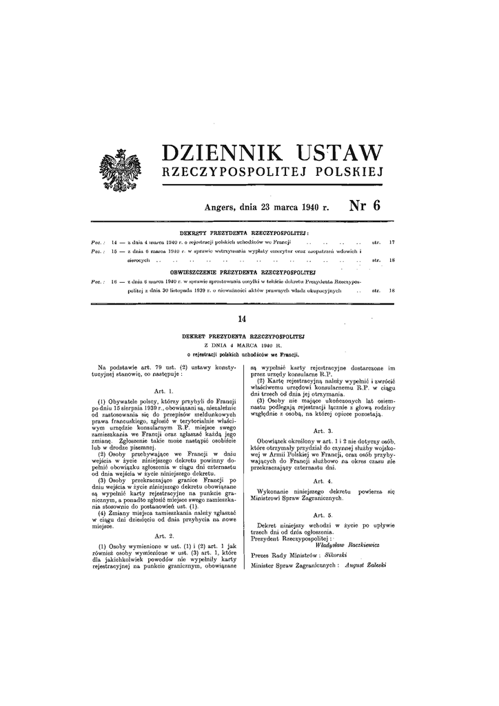 DZIENNIK USTAW RZECZYPOSPOLITEJ. POLSKIEJ Angers, dnia 23 marca 1940 r. DEKRETY PREZYDENTA Nr RZECZYPOSPOLITEJ: Poz. : 14 — z dnia 4 marca 1940 r. o rejestracji polskich uchodźców wo Francji Poz. : 15 — z dnia 6 marca 1940 r. w sprawie wstrzymania wypłaty emerytur oraz zaopatrzeń wdowich i sierocych .. .. .. .. .. .. .. OBWIESZCZENIE PREZYDENTA Poz. : 6 .. .. .. .. .. .. .. .. .. .. str. 17 str. 18 str. 18 RZECZYPOSPOLITEJ 16 — z dnia 6 marca 1940 r. w sprawie sprostowania omyłki w tekście dekretu Prezydenta Rzeczypospolitej z dnia 30 listopada 1939 r. o nieważności aktów prawnych władz okupacyjnych .-. 14 DEKRET PREZYDENTA RZECZYPOSPOLITEJ Z D N I A 4 MARCA 1940 R . o rejestracji polskich uchodźców we Francji. Na podstawie art. 79 ust. (2) ustawy konstytucyjnej stanowię, co następuje : Art. 1. (1) Obywatele polscy, którzy przybyli do Francji po dniu 15 sierpnia 1939 r., obowiązani są, niezależnie od zastosowania się do przepisów meldunkowych prawa francuskiego, zgłosić w terytorialnie właściwym urzędzie konsularnym R.P. miejsce swego zamieszkania we Francji oraz zgłaszać każdą jego zmianę. Zgłoszenie takie może nastąpić osobiście lub w drodze pisemnej. (2) Osoby przebywające we Francji w dniu wejścia w życie niniejszego dekretu powinny dopełnić obowiązku zgłoszenia w ciągu dni czternastu od dnia wejścia w życie niniejszego dekretu. (3) Osoby przekraczające granice Francji po dniu wejścia w życie niniejszego dekretu obowiązane są wypełnić karty rejestracyjne na punkcie granicznym, a ponadto zgłosić miejsce swego zamieszkania stosownie do postanowień ust. (1). (4) Zmiany miejsca zamieszkania należy zgłaszać w ciągu dni dziesięciu od dnia przybycia na nowe miejsce. Art. 2. (1) Osoby wymienione w ust. (1) i (2) art. 1 jak również osoby wymienione w ust. (3) art. 1, które dla jakichkolwiek powodów nie wypełniły karty rejestracyjnej na punkcie granicznym, obowiązane są wypełnić karty rejestracyjne dostarczone im przez urzędy konsularne R.P. (2) Kartę rejestracyjną należy wypełnić i zwrócić właściwemu urzędowi konsularnemu R.P. w ciągu dni trzech od dnia jej otrzymania. (3) Osoby nie mające ukończonych lat osiemnastu podlegają rejestracji łącznie z głową rodziny względnie z osobą, na której opiece pozostają. Art. 3. Obowiązek określony w art. 1 i 2 nie dotyczy osób, które otrzymały przydział do czynnej służby wojskowej w Armii Polskiej we Francji, oraz osób przybywających do Francji służbowo na okres czasu nie przekraczający czternastu dni. Art. 4. Wykonanie niniejszego dekretu Ministrowi Spraw Zagranicznych. powierza się Art. 5. Dekret niniejszy wchodzi w życie po upływie trzech dni od dnia ogłoszenia. Prezydent Rzeczypospolitej : Władysław Raczkiewicz Prezes Rady Ministrów : Sikorski Minister Spraw Zagranicznych : August Zaleski — 18 — Dziennik Ustaw Nr 5 Poz. 11 i 12 15 DEKRET PREZYDENTA Z DNIA RZECZYPOSPOLITEJ 6 MARCA 1940 R . w sprawie wstrzymania wypłaty emerytur oraz zaopatrzeń wdowich i sierocych. Na podstawie a r t . 79 ust. (2) ustawy tucyjnej stanowię, co następuje : (2) Postanowienia niniejszego dekretu dotyczą również niewypłaconych świadczeń przysługujących powyższym osobom a płatnych przed wejściem w życie niniejszego dekretu. konsty- Art. 1. Art. 2. (1) Na czas trwania wyjątkowych okoliczności wywołanych wojną wstrzymuje się wypłatę emerytur oraz zaopatrzeń wdowich i sierocych, przysługujących na podstawie ustawy z dnia 11 grudnia 1923 r. 0 zaopatrzeniu emerytalnym funlccjonariuszów państwowych i zawodowych wojskowych (Dz.U.R.P. z 1934 r. N r 20, poz. 160) zmienionej dekretem Prezydenta Rzeczypospolitej z dnia 22 listopada 1935 r. (Dz. U.R.P. Nr 85, poz. 521), ustawą z dnia 12 marca 1938 r. (Dz.U.R.P. Nr 17, poz. 125) 1 ustawą z dnia 30 marca 1939 r. (Dz.U.R.P. Nr 28, poz. 183) osobom, które przebywają poza granicami Państwa. Wykonanie niniejszego dekretu powierza się Ministrowi Skarbu oraz innym właściwym Ministrom. Art. 3. Dekret niniejszy wchodzi w życie z dniem ogłoszenia. Prezydent Rzeczypospolitej : Władysław Raczkiewicz Prezes R a d y Ministrów : Minister Skarbu : Henryk Sikorski Strasburyer 16 OBWIESZCZENIE PREZYDENTA Z D N I A 6 MARCA RZECZYPOSPOLITEJ 1940 R . w sprawie sprostowania omyłki w tekście dekretu Prezydenta Rzeczypospolitej z dnia 30 listopada 1939 r. o nieważności aktów prawnych władz okupacyjnych. Na podstawie art. 5 ust. (1) dekretu Prezydenta Rzeczypospolitej z dnia 6 września 1935 r. o wydawaniu Dziennika Ustaw Rzeczypospolitej Polskiej (Dz. U.R.P. Nr 68, poz. 423) omyłkę zachodzącą w tekście dekretu Prezydenta Rzeczypospolitej z dnia 30 listopada 1939 r. o nieważności aktów prawnych władz okupacyjnych ( D z . U . R . P . N r 102, poz. 1008) prostuje się w następujący sposób : w podpisie po wyrazach : ,,Prezes R a d y Ministrów :" dodaje się przed dwukropkiem wyrazy : ,,i Minister Sprawiedliwości". Prezydent Rzeczypospolitej : Władysław Raczkiewicz Prezes R a d y Ministrów i Minister Sprawiedliwości : Sikorski Tłoczono z polecenia Ministra Sprawiedliwości w D r u k a r n i „ P o l a k a we F r a n c j i " w P a r y ż u . Cena n u m e r u niniejszego 2 f r . fr. „Dziennik U s t a w Rzeczypospolitej P o l s k i e j " można prenumerować i n a b y w a ć poszczególne n u m e r y w Księgarni Polskiej w P a r y ż u (Librairie Polonaise a Paris) 123 B d . St. Germain Paris V I . P r e n u m e r a t a k w a r t a l n a wynosi : 20 fr. f r . Z przesyłką pocztową we F r a n c j i : 23 fr. fr. Z przesyłką pocztową zagranicę : 28 fr. fr. Cena p r e n u m e r a t y jest t r a k t o w a n a zaliczkowo i w razie większych objętości poszczególnych n u m e r ó w może b y ć odpowiednio podwyższona.