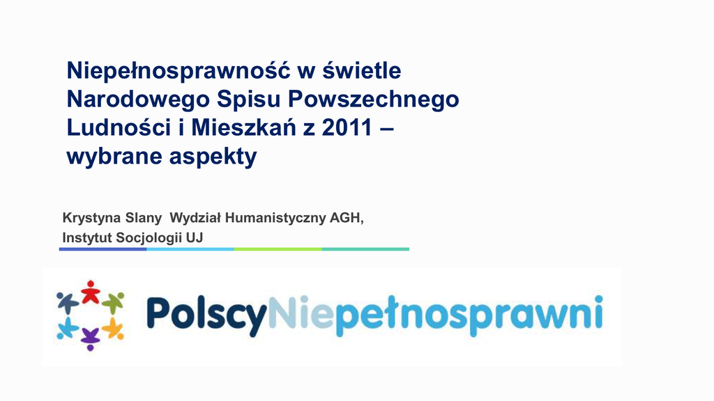 Niepełnosprawność w świetle Narodowego Spisu Powszechnego Ludności i Mieszkań z 2011 – wybrane aspekty Krystyna Slany Wydział Humanistyczny AGH, Instytut Socjologii UJ Podziękowanie Podziękowanie dla prof. dr hab. Barbary Gąciarz za możliwość podjęcia badań, efektywną współpracę przy realizacji projektu Od kompleksowej diagnozy sytuacji osób niepełnosprawnych w Polsce do nowego modelu polityki społecznej wobec niepełnosprawności finansowanego przez Państwowy Fundusz Rehabilitacji Osób Niepełnosprawnych. Cele referatu 1. Krytyczne odniesienie do najnowszego Narodowego Spisu Powszechnego z 2011 roku Cele spisu Metodologia Czas publikowania danych Jakość danych w społeczeństwie demokratycznym, błędy Pytania drażliwe 2. Charakterystyka niepełnosprawności wg liczby, rodzajów niepełnosprawności, głównych charakterystyk społeczno-demograficznych 3. Wnioski „Cenzus” - nazwa antykizująca jest nieprzypadkowa w nowoczesnych społeczeństwach. „Ze starożytnym pojęciem spisu wiąże się wyobrażenie republikańskiej równości: wszyscy sprowadzeni są do tej samej sytuacji i każdy ma obowiązek udzielić odpowiedzi na te same pytania. Im społeczeństwo bardziej demokratyczne, tym źródła statystyczne wiarygodniejsze. Im społeczeństwo bardziej demokratyczne tym źródła statystyczne wymowniejsze” Witold Kula „Historia, statystyka, demokracja”1988 Rys. 1 Liczba osób niepełnosprawnych na 1.000 mieszkańców w świetle spisów: 1978, 1988, 2002 i 2011 Źródło: http://www.stat.gov.pl/cps/rde/xbcr/gus/osoby_niepelnosprawne_oraz_ich_gospodarstwa_domowe_2002_cz_1_osoby_niepelnos prawne.pdf Rys. 2 Liczba osób niepełnosprawnych Polsce w świetle spisów: 1978, 1988, 2002 i 2011 w tys. Źródło: http://www.stat.gov.pl/cps/rde/xbcr/gus/osoby_niepelnosprawne_oraz_ich_gospodarstwa_domowe_2002_cz_1_osoby_niepelnos prawne.pdf Wyniki spisu Zgodnie z ustawą z dnia 4 marca 2010 r. o narodowym spisie powszechnym ludności i mieszkań w 2011r. udzielanie odpowiedzi na pytania dotyczące niepełnosprawności odbywało się na zasadzie dobrowolności – ze względu na specyfikę i wrażliwość tematu. Prawie 1,5 mln osób odmówiło udzielania odpowiedzi, w tym. 59% mieszkańców miast oraz 52% kobiet. Wystąpiły także wyraźne braki danych - ok. 1 940,2 tys.; błędy spisu (kompletności i treści, losowe i nielosowe). Wolność w zakresie odmowy, manifestowanie oporu vs obowiązek obywatelski w zakresie udzielania informacji pozwalającej generować wiedzę o ludności i społeczeństwie Spis pokazuje wobec tego zaniżone odsetki osób niepełnosprawnych w relacji do ogólnej liczby ludności. Rys. 3 Osoby niepełnosprawne wg stopnia niepełnosprawności w latach 2002 i 2011 Ogółem osoby niepełnosprawne Kobiety Mężczyźni Niepełnosprawni prawnie Niepełnosprawni wyłącznie biologicznie Tysiące 6 000 5 457 4 697 5 000 4 000 3 213 3 018 3 000 2 244 1 679 2 000 1 000 2002 2011 Ogółem 2002 2011 2002 Miasto Źródło: http://inf.stat.gov.pl/gus/5840_14076_PLK_HTML.htm NSP 2011 2011 Wieś Osoby niepełnosprawne wg stopnia niepełnosprawności w latach 2002 i 2011 - opis • • • • W świetle danych NSP 2011 liczba niepełnosprawnych wyniosła 4.697,5 tys., a roku 2002 (NSP 2002) 5.456,7 tys. Odsetek osób niepełnosprawnych w ogóle ludności wyniósł 12,2% w 2011 roku, wobec 14,3% w 2002 roku. W tym 4,1% stanowiły osoby niepełnosprawne wyłącznie biologicznie, 6,9% niepełnosprawne biologicznie i prawnie i 1,2% niepełnosprawne wyłącznie prawnie. W wyniku zastosowania znamiennej metodologii i uznania za wrażliwe społecznie pytanie o niepełnosprawność zauważamy spadek liczby niepełnosprawnych w stosunku do roku 2002 aż o 14%, w tym mężczyzn o 16% a kobiet o 12%. Osoby niepełnosprawne wg stopnia niepełnosprawności w latach 2002 i 2011 – opis cd. • • • • Liczba kobiet niepełnosprawnych wynosiła 2.530,4 tys. ( 2 888,5 tys. – 2002 r.), zaś mężczyzn 2.167,1 tys. (2 888,5 tys. – 2002r.) Biorąc pod uwagę rodzaj niepełnosprawności – liczba niepełnosprawnych prawnie wyniosła 3.131,0 tys. (2002 r.– 4.450,1 tys.), a niepełnosprawnych biologicznie 1.565,6 tys. (1.006,6 tys. - 2002 r.). W ogólnej liczbie osób niepełnosprawnych odsetek osób niepełnosprawnych prawnie wyniósł 66,7%, niepełnosprawnych tylko biologicznie 33,3%. Odsetek niepełnosprawnych i prawnie i biologicznie 56,5%. W miastach ogólna liczba niepełnosprawnych liczyła 3.018,0 tys. i udział w niej niepełnosprawnych prawnie wyniósł 69,2%, niepełnosprawnych tylko biologicznie 30,8%, a niepełnosprawnych prawnie i biologicznie 57,5%. Na wsi natomiast liczba niepełnosprawnych wynosiła 1.679,0 tys., przy czym niepełnosprawni prawnie stanowili 62%,a niepełnosprawni biologicznie 38%. Odsetek niepełnosprawnych prawnie i biologicznie w ogólnej liczbie niepełnosprawnych wyniósł 55%. Dane pokazują więc, że większość polskich niepełnosprawnych spełnia jednocześnie kryteria i prawne i biologiczne definiowania niepełnosprawności. Rys. 4 Osoby niepełnosprawne ogółem według odczuwania niepełnosprawności Posiadające całkowite ograniczenie sprawności Posiadające poważne organiczenie sprawności Posiadające umiarkowane ograniczenie sprawności Nieodczuwające ograniczeń 10% 12% 23% 55% Prawie co drugi (1,8) niepełnosprawny wskazuje na umiarkowane ograniczenie sprawności, co czarty (4,3) na poważne ograniczenie, co ósmy (8,3) na całkowite ograniczenie sprawności, zaś co dziesiąty nie odczuwa ograniczeń. Tab. 1 Wiek niepełnosprawnych (w %) • • • • Najczęściej należą do najstarszej grupy wieku – tj. powyżej 60 lat – 53% . Zdecydowanie częściej „niepełnosprawność w starości” dotyczy kobiet (59%) niż mężczyzn (47%). Niepełnosprawność ma twarz starszej kobiety- demograficzny proces feminizacja starości i wzrost w tej grupie wieku m.in. chorób zwyrodnieniowych, niepełno