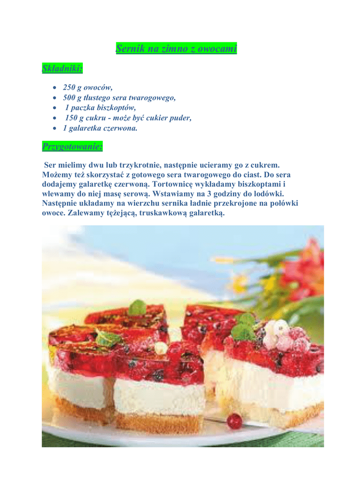 Sernik na zimno z owocami Składniki: 250 g owoców, 500 g tłustego sera twarogowego, 1 paczka biszkoptów, 150 g cukru - może być cukier puder, 1 galaretka czerwona. Przygotowanie: Ser mielimy dwu lub trzykrotnie, następnie ucieramy go z cukrem. Możemy też skorzystać z gotowego sera twarogowego do ciast. Do sera dodajemy galaretkę czerwoną. Tortownicę wykładamy biszkoptami i wlewamy do niej masę serową. Wstawiamy na 3 godziny do lodówki. Następnie układamy na wierzchu sernika ładnie przekrojone na połówki owoce. Zalewamy tężejącą, truskawkową galaretką.