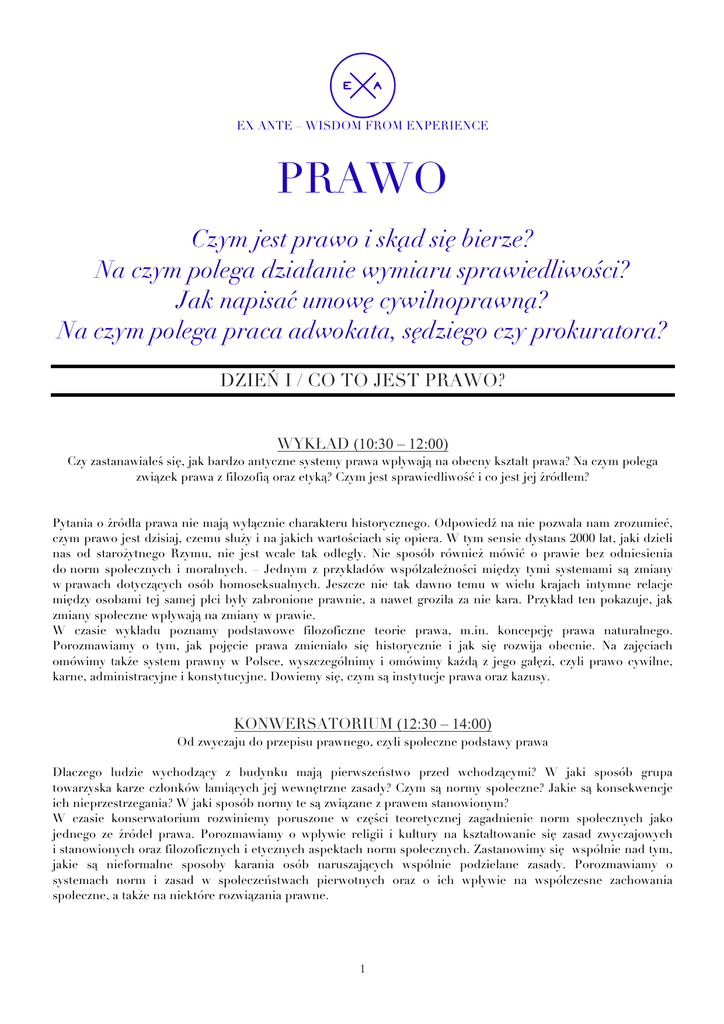 EX ANTE – WISDOM FROM EXPERIENCE PRAWO Czym jest prawo i skąd się bierze? Na czym polega działanie wymiaru sprawiedliwości? Jak napisać umowę cywilnoprawną? Na czym polega praca adwokata, sędziego czy prokuratora? DZIEŃ I / CO TO JEST PRAWO? WYKŁAD (10:30 – 12:00) Czy zastanawiałeś się, jak bardzo antyczne systemy prawa wpływają na obecny kształt prawa? Na czym polega związek prawa z filozofią oraz etyką? Czym jest sprawiedliwość i co jest jej źródłem? Pytania o źródła prawa nie mają wyłącznie charakteru historycznego. Odpowiedź na nie pozwala nam zrozumieć, czym prawo jest dzisiaj, czemu służy i na jakich wartościach się opiera. W tym sensie dystans 2000 lat, jaki dzieli nas od starożytnego Rzymu, nie jest wcale tak odległy. Nie sposób również mówić o prawie bez odniesienia do norm społecznych i moralnych. – Jednym z przykładów współzależności między tymi systemami są zmiany w prawach dotyczących osób homoseksualnych. Jeszcze nie tak dawno temu w wielu krajach intymne relacje między osobami tej samej płci były zabronione prawnie, a nawet groziła za nie kara. Przykład ten pokazuje, jak zmiany społeczne wpływają na zmiany w prawie. W czasie wykładu poznamy podstawowe filozoficzne teorie prawa, m.in. koncepcję prawa naturalnego. Porozmawiamy o tym, jak pojęcie prawa zmieniało się historycznie i jak się rozwija obecnie. Na zajęciach omówimy także system prawny w Polsce, wyszczególnimy i omówimy każdą z jego gałęzi, czyli prawo cywilne, karne, administracyjne i konstytucyjne. Dowiemy się, czym są instytucje prawa oraz kazusy. KONWERSATORIUM (12:30 – 14:00) Od zwyczaju do przepisu prawnego, czyli społeczne podstawy prawa Dlaczego ludzie wychodzący z budynku mają pierwszeństwo przed wchodzącymi? W jaki sposób grupa towarzyska karze członków łamiących jej wewnętrzne zasady? Czym są normy społeczne? Jakie są konsekwencje ich nieprzestrzegania? W jaki sposób normy te są związane z prawem stanowionym? W czasie konserwatorium rozwiniemy poruszone w części teoretycznej zagadnienie norm społecznych jako jednego ze źródeł prawa. Porozmawiamy o wpływie religii i kultury na kształtowanie się zasad zwyczajowych i stanowionych oraz filozoficznych i etycznych aspektach norm społecznych. Zastanowimy się wspólnie nad tym, jakie są nieformalne sposoby karania osób naruszających wspólnie podzielane zasady. Porozmawiamy o systemach norm i zasad w społeczeństwach pierwotnych oraz o ich wpływie na współczesne zachowania społeczne, a także na niektóre rozwiązania prawne. 1 WARSZTATY (15:00 – 16:30) Kazusy – przez nie uczymy się prawa Każdy student prawa, jeśli chce w przyszłości być dobrym prawnikiem, powinien cały czas konfrontować swoją wiedzę teoretyczną z podejściem proponowanym w kazusach – problemach, które należy rozstrzygnąć według zasad określonych przez prawo. Uczestnicy będą mieli okazję zmierzyć się z rozwiązywaniem kazusów – zarówno tych ze współczesnego orzecznictwa, jak i tych pochodzących z prawa rzymskiego. DZIEŃ II / PRAWO KARNE WYKŁAD (10:30 – 12:00) Dlaczego prawo karne jest niezbędne? Jak wyglądałby świat, gdyby nie było prawa karnego? Jaką pełni ono rolę w całym systemie prawnym? Jakie ma znaczenie dla funkcjonowania społeczeństwa? Na jakiej podstawie sędzia wymierza karę? Czy kara ma służyć przywróceniu ładu w społeczeństwie czy resocjalizacji skazanego? Dla większości z nas prawo karne to gwarant bezpieczeństwa, dla części, która łamie ustanowione zasady, jest za to źródłem opresji. W czasie wykładu opowiemy o systemie kar i środków karnych z perspektywy celów, jakie mają spełniać oraz różnic między poszczególnymi z nich. Porozmawiamy również o tym, jak kary zmieniały się na przestrzeni wieków i jakie przesłanki filozoficzno-moralne stoją za zniesieniem kary śmierci, a jakie za jej stosowaniem. Przywołamy klasyfikacje przestępstw oraz wyjaśnimy, czym jest społeczna szkodliwość czynu. Na koniec zastanowimy się nad problemami związanymi z praktycznym stosowaniem prawa karnego. Porozmawiamy m.in. o tym, jakie są uprawnienia policji, na jakiej podstawie funkcjonariusze mogą nas przeszukać, a na jakiej aresztować. KONWERSATORIUM (12:30 – 14:00) Zabierz głos w debacie publicznej. Podziel się swoimi opiniami. Prawo do życia czy prawo do wyboru? Za i przeciw karze śmierci. Czy w uzasadnionych przypadkach prawo może działać wstecz? W czasie debaty powrócimy do niektórych zagadnień z części teoretycznej. Na podstawie konkretnych przykładów dyskutować będziemy o tym, jak różne aspekty działania ludzi/zachowania społecznie postrzegane były w przeszłości i jak rozumiane są dzisiaj. Kwestiom takim, jak eutanazja, aborcja czy kara śmierci postaramy się jednak przyjrzeć z perspektywy prawnej, a nie moralnej. Będzie to również przyczynek do dyskusji na temat tego, czy rozdzielenie tych dwóch punktów widzenia jest możliwe. Zastanowimy się również nad tym, dlaczego system kar się zmienia oraz czy zaostrzenie kar jest skuteczne. WARSZTATY (15:00 – 16:30) Weź udział w symulacji rozprawy – doświadcz tego, jak wygląda wymiar sprawiedliwości w praktyce! W czasie zajęć praktycznych uczestnicy będą mieli okazję przeprowadzić symulację rozprawy sądowej. Wyposażeni w szczegółowe instrukcje oraz podzieleni na role będą musieli zmierzyć się ze sprawą sądową z perspektywy: sędziego, oskarżonego, adwokata i prokuratora. 2 DZIEŃ III / PRAWO CYWILNE WYKŁAD (10:30 – 12:00) W jaki sposób znajomość prawa cywilnego może nam się przydać w codziennym życiu? Czy kupując grę w sklepie, zawierzasz umowę cywilnoprawną? Czy ściągając film z Internetu, popełniasz przestępstwo? Co jest przedmiotem prawa cywilnego? Zawarcie związku małżeńskiego, udrażnianie kanałów przeciwpowodziowych, zakup nowego telewizora – wszy