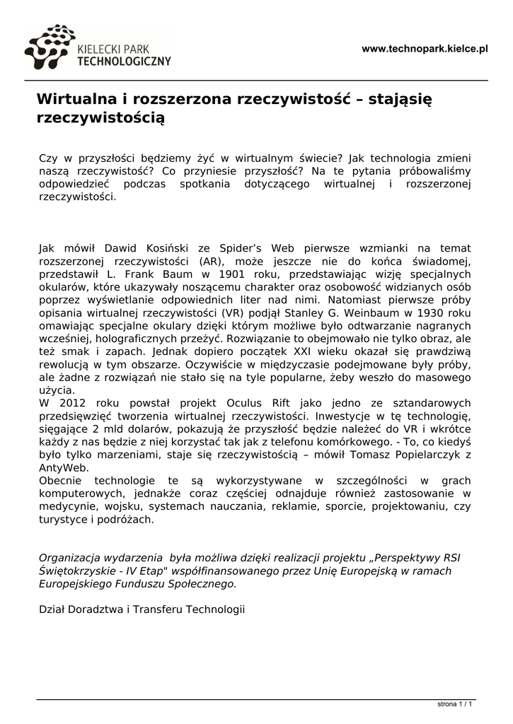 www.technopark.kielce.pl Wirtualna i rozszerzona rzeczywistość – stająsię rzeczywistością Czy w przyszłości będziemy żyć w wirtualnym świecie? Jak technologia zmieni naszą rzeczywistość? Co przyniesie przyszłość? Na te pytania próbowaliśmy odpowiedzieć podczas spotkania dotyczącego wirtualnej i rozszerzonej rzeczywistości. Jak mówił Dawid Kosiński ze Spider’s Web pierwsze wzmianki na temat rozszerzonej rzeczywistości (AR), może jeszcze nie do końca świadomej, przedstawił L. Frank Baum w 1901 roku, przedstawiając wizję specjalnych okularów, które ukazywały noszącemu charakter oraz osobowość widzianych osób poprzez wyświetlanie odpowiednich liter nad nimi. Natomiast pierwsze próby opisania wirtualnej rzeczywistości (VR) podjął Stanley G. Weinbaum w 1930 roku omawiając specjalne okulary dzięki którym możliwe było odtwarzanie nagranych wcześniej, holograficznych przeżyć. Rozwiązanie to obejmowało nie tylko obraz, ale też smak i zapach. Jednak dopiero początek XXI wieku okazał się prawdziwą rewolucją w tym obszarze. Oczywiście w międzyczasie podejmowane były próby, ale żadne z rozwiązań nie stało się na tyle popularne, żeby weszło do masowego użycia. W 2012 roku powstał projekt Oculus Rift jako jedno ze sztandarowych przedsięwzięć tworzenia wirtualnej rzeczywistości. Inwestycje w tę technologię, sięgające 2 mld dolarów, pokazują że przyszłość będzie należeć do VR i wkrótce każdy z nas będzie z niej korzystać tak jak z telefonu komórkowego. - To, co kiedyś było tylko marzeniami, staje się rzeczywistością – mówił Tomasz Popielarczyk z AntyWeb. Obecnie technologie te są wykorzystywane w szczególności w grach komputerowych, jednakże coraz częściej odnajduje również zastosowanie w medycynie, wojsku, systemach nauczania, reklamie, sporcie, projektowaniu, czy turystyce i podróżach. Organizacja wydarzenia była możliwa dzięki realizacji projektu „Perspektywy RSI Świętokrzyskie - IV Etap" współfinansowanego przez Unię Europejską w ramach Europejskiego Funduszu Społecznego. Dział Doradztwa i Transferu Technologii strona 1 / 1 Powered by TCPDF (www.tcpdf.org)