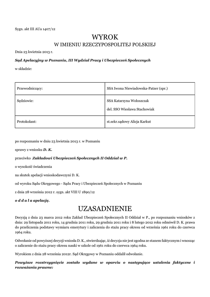 Sygn. akt III AUa 1407/12 WYROK W IMIENIU RZECZYPOSPOLITEJ POLSKIEJ Dnia 23 kwietnia 2013 r. Sąd Apelacyjny w Poznaniu, III Wydział Pracy i Ubezpieczeń Społecznych w składzie: Przewodniczący: SSA Iwona Niewiadowska-Patzer (spr.) Sędziowie: SSA Katarzyna Wołoszczak del. SSO Wiesława Stachowiak Protokolant: st.sekr.sądowy Alicja Karkut po rozpoznaniu w dniu 23 kwietnia 2013 r. w Poznaniu sprawy z wniosku D. K. przeciwko Zakładowi Ubezpieczeń Społecznych II Oddział w P. o wysokość świadczenia na skutek apelacji wnioskodawczyni D. K. od wyroku Sądu Okręgowego - Sądu Pracy i Ubezpieczeń Społecznych w Poznaniu z dnia 28 września 2012 r. sygn. akt VIII U 1890/12 o d d a l a apelację. UZASADNIENIE Decyzją z dnia 23 marca 2012 roku Zakład Ubezpieczeń Społecznych II Oddział w P., po rozpoznaniu wniosków z dnia: 29 listopada 2011 roku, 14 grudnia 2011 roku, 29 grudnia 2011 roku i 8 lutego 2012 roku odmówił D. K. prawa do przeliczenia podstawy wymiaru emerytury i zaliczenia do stażu pracy okresu od września 1961 roku do czerwca 1964 roku. Odwołanie od powyższej decyzji wniosła D. K., stwierdzając, iż decyzja nie jest zgodna ze stanem faktycznym i wnosząc o zaliczenie do stażu pracy okresu nauki w szkole od 1961 roku do czerwca 1964 roku. Wyrokiem z dnia 28 września 2012r. Sąd Okręgowy w Poznaniu oddalił odwołanie. Powyższe rozstrzygnięcie zostało wydane w oparciu o następujące ustalenia faktyczne i rozważania prawne: D. K. ma obecnie(...)lat. Decyzją z dnia 3 października 1991 roku Zakład Ubezpieczeń Społecznych Oddział w P. przyznał D. K. rentę inwalidzką. D. K. pobierała to świadczenie, a następnie rentę z tytułu niezdolności do pracy do dnia 31 października 2003 roku, gdyż decyzją z dnia 13 stycznia 2004 roku Zakład Ubezpieczeń Społecznych Oddział w P. przyznał D. K. emeryturę, podejmując jej wypłatę od dnia 1 listopada 2003 roku. Do ustalenia wysokości podstawy wymiaru świadczenie przyjęto podstawę wymiaru renty i wskaźnik wysokości podstawy wymiaru 68,87%. Organ rentowy uwzględnił przy ustalaniu wysokości emerytury 22 lata i 1 miesiąc, to jest 265 miesięcy okresów składkowych (1 grudnia 1965 roku do 30 kwietnia 1966 roku, 1 grudnia 1966 roku do 31 marca 1967 roku, 2 listopada 1967 roku do 9 czerwca 1969 roku, 16 czerwca 1969 roku do 2 sierpnia 1970 roku, 6 kwietnia 1973 roku do 1 września 1991 roku, 30 sierpnia 1993 roku do 30 listopada 1993 roku). D. K. nie zaskarżyła tej decyzji. Decyzją z dnia 30 stycznia 2004 roku, wydaną na skutek wniosku z dnia 19 stycznia 2004 roku Zakład Ubezpieczeń Społecznych Oddział w P. przeliczył emeryturę odwołującej od stycznia 2004 roku i do podstawy wymiaru świadczenia przyjął wynagrodzenie, które stanowiło podstawę wymiaru składek na ubezpieczenie społeczne z 10 lat kalendarzowych, to jest od dnia 1 stycznia 1983 roku do dnia 31 grudnia 1992 roku. Do poprzednio uwzględnionych 22 lat i 1 miesiąca okresów składkowych organ rentowy doliczył 2 lata i 8 miesięcy okresów nieskładkowych, to jest okres sprawowania opieki nad dzieckiem od dnia 3 sierpnia 1970 roku do dnia 4 maja 1973 roku. Decyzja z dnia 30 stycznia 2004 roku nie została przez D. K. zaskarżona. Wnioskiem z dnia 22 marca 2004 roku D. K. zwróciła się do organu rentowego o doliczenie do stażu pracy okresów zatrudnienia w gospodarstwie rolnym po ukończeniu przez nią 16 roku życia. Decyzją z dnia 7 kwietnia 2004 roku Zakład Ubezpieczeń Społecznych Oddział w P. odmówił doliczenia do stażu pracy okresu pracy w gospodarstwie rolnym. Decyzja ta nie została przez D. K. zaskarżona. Pismem z dnia 7 maja 2009 roku D. K. wystąpiła do Zakładu Ubezpieczeń Społecznych II Oddziału w P. ponownie o doliczenie jej do stażu ubezpieczeniowego jako okresów nieskładkowych pracy w gospodarstwie rolnym rodziców, to jest okresów od: 8 lutego 1963 roku do 30 listopada 1965 roku, 1 maja 1966 roku do 30 listopada 1966 roku, 1 kwietnia 1967 roku do 30 listopada 1967 roku. Decyzją z dnia 17 czerwca 2009 roku organ rentowy odmówił zaliczenia D. K. do stażu pracy okresu pracy w gospodarstwie rolnym u rodziców, to jest od: 8 lutego 1963 roku do 30 listopada 1965 roku, 1 maja 1966 roku do 30 listopada 1966 roku, 1 kwietnia 1967 roku do 30 listopada 1967 roku. Decyzją z dnia 21 lipca 2009 roku Zakład Ubezpieczeń Społecznych II Oddział w P. odmówił D. K. wznowienia postępowania w sprawie zaliczenia okresu pracy w gospodarstwie rolnym rodziców i uchylił decyzję z dnia 25 maja 2009 roku. Decyzje powyższe zostały zaskarżone przez D. K.. Postępowanie z odwołania od tych decyzji było prowadzone w Sądzie Okręgowym w Poznaniu w sprawie o sygnaturze akt VIII U 2360/09, po rozpoznaniu której w dniu 15 października 1009 roku zapadł wyrok, w którym umorzono postępowanie z odwołania od decyzji z dnia 17 czerwca 2009 roku oraz oddalono odwołanie od decyzji z dnia 21 lipca 2009 roku. Sąd Okręgowy oddalił odwołanie od decyzji z dnia 21 lipca 2009 roku z uwagi na nieprzedłużenie przez D. K. nowych dowodów i nieujawnienie przez nią okoliczności, które pozwoliłyby wznowić postępowanie zakończone prawomocną decyzją z dnia 7 kwietnia 2004 roku. Ubocznie Sąd wskazał, iż decyzja z dnia 7 kwietnia 2004 roku jest prawidłowa, bowiem nie było możliwe doliczenie do stażu pracy okresów pracy w gospodarstwie rolnym, gdyż uwzględnia się je tylko w przypadku konieczności uzupełnienia stażu do brakującego okresu ubezpieczenia, co w sprawie nie miało miejsca. Apelacja od powyższego wyroku została oddalona przez Sąd Apelacyjny w Poznaniu wyrokiem z dnia 20 maja 2010 roku. Pismem z dnia 29 listopada 2011 roku złożonym tego dnia w organie rentowym, D. K. zwróciła się do Zakładu Ubezpieczeń Społecznych II Oddziału w P. o przeliczenie emerytury na nowo i zaliczenie na podstawie zeznań świadków szkoły przysposobienia rolniczego oraz krawieckiego w okre