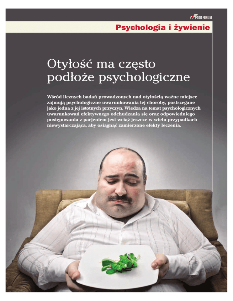 Psychologia i ¿ywienie Otyłość ma często podłoże psychologiczne Wśród licznych badań prowadzonych nad otyłością ważne miejsce zajmują psychologiczne uwarunkowania tej choroby, postrzegane jako jedna z jej istotnych przyczyn. Wiedza na temat psychologicznych uwarunkowań efektywnego odchudzania się oraz odpowiedniego postępowania z pacjentem jest wciąż jeszcze w wielu przypadkach niewystarczająca, aby osiągnąć zamierzone efekty leczenia. Psychologia ¿ywienia Oprac. Joanna Szymañska nia pożywienia. Zaburzenia monitorowania własnych zachowań prowadzą często do zwiększenia ilości przyjmowanych pokarmów, w ilości znacznie przekraczającej zapotrzebowanie energetyczne. dietetyk P Trudności z kontrolowaniem ilości pokarmów Oświetlone jedzenie zachęca sychologiczne aspekty nadwagi i otyłości mogą być niezwykle pomocne w wyjaśnieniu wielu mechanizmów zachowań związanych z jedzeniem. Na podstawie dostępnej literatury można wymienić wiele czynników ryzyka prowadzących do otyłości, które mają podłoże psychologiczne. Są to między innymi: zaburzone mechanizmy samoregulacji i monitorowania własnych zachowań, nieumiejętność radzenia sobie ze stresem, doświadczanie negatywnych emocji. Zaburzenia mechanizmu samoregulacji wiążą się z trudnościami w kontrolowaniu ilości przyjmowanego pokarmu. Proces samoregulacji obejmuje z jednej strony chęć do przyjmowania niekontrolowanej ilości pożywienia, a z drugiej strony siłę woli, która stara się temu zapobiegać. W wyniku badań stwierdzono, że u około 30 proc. osób, głównie otyłych, występuje nieumiejętność regulowania ilości przyjmowanych pokarmów. W wielu przypadkach u osób, które nadmiernie starają się kontrolować swoje zachowania żywieniowe (np. osób odchudzających się) mogą wystąpić zaburzenia samoregulacji, łącznie z utratą kontroli nad jedzeniem. Prowadzi to do przejadania się. Wykazano, ze osoby otyłe są bardziej wrażliwe na bodźce zewnętrzne takie jak smak, zapach i wygląd potrawy. Mają one także tendencję do spożywania większej ilości pokarmu w sytuacji występowania dużej ilości pożywienia, kiedy pożywienie jest łatwo dostępne i urozmaicone (np. na przyjęciach). W takich sytuacjach spożywanie pokarmów ma charakter automatyczny, odruchowy, niejako bez kontroli. Podobnie podczas oglądania telewizji, czy spędzania czasu w towarzystwie, gdy uwaga skierowana jest na inne bodźce a samoświadomość znacznie zredukowana. Osoby otyłe jedzą więcej także wtedy, kiedy jedzenie jest jasno oświetlone, w porównaniu z sytuacją, gdy pozostaje ono w cieniu i tak bardzo nie rzuca się w oczy. Widok i bliskość jedzenia mają większy wpływ niż głód. Kiedy bodźce wzrokowe nie są już tak wyraźne i kiedy w przygotowanie posiłku trzeba włożyć pewien trud – osoba otyła traci motywację do zdobywa- Niska samoocena prowadzi do otyłości Czynnikiem utrudniającym proces samoregulacji i przez to sprzyjającym nadmiernemu jedzeniu mogą być trudności z unikaniem myślenia o żywności. Im bardziej dana osoba stara się nie myśleć o żywności, tym większą odczuwa potrzebę jej spożywania. U osób przewlekle odchudzających się zaobserwowano zjawisko napadowego objadania – do takich zachowań dochodzi przy nieumiejętnym tłumieniu myśli o jedzeniu. Ograniczeniu samokontroli sprzyjać może także zmęczenie, występujące szczególnie pod koniec dnia, kiedy umiejętność kontroli ilości spożywanego jedzenia bywa ograniczona. Istotną rolę w kształtowaniu zachowań żywieniowych odgrywa też element samooceny. Niska lub nieadekwatna samoocena, przejawiająca się głównie w niezadowoleniu z własnego ciała, może prowadzić do pewnej patologii w zakresie zachowań żywieniowych. Często zdarza się, ze otyłość prowadzi do niezadowolenia z obrazu własnego ciała i niskiej samooceny, co z kolei powoduje zwiększony poziom stresu i obniżenie nastroju. Ich konsekwencją mogą być negatywne stany emocjonalne, takie jak rozczarowanie i brak satysfakcji, które mogą powodować spadek motywacji i poczucie braku skuteczności własnych działań w osiąganiu celów dotyczących własnego ciała i w końcowym efekcie sprzyjać rozwojowi depresji. Ostatecznie ma to negatywny wpływ na zachowania prozdrowotne, takie jak prawidłowa dieta i aktywność fizyczna. Spożywanie nadmiernej ilości pożywienia prowadzi do zwiększonej masy ciała, a to z kolei jeszcze bardziej pogarsza samopoczucie wywołując poczucie winy i obniżając samoocenę. Przejadanie się jest często środkiem uspokajającym, przywracającym emocjonalną równowagę i poprawiającym nastrój. Jest sposobem rekompensaty za życiowe niepowodzenia, frustracje i lęki. Stres, a dokładniej rzecz biorąc nieumiejętne radzenie sobie z nim w różnych sytuacjach, w dużej mierze są odpowiedzialne za 126 Psychologia ¿ywienia występowanie nieprawidłowych zachowań związanych z jedzeniem, polegających najczęściej na dostarczaniu organizmowi więcej energii niż wynosi jego rzeczywiste zapotrzebowanie. Często zdarza się, że jedzenie jest formą odwrócenia uwagi od trudnej sytuacji, a zjadanie większej ilości pożywienia jest formą radzenia sobie z problemami. Czasem też stanowi rodzaj rekompensaty za osobiste „krzywdy”. Przeprowadzono szereg badań nad wpływem negatywnych stanów emocjonalnych, takich jak depresja czy lęk na zachowania żywieniowe osób otyłych i tych o prawidłowej masie ciała. Znaczna większość z tych badań wykazuje wpływ negatywnych emocji na przejadanie się – szczególnie w odniesieniu do osób otyłych. Osoby otyłe przejadają się w stanach niepokoju, lęku, depresji czy złości, ponieważ czynność jedzenia redukuje te stany. Ponadto osoby otyłe nie są zdolne do rozróżnienia między stanem głodu i niepokoju, ponieważ nauczyły się jeść w odpowiedzi zarówno na niepokój, jak i odczucie 