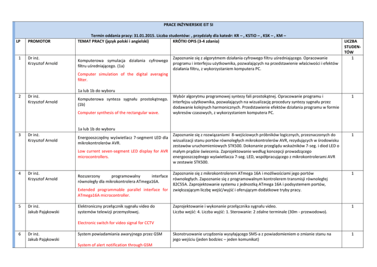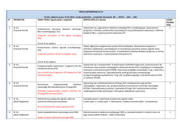 PRACE INŻYNIERSKIE EiT SI LP 1 PROMOTOR Dr inż. Krzysztof Arnold Termin oddania pracy: 31.01.2015. Liczba studentów: , przydziały dla katedr: KR – , KSTiO – , KSK – , KM – TEMAT PRACY (język polski i angielski) KRÓTKI OPIS (3-4 zdania) Komputerowa symulacja działania cyfrowego filtru uśredniającego. (1a) Zapoznanie się z algorytmem działania cyfrowego filtru uśredniającego. Opracowanie programu i interfejsu użytkownika, pozwalających na przedstawienie właściwości i efektów działania filtru, z wykorzystaniem komputera PC. LICZBA STUDENTÓW 1 Computer simulation of the digital averaging filter. 1a lub 1b do wyboru 2 Dr inż. Krzysztof Arnold Komputerowa synteza sygnału prostokątnego. (1b) Computer synthesis of the rectangular wave. Wybór algorytmu programowej syntezy fali prostokątnej. Opracowanie programu i interfejsu użytkownika, pozwalających na wizualizację procedury syntezy sygnału przez dodawanie kolejnych harmonicznych. Przedstawienie efektów działania programu w formie wykresów czasowych, z wykorzystaniem komputera PC. 1 Zapoznanie się z rozwiązaniami 8-wejściowych próbników logicznych, przeznaczonych do wizualizacji stanu portów równoległych mikrokontrolerów AVR, rezydujących w środowisku zestawów uruchomieniowych STK500. Dokonanie przeglądu wskaźników 7-seg. i diod LED o małym prądzie świecenia. Zaprojektowanie według koncepcji prowadzącego energooszczędnego wyświetlacza 7-seg. LED, współpracującego z mikrokontrolerami AVR w zestawie STK500. 1 Zapoznanie się z mikrokontrolerem ATmega 16A i możliwościami jego portów równoległych. Zapoznanie się z programowalnym kontrolerem transmisji równoległej 82C55A. Zaprojektowanie systemu z jednostką ATmega 16A i podsystemem portów, zwiększającym liczbę wejść/wyjść i oferującym dodatkowe tryby pracy. 1 Zaprojektowanie i wykonanie przełącznika sygnału video. Liczba wejść: 4. Liczba wyjść: 1. Sterowanie: 2 zdalne terminale (30m - przewodowo). 1 Skonstruowanie urządzenia wysyłającego SMS-a z powiadomieniem o zmianie stanu na jego wejściu (jeden bodziec – jeden komunikat) 1 1a lub 1b do wyboru 3 Dr inż. Krzysztof Arnold Energooszczędny wyświetlacz 7-segment LED dla mikrokontrolerów AVR. Low current seven-segment LED display for AVR microcontrollers. 4 Dr inż. Krzysztof Arnold Rozszerzony programowalny interface równoległy dla mikrokontrolera ATmega16A. Extended programmable parallel interface for ATmega16A microcontroller. 5 Dr inż. Jakub Pająkowski Elektroniczny przełącznik sygnału video do systemów telewizji przemysłowej. Electronic switch for video signal for CCTV 6 Dr inż. Jakub Pająkowski System powiadamiania awaryjnego przez GSM System of alert notification through GSM 7 8 9 Dr inż. Jakub Pająkowski Dr inż. Jakub Pająkowski Dr inż. Piotr Stępczak Regulowane źródło prądowe z polem odczytowym Adjustable current source with a display Przekaźnik internetowy wielokanałowy Multi-channel Internet relay Ocena pasma transmisyjnego systemu światłowodowego – stanowisko pomiarowe. Evaluation bandwidth fiber optic system - test bench. 10 Dr inż. Piotr Stępczak Sterownik diody laserowej z modulacją bezpośrednią. 11 Dr inż. Krzysztof Malczewski Laser diode driver with direct modulation. Narzędzia typu DAW, ich standardy, narzędzia i wtyczki. 12 13 14 Dr inż. Sławomir Michalak Dr inż. Sławomir Michalak Dr inż. Sławomir Michalak DAW software applications, their standards, tools and plugins Sterownik nadajnika ARDF. A controller for an ARDF transmitter. Wyświetlacz LCD z układem CPLD. LCD display with CPLD. GPS z systemem QTH-locator. GPS with QTH-locator system. 15 Dr inż. Sławomir Michalak Moduł wyświetlaczy z magistralą SPI. LEDs display module with SPI bus. 16 Dr inż. Michał Maćkowski Aplikacja do systemów pomiarowych dla urządzeń z systemem Android. The measuring systems application for Android devices. Zaprojektowanie i wykonanie źródła prądowego z polem odczytowym LED. Nastawa prądu przy użyciu potencjometru wieloobrotowego. 1 Przegląd istniejących rozwiązań. Oprogramowanie 6 kanałowego przełącznika internetowego. 1 Opracowanie stanowiska do pomiaru pasma transmisyjnego łącza optycznego z możliwością oceny poszczególnych modułów wchodzących w skład systemu. Zaplanowanie badań oceny pasma systemu światłowodowego oraz poszczególnych jego komponentów. Praca projektowo – konstrukcyjna. 1 Opracowanie sterownika diody laserowej z zabezpieczeniem prądowym realizującego wysterowanie punktu pracy diody oraz modulację bezpośrednią w paśmie do 20MHz. Układ powinien umożliwiać modulację diody sygnałem analogowym oraz cyfrowym. Praca projektowo – konstrukcyjna. Celem pracy jest opis systemów przeznaczonych do nagrywania, edycji i odtwarzania dźwięku. `1 W oparciu o mikrokontroler AVR zaprojektować i uruchomić układ wysyłający zadaną sekwencję znaków do zastosowań ARDF. Zaprojektować obwód drukowany i przetestować działanie układu w warunkach terenowych. Praca projektowo-konstrukcyjna. Zaprogramować obsługę wyświetlacza LCD (2x16) z wykorzystaniem układów reprogramowalnych CPLD (Xilinx). Przeprowadzić symulacje komputerowe (Verilog), wykonać i przetestować układ. Praca projektowo-konstrukcyjna. Zaprojektować i uruchomić układ z modułem GPS prezentujący aktualne położenie w postaci współrzędnych długości i szerokości geograficznej oraz w postaci lokatorów systemu MLS (QTH). Praca projektowo-konstrukcyjna. 1 Zaprojektować obwód drukowany do modułu wyświetlacza 4x7-segment z magistralą SPI. Wykonać i uruchomić układ, przetestować działanie z zestawem edukacyjnym STK-500. Zaproponować programy demonstrujące pracę układu. Praca konstrukcyjna. 1 Celem pracy jest napisanie oprogramowania na urządzenia z systemem operacyjnym Android, dla zapewnienia zdalnej kontroli systemu pomiarowego. Urządzenie przez Internet łączy si