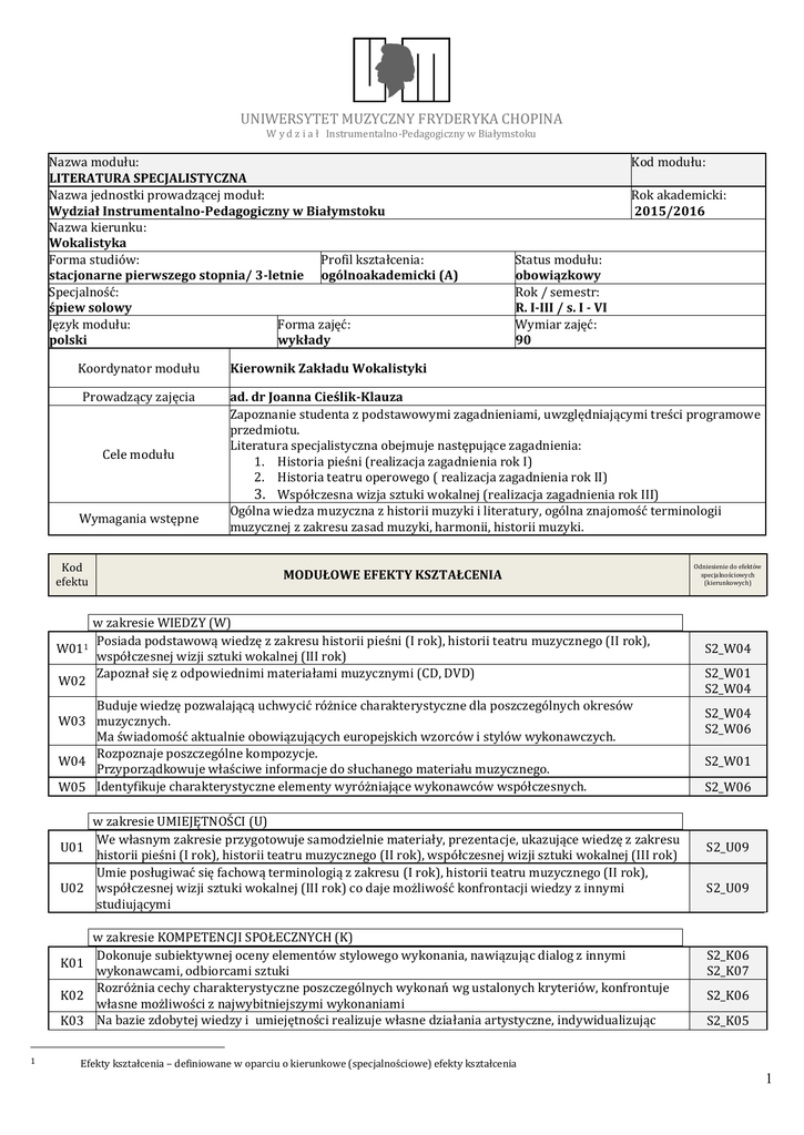 UNIWERSYTET MUZYCZNY FRYDERYKA CHOPINA W y d z i a ł Instrumentalno-Pedagogiczny w Białymstoku Nazwa modułu: LITERATURA SPECJALISTYCZNA Nazwa jednostki prowadzącej moduł: Wydział Instrumentalno-Pedagogiczny w Białymstoku Nazwa kierunku: Wokalistyka Forma studiów: Profil kształcenia: stacjonarne pierwszego stopnia/ 3-letnie ogólnoakademicki (A) Specjalność: śpiew solowy Język modułu: Forma zajęć: polski wykłady Koordynator modułu Prowadzący zajęcia Cele modułu Wymagania wstępne Kod efektu Kod modułu: Rok akademicki: 2015/2016 Status modułu: obowiązkowy Rok / semestr: R. I-III / s. I - VI Wymiar zajęć: 90 Kierownik Zakładu Wokalistyki ad. dr Joanna Cieślik-Klauza Zapoznanie studenta z podstawowymi zagadnieniami, uwzględniającymi treści programowe przedmiotu. Literatura specjalistyczna obejmuje następujące zagadnienia: 1. Historia pieśni (realizacja zagadnienia rok I) 2. Historia teatru operowego ( realizacja zagadnienia rok II) 3. Współczesna wizja sztuki wokalnej (realizacja zagadnienia rok III) Ogólna wiedza muzyczna z historii muzyki i literatury, ogólna znajomość terminologii muzycznej z zakresu zasad muzyki, harmonii, historii muzyki. MODUŁOWE EFEKTY KSZTAŁCENIA w zakresie WIEDZY (W) Posiada podstawową wiedzę z zakresu historii pieśni (I rok), historii teatru muzycznego (II rok), W011 współczesnej wizji sztuki wokalnej (III rok) Zapoznał się z odpowiednimi materiałami muzycznymi (CD, DVD) W02 Buduje wiedzę pozwalającą uchwycić różnice charakterystyczne dla poszczególnych okresów W03 muzycznych. Ma świadomość aktualnie obowiązujących europejskich wzorców i stylów wykonawczych. Rozpoznaje poszczególne kompozycje. W04 Przyporządkowuje właściwe informacje do słuchanego materiału muzycznego. W05 Identyfikuje charakterystyczne elementy wyróżniające wykonawców współczesnych. w zakresie UMIEJĘTNOŚCI (U) We własnym zakresie przygotowuje samodzielnie materiały, prezentacje, ukazujące wiedzę z zakresu U01 historii pieśni (I rok), historii teatru muzycznego (II rok), współczesnej wizji sztuki wokalnej (III rok) Umie posługiwać się fachową terminologią z zakresu (I rok), historii teatru muzycznego (II rok), U02 współczesnej wizji sztuki wokalnej (III rok) co daje możliwość konfrontacji wiedzy z innymi studiującymi w zakresie KOMPETENCJI SPOŁECZNYCH (K) Dokonuje subiektywnej oceny elementów stylowego wykonania, nawiązując dialog z innymi K01 wykonawcami, odbiorcami sztuki Rozróżnia cechy charakterystyczne poszczególnych wykonań wg ustalonych kryteriów, konfrontuje K02 własne możliwości z najwybitniejszymi wykonaniami K03 Na bazie zdobytej wiedzy i umiejętności realizuje własne działania artystyczne, indywidualizując 1 Odniesienie do efektów specjalnościowych (kierunkowych) S2_W04 S2_W01 S2_W04 S2_W04 S2_W06 S2_W01 S2_W06 S2_U09 S2_U09 S2_K06 S2_K07 S2_K06 S2_K05 Efekty kształcenia – definiowane w oparciu o kierunkowe (specjalnościowe) efekty kształcenia 1 przesłanie dla odbiorcy TREŚCI PROGRAMOWE MODUŁU Semestr I 1. Rozwój formy pieśni w ujęciu historycznym 2. Wybitni interpretatorzy pieśni 3. Rola pianisty w kreowaniu formy pieśni 4. Pieśń klasyczna Semestr II 5. Pieśń w okresie romantyzmu 6. Pieśń XX wieku Semestr III 7. Historia teatru operowego w ujęciu historycznym 8. Najwybitniejsze postaci teatru operowego 9. Opera barokowa 10. Opera w okresie klasycznym Semestr IV 11. Teatr operowy w okresie romantyzmu 12. XX wiek – różnorodność form teatru operowego 13. Historyczne realizacje sceniczne Semestr V 14. Historia nagrań wokalnych audio 15. Historia nagrań operowych DVD Semestr VI 16. Najważniejsze festiwale operowe 17. Historia liczących się teatrów operowych 18. Znaczące konkursy wokalne Treści programowe wzajemnie się przenikają, większość z nich obecna jest na każdym etapie kształcenia Liczba godzin 3 4 3 5 Liczba godzin 8 7 Liczba godzin 3 4 4 4 Liczba godzin 5 5 5 Liczba godzin 7 8 Liczba godzin 5 5 5 Metody kształcenia 1. 2. 3. 4. 5. Wykład problemowy Wykład konwersatoryjny Prezentacje multimedialne (prowadzącego zajęcia i studentów) Prezentacja nagrań CD, DVD Testy, dyskusje Weryfikacja efektów kształcenia Metody weryfikacji 1. 2. 3. 4. 5. Nr efektu2 Kolokwium pisemne / semestr I, III, V Egzamin (słuchowy, pisemny) / semestr II, IV, VI Projekt, prezentacja Realizacja zleconego zadania Testy, dyskusje W01, W02, W03, W04, W05, U02 W02, W03, W04, W05, U02 W01, W03, W04, W05, U01, U02, K01, K02, K03 W01, W03, W04, W05, U01, U02, K01, K02, K03 W01, W02, W03, W04, W05, U01, U02, K01, K02 Korelacja efektów kształcenia z treściami i metodami kształcenia oraz metodami ich weryfikacji 3 Nr efektu kształcenia W01 W02 W03 W04 W05 Treści kształcenia 1-18 1-18 1-18 1-18 1-6, 8-15 Metody kształcenia 1, 2, 3, 4, 5 3,4 1, 2, 3, 4, 5 1, 2, 3, 4, 5 1, 2, 3, 4, 5 Metody weryfikacji 1, 3, 4, 5 1, 2, 5 1, 2, 3, 4, 5 1, 2, 3, 4, 5 1, 2, 3, 4, 5 2 odnosimy się do uprzednio sformułowanych przez nas efektów kształcenia należy podać numer efektu kształcenia, numery odpowiednich zakresów treści kształcenia oraz przyporządkować im metody kształcenia i weryfikacji (podać numery) 3 2 U01 U02 K01 K02 K03 1-18 1-18 1-6, 11-18 1-6, 11-18 1-18 3, 4 1, 2, 3, 4, 5 1, 2, 3, 4, 5 1, 2, 3, 4, 5 1, 2, 3, 4, 5 3, 4, 5 1, 2, 3, 4, 5 3, 4, 5 3, 4, 5 3, 4 Forma zaliczenia Zaliczenie przedmiotu uwarunkowane jest uczęszczaniem na zajęcia oraz osiągnięciem założonych efektów kształcenia w minimalnym akceptowalnym stopniu >50%. Studenci otrzymują listę dzieł muzycznych, z którymi powinni się zapoznać na zaliczenie danego semestru. Podczas egzaminu dodatkowo opisują zagadnienia, odpowiadające przykładom muzycznym. Literatura podstawowa 1. Stefan Jarociński Mozart PWM 2. Stefania Łobaczewska Beethoven PWM 3. Tadeusz Marek Schubert PWM 4. Bohdan Pociej Wagner PWM 5. Ludwik Erhardt Brahms PWM 6. Bohdan Pociej Mahler PWM 7. Stefan Jar