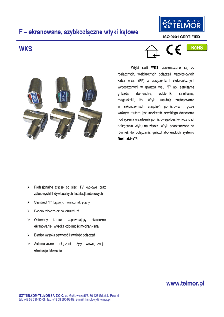 F – ekranowane, szybkozł czne wtyki k towe ISO 9001 CERTIFIED RoHS WKS Wtyki serii WKS przeznaczone s rozł cznych, wielokrotnych poł cze do współosiowych kabla w.cz. (RF) z urz dzeniami elektronicznymi wyposa onymi w gniazda typu "F" np. satelitarne gniazda abonenckie, rozgał niki, itp. odbiorniki Wtyki znajduj satelitarne, zastosowanie w zako czeniach urz dze pomiarowych, gdzie wa nym atutem jest mo liwo szybkiego doł czenia i odł czenia urz dzenia pomiarowego bez konieczno ci nakr cania wtyku na zł cze. Wtyki przeznaczone s równie do doł czania gniazd abonenckich systemu RadiusMaxTM. Profesjonalne zł cze do sieci TV kablowej oraz zbiorowych i indywidualnych instalacji antenowych Standard "F", k towy, monta nakr cany Pasmo robocze a do 2400MHz! Odlewany korpus zapewniaj cy ekranowanie i wysok odporno Bardzo wysoka pewno Automatyczne mechaniczn i trwało poł czenie skuteczne yły poł cze wewn trznej – eliminacja lutowania www.telmor.pl GZT TELKOM-TELMOR SP. Z O.O, ul. Mickiewicza 5/7, 80-425 Gda sk, Poland tel. +48 58 690-93-09, fax. +48 58 690-93-89, e-mail: [email protected] PARAMETRY TECHNICZNE TYP PARAMETRY ELEKTRYCZNE Zakres cz stotliwo ci pracy Współczynnik ekranowania Tłumienie odbi Impedancja PARAMETRY MECHANICZNE Zakres zewn trznych rednic kabla Zalecany typ kabla koncentrycznego Sposób monta u wtyku do kabla Poł czenie yły wewn trznej Barwa pier cienia oznaczeniowego WKS-105 WKS-106 WKS-107 MHz dB dB 2400 90 37…15 75 2400 90 35…10 75 2400 90 35…10 75 mm 5,9…6,3 6,6…6,9 6,9…7,3 / RG-59 RG-6 PRG-7 / / / nakr cane nakr cane automatyczne (mechanizm dociskowy) zielony nakr cane czerwony Parametry techniczne mog ulec zmianie bez wcze niejszego powiadomienia. GZT TELKOM-TELMOR SP. Z O.O, ul. Mickiewicza 5/7, 80-425 Gda sk, Poland tel. +48 58 690-93-09, fax. +48 58 690-93-89, e-mail: [email protected] niebieski www.telmor.pl