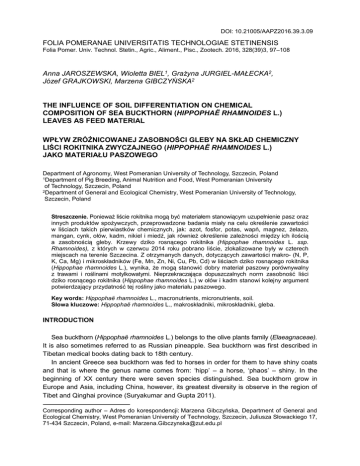 DOI: 10.21005/AAPZ2016.39.3.09 FOLIA POMERANAE UNIVERSITATIS TECHNOLOGIAE STETINENSIS Folia Pomer. Univ. Technol. Stetin., Agric., Aliment., Pisc., Zootech. 2016, 328(39)3, 97–108 Anna JAROSZEWSKA, Wioletta BIEL1, Grażyna JURGIEL-MAŁECKA2, Józef GRAJKOWSKI, Marzena GIBCZYŃSKA2* THE INFLUENCE OF SOIL DIFFERENTIATION ON CHEMICAL COMPOSITION OF SEA BUCKTHORN (HIPPOPHAË RHAMNOIDES L.) LEAVES AS FEED MATERIAL WPŁYW ZRÓŻNICOWANEJ ZASOBNOŚCI GLEBY NA SKŁAD CHEMICZNY LIŚCI ROKITNIKA ZWYCZAJNEGO (HIPPOPHAË RHAMNOIDES L.) JAKO MATERIAŁU PASZOWEGO Department of Agronomy, West Pomeranian University of Technology, Szczecin, Poland 1Department of Pig Breeding, Animal Nutrition and Food, West Pomeranian University of Technology, Szczecin, Poland 2Department of General and Ecological Chemistry, West Pomeranian University of Technology, Szczecin, Poland Streszczenie. Ponieważ liście rokitnika mogą być materiałem stanowiącym uzupełnienie pasz oraz innych produktów spożywczych, przeprowadzone badania miały na celu określenie zawartości w liściach takich pierwiastków chemicznych, jak: azot, fosfor, potas, wapń, magnez, żelazo, mangan, cynk, ołów, kadm, nikiel i miedź, jak również określenie zależności między ich ilością a zasobnością gleby. Krzewy dziko rosnącego rokitnika (Hippophae rhamnoides L. ssp. Rhamnoides), z których w czerwcu 2014 roku pobrano liście, zlokalizowane były w czterech miejscach na terenie Szczecina. Z otrzymanych danych, dotyczących zawartości makro- (N, P, K, Ca, Mg) i mikroskładników (Fe, Mn, Zn, Ni, Cu, Pb, Cd) w liściach dziko rosnącego rokitnika (Hippophae rhamnoides L.), wynika, że mogą stanowić dobry materiał paszowy porównywalny z trawami i roślinami motylkowatymi. Nieprzekraczająca dopuszczalnych norm zasobność liści dziko rosnącego rokitnika (Hippophae rhamnoides L.) w ołów i kadm stanowi kolejny argument potwierdzający przydatność tej rośliny jako materiału paszowego. Key words: Hippophaë rhamnoides L., macronutrients, micronutrients, soil. Słowa kluczowe: Hippophaë rhamnoides L., makroskładniki, mikroskładniki, gleba. INTRODUCTION Sea buckthorn (Hippophaë rhamnoides L.) belongs to the olive plants family (Elaeagnaceae). It is also sometimes referred to as Russian pineapple. Sea buckthorn was first described in Tibetan medical books dating back to 18th century. In ancient Greece sea buckthorn was fed to horses in order for them to have shiny coats and that is where the genus name comes from: ‘hipp’ – a horse, ‘phaos’ – shiny. In the beginning of XX century there were seven species distinguished. Sea buckthorn grow in Europe and Asia, including China, however, its greatest diversity is observe in the region of Tibet and Qinghai province (Suryakumar and Gupta 2011). Corresponding author – Adres do korespondencji: Marzena Gibczyńska, Department of General and Ecological Chemistry, West Pomeranian University of Technology, Szczecin, Juliusza Słowackiego 17, 71-434 Szczecin, Poland, e-mail: [email protected] 98 A. Jaroszewska et al. Sea buckthorn is an Eurasian plant, but it is Asia where it acquired the widest occurrence range. Its occurrence in Europe is relatively small in compared to the East. There are two subspecies of sea buckthorn distinguished: Hippophae rhamnoides subsp. maritima, which is characteristic for Salicion arenarieae in the classification of plant communities plant communities and Hippophae rhamnoides subsp. rhamnoides, which is a thorny shrub with raised stiff branches and dense inflorescences. It is a characteristic shrub of sand dunes and dune valleys on the sandy coasts of the Northern Sea and the Baltic Sea (Dulf 2012). In Poland it can be found on rocky hillsides, sandy coastal cliffs, dry river valleys, gravel pits, bright pine forests or road slopes. The increase of the interest in sea buckthorn is associated with the possibility of its introduction onto fallow lands and industrial areas as well as forests due to its beautiful and valuable fruit, which possess high nutritional and pro-health properties. The fruit contain high quantities of C and E vitamins, some of the B vitamins and provitamin A, as well as organic acids and free amino acids (Ahmad and Ali 2013; Lācis and Kota-Dombrovska 2014). The fruit juice contains 24 elements including nitrogen, phosphorus, iron, manganese, boron, calcium and silicone. The fruit flesh and seeds contain even 12% of oil, which is rich in palmitic, myristic, stearic, oleic, linoleic and linolenic acids (Yang and Kallio 2006; Alam and Ijaz 2009; Pop et al. 2014). Additionally, the fruit also contain carotene, flawonoids and alkaloids (Zadernowski et al. 2005; Fatima et al. 2012; Giuffrida et al. 2012; Magnuszewska and Krogulec 2013; Tulsawani et al. 2013). Zeb and Malook (2009) emphasize that all parts of sea buckthorn are good sources of high quantity bioactive substances. Sea buckthorn leaves can be a valuable supplement for animal feed as well as food products. Grey-green leaves of the bushes are delicate and decorative, the leaves are arranged spirally, they are lanceolate and narrow and have short stalks. They have smooth edges and are covered with soft, silvery hair, grey-green on the top side and silvery at the bottom side. The leaves are up to 7 cm long and 1 cm wide and have slightly curved edges (Suryakumar and Gupta 2011). In their research on six different sea buckthorn varieties from the Carpathia Mountains (Hippophae rhamnoides L. ssp. carpatica) Pop et al. (2014) discovered that the total carotenoids in leaves ranged between 3.5 and 4.2 mg ⋅ 100 g–1 DM. They included lutein, β-carotene, violaxantine and neoxanthin. Several studies conducted in India and China indicated that aqueous extracts derived from dried sea buckthorn leaves contain significant quantities of anti-oxidants, which exhibit immunomodulatory and anti-inflammatory properties, as well as phenols (Saggu et al. 2007; Saini et al. 2010; Kuma
