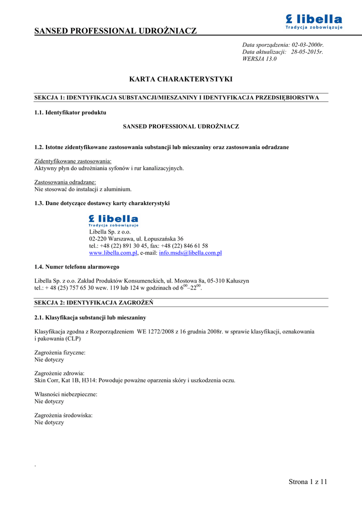 SANSED PROFESSIONAL UDROŻNIACZ __ Data sporządzenia: 02-03-2000r. Data aktualizacji: 28-05-2015r. WERSJA 13.0 KARTA CHARAKTERYSTYKI SEKCJA 1: IDENTYFIKACJA SUBSTANCJI/MIESZANINY I IDENTYFIKACJA PRZEDSIĘBIORSTWA 1.1. Identyfikator produktu SANSED PROFESSIONAL UDROŻNIACZ 1.2. Istotne zidentyfikowane zastosowania substancji lub mieszaniny oraz zastosowania odradzane Zidentyfikowane zastosowania: Aktywny płyn do udrożniania syfonów i rur kanalizacyjnych. Zastosowania odradzane: Nie stosować do instalacji z aluminium. 1.3. Dane dotyczące dostawcy karty charakterystyki Libella Sp. z o.o. 02-220 Warszawa, ul. Łopuszańska 36 tel.: +48 (22) 891 30 45, fax: +48 (22) 846 61 58 www.libella.com.pl, e-mail: [email protected] 1.4. Numer telefonu alarmowego Libella Sp. z o.o. Zakład Produktów Konsumenckich, ul. Mostowa 8a, 05-310 Kałuszyn tel.: + 48 (25) 757 65 30 wew. 119 lub 124 w godzinach od 600–2200. SEKCJA 2: IDENTYFIKACJA ZAGROŻEŃ 2.1. Klasyfikacja substancji lub mieszaniny Klasyfikacja zgodna z Rozporządzeniem WE 1272/2008 z 16 grudnia 2008r. w sprawie klasyfikacji, oznakowania i pakowania (CLP) Zagrożenia fizyczne: Nie dotyczy Zagrożenie zdrowia: Skin Corr, Kat 1B, H314: Powoduje poważne oparzenia skóry i uszkodzenia oczu. Własności niebezpieczne: Nie dotyczy Zagrożenia środowiska: Nie dotyczy . Strona 1 z 11 SANSED PROFESSIONAL UDROŻNIACZ __ 2.2. Elementy oznakowania Znak ostrzegawczy: Hasło ostrzegawcze: NIEBEZPIECZENSTWO Zwroty wskazujące rodzaj zagrożenia: H314 – Powoduje poważne oparzenia skóry i uszkodzenia oczu. Zwroty określające warunki bezpiecznego stosowania: P102 – Chronić przed dziećmi. P101 – W razie konieczności zasięgnięcia porady lekarza należy pokazać pojemnik lub etykietę. P103 – Przed użyciem przeczytać etykietę. P264 – Dokładnie umyć ręce po użyciu. P280 – Stosować rękawice ochronne /odzież ochronną/ochronę oczu/ochronę twarzy. P304+P340 – W PRZYPADKU DOSTANIA SIĘ DO DRÓG ODDECHOWYCH: wyprowadzić lub wynieść poszkodowanego na świeże powietrze i zapewnić mu warunki do swobodnego oddychania. P305 + P351 + P338 – W PRZYPADKU DOSTANIA SIĘ DO OCZU: Ostrożnie płukać wodą przez kilka minut. Wyjąć soczewki kontaktowe, jeżeli są i można je łatwo usunąć. Nadal płukać. P303 + P361 + P353 – W PRZYPADKU KONTAKTU ZE SKÓRĄ (lub z włosami): Natychmiast zdjąć całą zanieczyszczoną odzież. Spłukać skórę pod strumieniem wody/prysznicem. P363 – Wyprać zanieczyszczoną odzież przed ponownym użyciem. P301 + P330 + P331 – W PRZYPADKU POŁKNIĘCIA: Wypłukać usta. NIE wywoływać wymiotów. P310 – Natychmiast skontaktować się z OŚRODKIEM ZATRUĆ/lekarzem P405- Przechowywać pod zamknięciem. P501 – Zawartość /pojemnik usuwać do odpadów zgodnie z przepisami lokalnymi/regionalnymi/ krajowymi/międzynarodowymi. Informacje dodatkowe: SANSED UDROŻNIACZ zawiera między innymi : wodorotlenek sodu. 2.3. Inne zagrożenia Brak informacji na temat spełnienia kryteriów PBT lub vPvB zgodnie z załącznikiem XIII rozporządzenia REACH. Odpowiednie badania nie były przeprowadzone. SEKCJA 3: SKŁAD/INFORMACJA O SKŁADNIKACH 3.1. Substancje Nie dotyczy. Strona 2 z 11 SANSED PROFESSIONAL UDROŻNIACZ __ 3.2. Mieszaniny Nazwa składnika/ Numer indeksowy Zakres stężeń [%] Wodorotlenek sodu (011-002-00-6) Klasyfikacja (WE) 1272/2008 ≥5 Numer CAS Numer WE Numer rejestracji 1310-73-2 215-185-5 01211945789227-XXXX Skin Corr.1A, H314 Met. Corr. 1, H290 Informacje dodatkowe: Pełny tekst zwrotów H: patrz sekcja 16 SEKCJA 4: ŚRODKI PIERWSZEJ POMOCY 4.1. Opis środków pierwszej pomocy Przez drogi oddechowe: W razie narażenia inhalacyjnego wyprowadzić poszkodowanego z miejsca narażenia. Chronić przed utratą ciepła. W razie duszności podawać tlen. Zapewnić pomoc medyczną. Kontakt ze skórą: Zdjąć zanieczyszczoną odzież i obuwie. Miejsca narażone na kontakt lub tylko podejrzane o kontakt z produktem umyć dużą ilością wody, najlepiej bieżącej. W przypadku utrzymywania się dolegliwości zasięgnąć porady lekarza. Kontakt z oczami: Wyjąć szkła kontaktowe. Przemywać oczy dużą ilością bieżącej wody przez ok. 10 min, unikając silnego strumienia wody ze względu na możliwość mechanicznego uszkodzenia rogówki. Zasięgnąć porady lekarza okulisty. Spożycie: Poszkodowanemu nie podawać nic do picia. Nie wywoływać wymiotów. Zapewnić pomoc lekarską. W przypadku pojawienia się lub utrzymywania się dolegliwości powstałych wskutek narażenia na działanie SANSED professional UDROŻNIACZ, należy zapewnić poszkodowanemu pomoc lekarską. Należy usunąć źródło narażenia i przenieść poszkodowanego z miejsca narażenia. 4.2. Najważniejsze ostre i opóźnione objawy oraz skutki Przez drogi oddechowe: Mogą wystąpić duszności. Kontakt z oczami: Może wystąpić trwałe uszkodzenie oczu. Kontakt ze skórą: Może wystąpić oparzenie. 4.3. Wskazania dotyczące wszelkiej natychmiastowej pomocy lekarskiej i szczególnego postępowania z poszkodowanym Decyzję o sposobie postępowania ratunkowego podejmuje lekarz po dokładnej ocenie stanu poszkodowanego. SEKCJA 5: POSTĘPOWANIE W PRZYPADKU POŻARU Zawiadomić otoczenie o awarii. Usunąć z obszaru zagrożenia osoby niebiorące udziału w likwidowaniu awarii. 5.1. Środki gaśnicze Preparat nie jest palny. Zagrożone pożarem zbiorniki usunąć, jeżeli to możliwe i nie wiąże się z nadmiernym ryzykiem lub chłodzić rozpyloną wodą z odpowiedniej odległości. W razie potrzeby wezwać Straż Pożarną. Strona 3 z 11 SANSED PROFESSIONAL UDROŻNIACZ __ 5.2. Szczególne zagrożenia związane z substancją lub mieszaniną Brak danych. 5.3. Informacje dla straży pożarnej Stosować ubranie i rękawice ochronne oraz aparat izolujący drogi oddechowe. Zawiadomić otoczenie o awarii. Usunąć z obszaru zagrożenia osoby niebiorące udziału w likwidowaniu awarii. 5.1. Środki gaśnicze Preparat nie jest p
