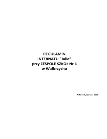 REGULAMIN INTERNATU “Julia” przy ZESPOLE SZKÓŁ Nr 4 w Wałbrzychu Wałbrzych, czerwiec 2016 Zawartość Rozdział 1 Postanowienia ogólne .................................................................................................................3 Rozdział 2 Cele i zadania internatu...............................................................................................................3 Rozdział 3 Organizacja Internatu ..................................................................................................................4 Rozdział 4 Organy Internatu – zadania, kompetencje ...................................................................................6 Rozdział 5 Rekrutacja ...................................................................................................................................8 Rozdział 6 Prawa wychowanka ..................................................................................................................12 Rozdział 7 Obowiązki mieszkańca Internatu ...............................................................................................13 Rozdział 8 Nagrody i kary ...........................................................................................................................17 Rozdział 9 Utrata miejsca w Internacie .......................................................................................................18 Rozdział 10 Zadania wychowawców...........................................................................................................18 Rozdział 11 Rada Wychowawców Internatu ...............................................................................................19 Rozdział 12 Samorząd Wychowanków Internatu ........................................................................................20 Postanowienia końcowe .............................................................................................................................22 Rozdział 1 Postanowienia ogólne §1 1. Internat „Julia” przy Zespole Szkół Nr 4 w Wałbrzychu, mieszczący się w Wałbrzychu ul. Wysockiego 11 A, 58-300 Wałbrzych zwany dalej Internatem jest koedukacyjną placówką opiekuoczo – wychowawczą działającą w ramach Zespołu Szkół Nr 4 w Wałbrzychu z siedzibą przy ul. dra Sokołowskiego 75, 58-309 Wałbrzych, przeznaczoną dla uczniów Zespołu Szkół Nr 4 w Wałbrzychu pobierających naukę poza miejscem stałego zamieszkania oraz w miarę posiadania wolnych miejsc dla uczniów innych szkół gimnazjalnych, ponadgimnazjalnych znajdujących się na terenie miasta Wałbrzycha, studentów uczelni wyższych znajdujących sie na terenie miasta Wałbrzycha do 25 roku życia. 2. Internat stanowi integralną częśd szkoły i realizuje jej plan dydaktyczno wychowawczy i profilaktyczny oraz planuje i wykonuje swoje zadania określone w planie pracy opiekuoczo wychowawczej i profilaktycznej Internatu §2 1. Regulamin Internatu „Julia” przy Zespole Szkół Nr 4 w Wałbrzychu zwany dalej Regulaminem stanowi integralną częśd Statutu Zespołu Szkół Nr 4 w Wałbrzychu zwany dalej Statutem. 2. Kierownikiem Internatu jest wicedyrektor ds. Internatu Zespołu Szkół Nr 4 w Wałbrzychu zwany dalej Kierownikiem. 3. Ilekrod w Regulaminie jest mowa o Wychowawcy, dotyczy to wychowawcy Internatu. Rozdział 2 Cele i zadania internatu §3 1. Celem Internatu jako placówki uzupełniającej i wspomagającej pracę szkoły, przejmującej na okres pobytu wychowanków funkcje opiekuoczo – wychowawcze od rodziny jest umożliwienie uczniom realizacji kształcenia, tworzenie optymalnych warunków bytowych, a także służących osiąganiu pożądanych efektów pracy dydaktyczno – wychowawczej. 2. Internat zapewnia wychowankom stałą opiekę i realizacje procesów wychowawczych w czasie odbywania przez nich nauki poza miejscem stałego zamieszkania. 3. Do zadao internatu w szczególności należy: 1) zapewnienie wychowankom zakwaterowania w pomieszczeniach mieszkalnych, wyposażonych w indywidualne miejsca do spania łącznie z pościelą (kołdra, poduszka, koc; poszewki, poszwa oraz prześcieradło we własnym zakresie), 2) zapewnienie wychowankom całodziennego, odpłatnego wyżywienia: a) wysokośd stawki żywieniowej jest stała w okresie od miesiąca września do miesiąca czerwca roku następnego, b) stawka żywieniowa ustalana jest raz w roku do 30 czerwca przez dyrektora szkoły w porozumieniu z organem prowadzącym, c) stawka żywieniowa dot. tzw „wkładu do kotła”, d) studentów do 25 roku życia obowiązuje pełna stawka żywieniowa – „wkład do kotła” + koszty przygotowania posiłku. 3 3) zapewnienie właściwych warunków do nauki, rozwijania zainteresowao i uzdolnieo, 4) zapewnienie właściwych warunków sanitarno-higienicznych, 5) stworzenie warunków do uczestniczenia w wydarzeniach kulturalnych oraz organizowanie kulturalnej rozrywki, 6) wdrożenie do samodzielnego wykonywania określonych prac porządkowo-gospodarczych i samoobsługowych, 7) upowszechnia różne formy aktywności fizycznej oraz dbałości o własny stan zdrowia, 8) stworzenie warunków do pełnego rozwoju osobowości wychowanków, kształtowanie kultury osobistej oraz wdrażanie do przestrzegania zasad moralnych i ugruntowanie poszanowania praw i wolności osobistych, 9) wyrabianie zaradności życiowej, rozwój samodzielności i samorządności, 10) upowszechnianie nawyków stałej troski o własny stan zdrowia, 4. Internat kształtuje wśród wychowanków postawę wzajemnego zrozumienia, życzliwości, tolerancji i odpowiedzialności, 5. Internat kształtuje prawidłowy stosunek do przyrody i tradycji narodowych. Rozdział 3 Organizacja Internatu §4 1. Internat funkcjonuje całodobowo przez 7 dni w tygodniu. 2. Internat funkcjonuje w okresach trwania zajęd dydaktyczno – wychowawczych zgodnie z kalendarzem organizacji roku szkolnego ustalanym corocznie przez Ministers