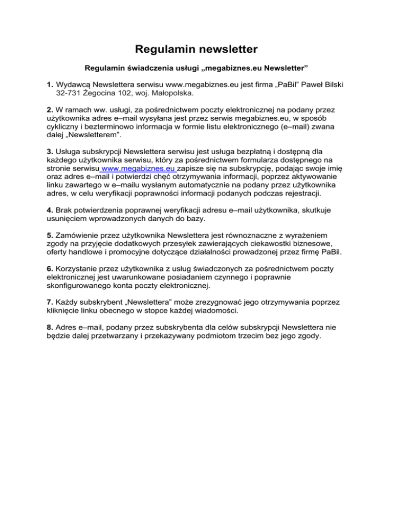 Regulamin newsletter Regulamin świadczenia usługi „megabiznes.eu Newsletter” 1. Wydawcą Newslettera serwisu www.megabiznes.eu jest firma „PaBil” Paweł Bilski 32-731 Żegocina 102, woj. Małopolska. 2. W ramach ww. usługi, za pośrednictwem poczty elektronicznej na podany przez użytkownika adres e–mail wysyłana jest przez serwis megabiznes.eu, w sposób cykliczny i bezterminowo informacja w formie listu elektronicznego (e–mail) zwana dalej „Newsletterem”. 3. Usługa subskrypcji Newslettera serwisu jest usługa bezpłatną i dostępną dla każdego użytkownika serwisu, który za pośrednictwem formularza dostępnego na stronie serwisu www.megabiznes.eu zapisze się na subskrypcję, podając swoje imię oraz adres e–mail i potwierdzi chęć otrzymywania informacji, poprzez aktywowanie linku zawartego w e–mailu wysłanym automatycznie na podany przez użytkownika adres, w celu weryfikacji poprawności informacji podanych podczas rejestracji. 4. Brak potwierdzenia poprawnej weryfikacji adresu e–mail użytkownika, skutkuje usunięciem wprowadzonych danych do bazy. 5. Zamówienie przez użytkownika Newslettera jest równoznaczne z wyrażeniem zgody na przyjęcie dodatkowych przesyłek zawierających ciekawostki biznesowe, oferty handlowe i promocyjne dotyczące działalności prowadzonej przez firmę PaBil. 6. Korzystanie przez użytkownika z usług świadczonych za pośrednictwem poczty elektronicznej jest uwarunkowane posiadaniem czynnego i poprawnie skonfigurowanego konta poczty elektronicznej. 7. Każdy subskrybent „Newslettera” może zrezygnować jego otrzymywania poprzez kliknięcie linku obecnego w stopce każdej wiadomości. 8. Adres e–mail, podany przez subskrybenta dla celów subskrypcji Newslettera nie będzie dalej przetwarzany i przekazywany podmiotom trzecim bez jego zgody.