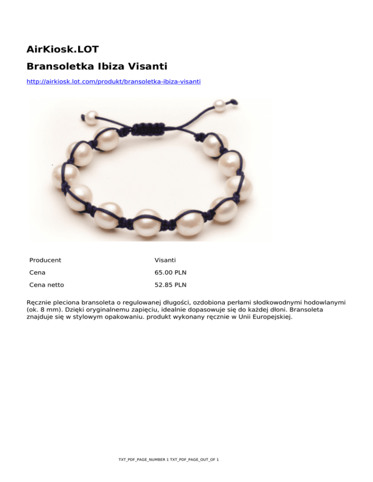 AirKiosk.LOT Bransoletka Ibiza Visanti http://airkiosk.lot.com/produkt/bransoletka-ibiza-visanti Producent Visanti Cena 65.00 PLN Cena netto 52.85 PLN Ręcznie pleciona bransoleta o regulowanej długości, ozdobiona perłami słodkowodnymi hodowlanymi (ok. 8 mm). Dzięki oryginalnemu zapięciu, idealnie dopasowuje się do każdej dłoni. Bransoleta znajduje się w stylowym opakowaniu. produkt wykonany ręcznie w Unii Europejskiej. TXT_PDF_PAGE_NUMBER 1 TXT_PDF_PAGE_OUT_OF 1