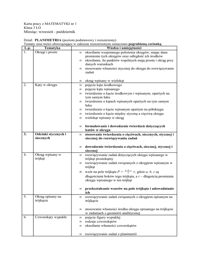 Karta pracy z MATEMATYKI nr 1 Klasa 3 LO Miesiąc: wrzesień - październik Dział: PLANIMETRIA (poziom podstawowy i rozszerzony) Tematy oraz treści obowiązujące w zakresie rozszerzonym oznaczono pogrubioną czcionką L.p. Tematyka Wiedza i umiejętności 1. Okręgi i proste • określanie wzajemnego położenia okręgów, mając dane promienie tych okręgów oraz odległość ich środków • określanie, ile punktów wspólnych mają prosta i okrąg przy danych warunkach • stosowanie własności stycznej do okręgu do rozwiązywania zadań 2. Kąty w okręgu • • • • • • • • • 3. Odcinki stycznych i siecznych • • 4. Okrąg wpisany w trójkąt • • • • 5. Okrąg opisany na trójkącie • • 6. Czworokąty wypukłe okrąg wpisany w wielokąt pojęcie kąta środkowego pojęcie kąta wpisanego twierdzenie o kącie środkowym i wpisanym, opartych na tym samym łuku twierdzenie o kątach wpisanych opartych na tym samym łuku twierdzenie o kącie wpisanym opartym na półokręgu twierdzenie o kącie między styczną a cięciwą okręgu wielokąt wpisany w okrąg formułowanie i dowodzenie twierdzeń dotyczących katów w okręgu stosowanie twierdzenia o cięciwach, siecznych, stycznej i siecznej do rozwiązywania zadań dowodzenie twierdzenia o cięciwach, siecznej, stycznej i siecznej rozwiązywanie zadań dotyczących okręgu wpisanego w trójkąt prostokątny rozwiązywanie zadań związanych z okręgiem wpisanym w trójkąt a+ b+ c wzór na pole trójkąta P = 2 ·r, gdzie a, b, c są długościami boków tego trójkąta, a r – długością promienia okręgu wpisanego w ten trójkąt przekształcanie wzorów na pole trójkąta i udowadnianie ich rozwiązywanie zadań związanych z okręgiem opisanym na trójkącie • • • stosowanie własności środka okręgu opisanego na trójkącie w zadaniach z geometrii analitycznej pojęcie figury wypukłej rodzaje czworokątów określanie własności czworokątów • rozwiązywanie zadań z planimetrii 7. 8. Okrąg wpisany w czworokąt Okrąg opisany na czworokącie • • sprawdzanie czy w dany czworokąt można wpisać okrąg stosowanie twierdzenia o okręgu wpisanym w czworokąt do rozwiązywania zadań • dowodzenie twierdzeń dotyczących okręgu wpisanego w wielokąt sprawdzanie, czy na danym czworokącie można opisać okrąg • • 9. Twierdzenie sinusów • • 10. Twierdzenie cosinusów • • • 11. Odległość między punktami w układzie współrzędnych. Środek odcinka • • • • • 12. Odległość punktu od prostej • • • • 13. Okrąg w układzie współrzędnych • • • • • • 14. Układy równań drugiego stopnia stosowanie twierdzenia o okręgu opisanym na czworokącie do rozwiązywania zadań stosowanie twierdzenia sinusów do rozwiązywania trójkątów stosowanie twierdzenia sinusów do rozwiązywania zadań o kontekście praktycznym przeprowadzanie dowodu twierdzenia sinusów stosowanie twierdzenia cosinusów do rozwiązywania trójkątów stosowanie twierdzenia cosinusów do rozwiązywania zadań o kontekście praktycznym przeprowadzanie dowodu twierdzenia cosinusów wzór na odległość między punktami w układzie współrzędnych wzór na współrzędne środka odcinka obliczanie obwodu wielokąta, mając dane współrzędne jego wierzchołków stosowanie wzoru na odległość między punktami do rozwiązywania zadań dotyczących równoległoboków wzór na odległość punktu od prostej obliczanie odległości między prostymi równoległymi stosowanie związku między współczynnikiem kierunkowym a kątem nachylenia prostej do osi OX wyznaczanie kąta między prostymi wyprowadzanie wzoru na odległość punktu od prostej sprawdzanie czy punkt należy do danego okręgu wyznaczanie środka i promienia okręgu, mając dane jego równanie opisywanie równaniem okrąg o danym środku i przechodzącym przez dany punkt sprawdzanie, czy dane równanie jest równaniem okręgu wyznaczanie wartości parametru tak, aby równanie opisywało okrąg • • stosowanie równania okręgu w zadaniach rozwiązywanie algebraicznie i graficznie układów równań, z których co najmniej jedno jest stopnia drugiego • rozwiązywania zadań z geometrii analitycznej 15. Koło w układzie współrzędnych • • • • 16. Działania na wektorach 17. Zastosowania działań na wektorach 18. Jednokładność nierówność opisująca koło geometryczna interpretacja rozwiązania układu nierówności stopnia drugiego opisywanie układem nierówności przedstawiony podzbiór płaszczyzny • • • • • • zaznaczanie w układzie współrzędnych zbiorów spełniających określone warunki pojęcie wektora swobodnego i zaczepionego dodawanie i odejmowanie wektorów mnożenie wektora przez liczbę sprawdzanie, czy wektory mają ten sam kierunek i zwrot interpretacja geometryczna działań na wektorach długość wektora • • • • pojęcie wektora jednostkowego badanie współliniowości punktów podział odcinka rozwiązywanie zadań • • • • • dowodzenie twierdzeń konstruowanie figur jednokładnych pojęcie figur jednokładnych wyznaczanie współrzędnych punktów w danej jednokładności twierdzenie o podobieństwie figur • stosowanie własności jednokładności w zadaniach Podręcznik klasa II: zakres podstawowy str.156 - 192; zakres rozszerzony str. 308 - 385. W trakcie realizacji karty pracy wiedza i umiejętności ucznia będą sprawdzane w formie kartkówek. Na zakończenie karty pracy przewidziany jest 45 minutowy sprawdzian wiadomości z zakresu podstawowego dla wszystkich uczniów oraz sprawdzian z zakresu rozszerzonego dla uczniów fakultetu matematycznego.