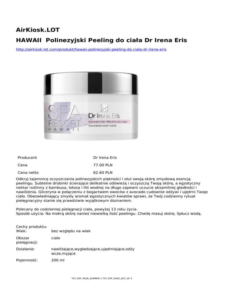 AirKiosk.LOT HAWAII Polinezyjski Peeling do ciała Dr Irena Eris http://airkiosk.lot.com/produkt/hawaii-polinezyjski-peeling-do-ciala-dr-irena-eris Producent Dr Irena Eris Cena 77.00 PLN Cena netto 62.60 PLN Odkryj tajemnicę oczyszczania polinezyjskich piękności i otul swoją skórę zmysłową esencją peelingu. Subtelne drobinki ścierające delikatnie odświeżą i oczyszczą Twoją skórę, a egzotyczny nektar roślinny z bambusa, lotosa i lilii wodnej na długo zapewni uczucie aksamitnej gładkości i nawilżenia. Gliceryna w połączeniu z bogactwem owoców z avocado cudownie odżywi i ujędrni Twoje ciało. Obezwładniający zmysły aromat egzotycznych kwiatów sprawi, że Twój codzienny rytuał pielęgnacyjny stanie się prawdziwie wyjątkowym doznaniem. Polecany do codziennej pielęgnacji ciała, powyżej 13 roku życia. Sposób użycia: Na mokrą skórę nanieś niewielką ilość peelingu. Chwilę masuj skórę. Spłucz wodą. Cechy produktu: Wiek: bez względu na wiek Obszar pielęgnacji: ciało Działanie: nawilżające,wygładzające,ujędrniające,odży wcze,myjące Pojemność: 200 ml TXT_PDF_PAGE_NUMBER 1 TXT_PDF_PAGE_OUT_OF 2 Zastosowanie: w zależności od potrzeb Rodzaj skóry: każda TXT_PDF_PAGE_NUMBER 2 TXT_PDF_PAGE_OUT_OF 2