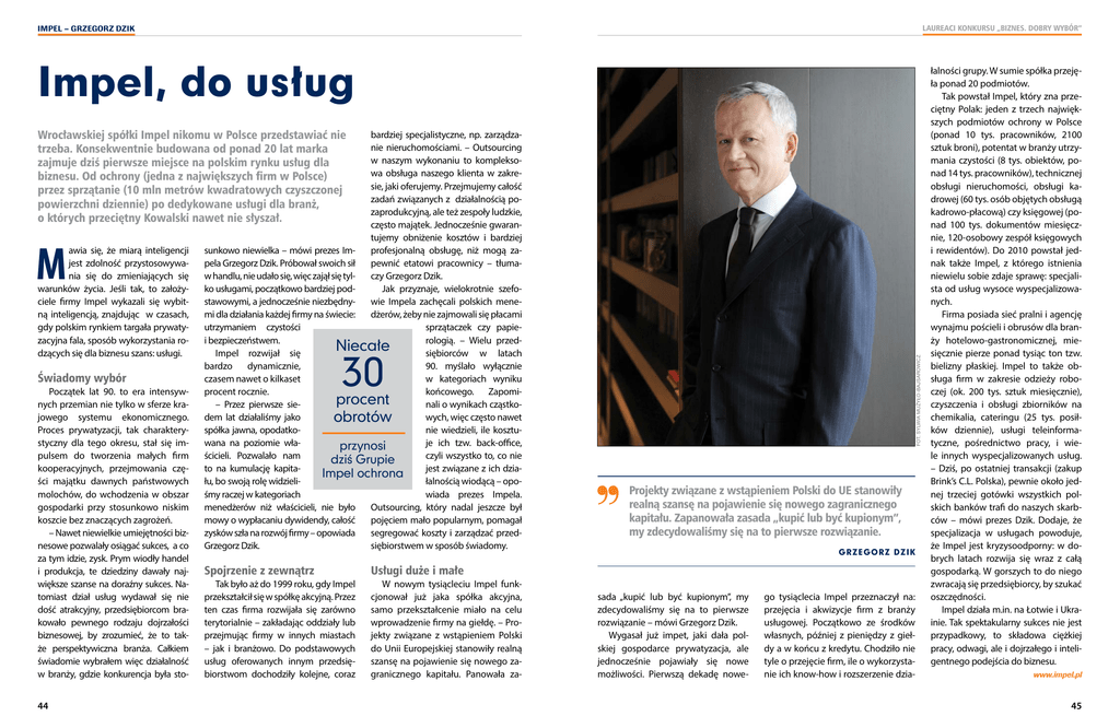 Laureaci konkursu „Biznes. Dobry wybór” impel – Grzegorz Dzik Impel, do usług Wrocławskiej spółki Impel nikomu w Polsce przedstawiać nie trzeba. Konsekwentnie budowana od ponad 20 lat marka zajmuje dziś pierwsze miejsce na polskim rynku usług dla biznesu. Od ochrony (jedna z największych firm w Polsce) przez sprzątanie (10 mln metrów kwadratowych czyszczonej powierzchni dziennie) po dedykowane usługi dla branż, o których przeciętny Kowalski nawet nie słyszał. Świadomy wybór Początek lat 90. to era intensywnych przemian nie tylko w sferze krajowego systemu ekonomicznego. Proces prywatyzacji, tak charakterystyczny dla tego okresu, stał się impulsem do tworzenia małych firm kooperacyjnych, przejmowania części majątku dawnych państwowych molochów, do wchodzenia w obszar gospodarki przy stosunkowo niskim koszcie bez znaczących zagrożeń. – Nawet niewielkie umiejętności biznesowe pozwalały osiągać sukces, a co za tym idzie, zysk. Prym wiodły handel i produkcja, te dziedziny dawały największe szanse na doraźny sukces. Natomiast dział usług wydawał się nie dość atrakcyjny, przedsiębiorcom brakowało pewnego rodzaju dojrzałości biznesowej, by zrozumieć, że to także perspektywiczna branża. Całkiem świadomie wybrałem więc działalność w branży, gdzie konkurencja była sto44 30 Spojrzenie z zewnątrz Tak było aż do 1999 roku, gdy Impel przekształcił się w spółkę akcyjną. Przez ten czas firma rozwijała się zarówno terytorialnie – zakładając oddziały lub przejmując firmy w innych miastach – jak i branżowo. Do podstawowych usług oferowanych innym przedsiębiorstwom dochodziły kolejne, coraz FOT. Sylwia MuŻyło-bajsarowicz M awia się, że miarą inteligencji jest zdolność przystosowywania się do zmieniających się warunków życia. Jeśli tak, to założyciele firmy Impel wykazali się wybitną inteligencją, znajdując w czasach, gdy polskim rynkiem targała prywatyzacyjna fala, sposób wykorzystania rodzących się dla biznesu szans: usługi. bardziej specjalistyczne, np. zarządzanie nieruchomościami. – Outsourcing w naszym wykonaniu to kompleksowa obsługa naszego klienta w zakresie, jaki oferujemy. Przejmujemy całość zadań związanych z działalnością pozaprodukcyjną, ale też zespoły ludzkie, często majątek. Jednocześnie gwarantujemy obniżenie kosztów i bardziej profesjonalną obsługę, niż mogą zasunkowo niewielka – mówi prezes Impewnić etatowi pracownicy – tłumapela Grzegorz Dzik. Próbował swoich sił czy Grzegorz Dzik. w handlu, nie udało się, więc zajął się tylJak przyznaje, wielokrotnie szefoko usługami, początkowo bardziej podwie Impela zachęcali polskich menestawowymi, a jednocześnie niezbędnydżerów, żeby nie zajmowali się płacami mi dla działania każdej firmy na świecie: sprzątaczek czy papieutrzymaniem czystości rologią. – Wielu przedi bezpieczeństwem. Niecałe siębiorców w latach Impel rozwijał się 90. myślało wyłącznie bardzo dynamicznie, w kategoriach wyniku czasem nawet o kilkaset końcowego. Zapomiprocent rocznie. procent nali o wynikach cząstko– Przez pierwsze siewych, więc często nawet dem lat działaliśmy jako obrotów nie wiedzieli, ile kosztuspółka jawna, opodatkoje ich tzw. back-office, wana na poziomie właprzynosi czyli wszystko to, co nie ścicieli. Pozwalało nam dziś Grupie jest związane z ich dziato na kumulację kapitaImpel ochrona łalnością wiodącą – opołu, bo swoją rolę widzieliwiada prezes Impela. śmy raczej w kategoriach Outsourcing, który nadal jeszcze był menedżerów niż właścicieli, nie było pojęciem mało popularnym, pomagał mowy o wypłacaniu dywidendy, całość segregować koszty i zarządzać przedzysków szła na rozwój firmy – opowiada siębiorstwem w sposób świadomy. Grzegorz Dzik. Projekty związane z wstąpieniem Polski do UE stanowiły realną szansę na pojawienie się nowego zagranicznego kapitału. Zapanowała zasada „kupić lub być kupionym”, my zdecydowaliśmy się na to pierwsze rozwiązanie. Grzegorz Dzik Usługi duże i małe W nowym tysiącleciu Impel funkcjonował już jaka spółka akcyjna, samo przekształcenie miało na celu wprowadzenie firmy na giełdę. – Projekty związane z wstąpieniem Polski do Unii Europejskiej stanowiły realną szansę na pojawienie się nowego zagranicznego kapitału. Panowała za- sada „kupić lub być kupionym”, my zdecydowaliśmy się na to pierwsze rozwiązanie – mówi Grzegorz Dzik. Wygasał już impet, jaki dała polskiej gospodarce prywatyzacja, ale jednocześnie pojawiały się nowe możliwości. Pierwszą dekadę nowe- go tysiąclecia Impel przeznaczył na: przejęcia i akwizycje firm z branży usługowej. Początkowo ze środków własnych, później z pieniędzy z giełdy a w końcu z kredytu. Chodziło nie tyle o przejęcie firm, ile o wykorzystanie ich know-how i rozszerzenie dzia- łalności grupy. W sumie spółka przejęła ponad 20 podmiotów. Tak powstał Impel, który zna przeciętny Polak: jeden z trzech największych podmiotów ochrony w Polsce (ponad 10 tys. pracowników, 2100 sztuk broni), potentat w branży utrzymania czystości (8 tys. obiektów, ponad 14 tys. pracowników), technicznej obsługi nieruchomości, obsługi kadrowej (60 tys. osób objętych obsługą kadrowo-płacową) czy księgowej (ponad 100 tys. dokumentów miesięcznie, 120-osobowy zespół księgowych i rewidentów). Do 2010 powstał jednak także Impel, z którego istnienia niewielu sobie zdaje sprawę: specjalista od usług wysoce wyspecjalizowanych. Firma posiada sieć pralni i agencję wynajmu pościeli i obrusów dla branży hotelowo-gastronomicznej, miesięcznie pierze ponad tysiąc ton tzw. bielizny płaskiej. Impel to także obsługa firm w zakresie odzieży roboczej (ok. 200 tys. sztuk miesięcznie), czyszczenia i obsługi zbiorników na chemikalia, cateringu (25 tys. posiłków dziennie), usługi teleinformat