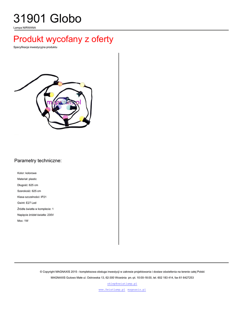 31901 Globo Lampa NIRWANA Produkt wycofany z oferty Specyfikacja inwestycyjna produktu Parametry techniczne: Kolor: kolorowe Materiał: plastic Długość: 625 cm Szerokość: 625 cm Klasa szczelności: IP21 Gwint: E27 Led Źródła światła w komplecie: 1 Napięcie źródeł światła: 230V Moc: 1W © Copyright MAGNAXIS 2015 - kompleksowa obsługa inwestycji w zakresie projektowania i dostaw oświetlenia na terenie całej Polski MAGNAXIS Gutowo Małe ul. Ostrowska 13, 62-300 Września pn.-pt. 10:00-18:00, tel. 602 183 414, fax 61 6427253 [email protected] www.SwiatLamp.pl magnaxis.pl