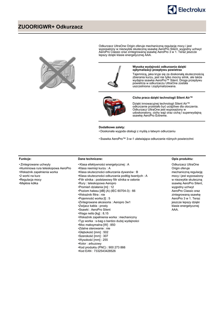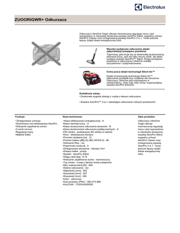 ZUOORIGWR+ Odkurzacz Odkurzacz UltraOne Origin oferuje mechaniczną regulację mocy i jest wyposażony w niezwykle skuteczną ssawkę AeroPro Silent, wygodny uchwyt AeroPro Classic oraz zintegrowaną ssawkę AeroPro 3 w 1. Teraz jeszcze lepszy dzięki klasie energetycznej AAA. Wysoka wydajność odkurzania dzięki optymalizacji przepływu powietrza Tajemnicą, jaka kryje się za doskonałą skutecznością zbierania kurzu, jest nie tylko mocny silnik, ale także wydajna ssawka AeroPro™ Silent. Droga przepływu powietrza w odkurzaczu UltraOne została uszczelniona i zoptymalizowana. Cicha praca dzięki technologii Silent Air™ Dzięki innowacyjnej technologii Silent Air™ odkurzanie przestało być uciążliwe dla otoczenia. Odkurzacz UltraOne jest wyposażony w udoskonalony, cichy wąż oraz cichą i superwydajną ssawkę AeroPro Extreme. Dodatkowe zalety: • Doskonała wygoda obsługi z myślą o łatwym odkurzaniu • Ssawka AeroPro™ 3-w-1 ułatwiająca odkurzanie różnych powierzchni Funkcje: Dane techniczne: Opis produktu: • Zintegrowane uchwyty •Aluminiowa rura teleskopowa AeroPro •Wskażnik zapełnienia worka •2 worki na kurz •Regulacja mocy •Miękkie kółka • Klasa efektywności energetycznej : A •Klasa reemisji kurzu : A •Klasa skuteczności odkurzania dywanów : B •Klasa skuteczności odkurzania podłóg twardych : A •Filtr silnika : podstawowy filtr silnika w osłonie •Rury : teleskopowa Aeropro •Promień działania [m] : 12 •Poziom hałasu [dB] (A) (IEC 60704-3) : 66 •Wskaźnik filtra : nie •Pojemność worka [l] : 5 •Zintegrowane akcesoria : Aeropro 3w1 •Zwijacz kabla : prosty •Ssawki : AeroPro Silent •Waga netto [kg] : 8,15 •Wskaźnik zapełnienia worka : mechaniczny •Typ worka : s-bag o bardzo dużej wydajności •Moc maksymalna [W] : 850 •Zdalne sterowanie : nie •Głębokość [mm] : 502 •Szerokość [mm] : 307 •Wysokość [mm] : 255 •Kolor : arbuzowy •Kod produktu (PNC) : 900 273 866 •Kod EAN : 7332543428526 Odkurzacz UltraOne Origin oferuje mechaniczną regulację mocy i jest wyposażony w niezwykle skuteczną ssawkę AeroPro Silent, wygodny uchwyt AeroPro Classic oraz zintegrowaną ssawkę AeroPro 3 w 1. Teraz jeszcze lepszy dzięki klasie energetycznej AAA.