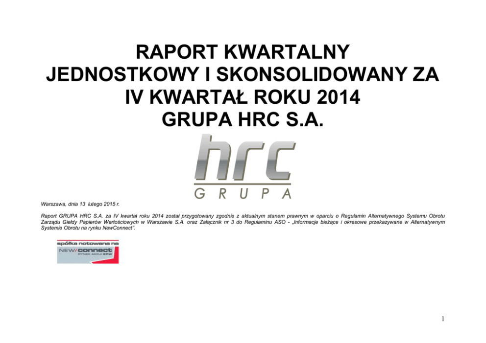 RAPORT KWARTALNY JEDNOSTKOWY I SKONSOLIDOWANY ZA IV KWARTAŁ ROKU 2014 GRUPA HRC S.A. Warszawa, dnia 13 lutego 2015 r. Raport GRUPA HRC S.A. za IV kwartał roku 2014 został przygotowany zgodnie z aktualnym stanem prawnym w oparciu o Regulamin Alternatywnego Systemu Obrotu Zarządu Giełdy Papierów Wartościowych w Warszawie S.A. oraz Załącznik nr 3 do Regulaminu ASO - „Informacje bieżące i okresowe przekazywane w Alternatywnym Systemie Obrotu na rynku NewConnect”. 1 INFORMACJE OGÓLNE: Dane Emitenta: Nazwa: GRUPA HRC Spółka Akcyjna Kraj: Polska Siedziba: Warszawa Adres: ul. Leszno 8 lok. 1, 01-192 Warszawa Numer KRS: 0000372596 Sąd rejestracji: Sąd Rejonowy dla m. st. Warszawy XII Wydział Gospodarczy Kapitał zakładowy: 850 000 zł, w całości opłacony. NIP: 9511949454 REGON: 016099664 Numer telefonu: +48 22 862 38 12 Numer faksu: +48 22 862 40 19 Adres poczty elektronicznej: [email protected] Adres strony internetowej: www.hrc.com.pl Zarząd: Piotr Macoch – Członek Zarządu Rada Nadzorcza: Tomasz Banasiak Jarosław Kopyt Piotr Karmelita Michał Handzlik Kamil Grzeszczuk 2 Dane jednostki objętej konsolidacją: Nazwa: MOBILIS TEAM Sp. z o.o. Kraj: Polska Siedziba: Warszawa Adres: ul. Leszno 8 lok. 1, 01-192 Warszawa Numer KRS: 0000276052 Sąd rejestracji: Sąd Rejonowy dla m. st. Warszawy XII Wydział Gospodarczy Kapitał zakładowy: 50 500 złotych NIP: 7792310397 REGON: 300563691 Numer telefonu: +48 22 436 20 25 Adres poczty elektronicznej: [email protected] Adres strony internetowej: www.mobilisteam.pl Zarząd: Michał Mazurczak – Członek Zarządu Waldemar Paturej – Członek Zarządu Udział Emitenta w kapitale zakładowym: 50,49 % Udział Emitenta W liczbie głosów: 50,49 % 3 I. KWARTALNE SKRÓCONE JEDNOSTKOWE SPRAWOZDANIE FINANSOWE Emitent prezentuje kwartalne skrócone sprawozdanie finansowe za IV kwartał 2014 roku oraz dane narastające za okres od 1 stycznia 2014 r. do 31 grudnia 2014 r. wraz z danymi porównywalnymi za analogiczne okresy roku poprzedniego. Dane w PLN Bilans 31.12.2014 30.09.2014 31.12.2013 1 330 301,00 1 327 000,00 1 117 000,00 A. Aktywa trwałe I. Wartości niematerialne i prawne II. Rzeczowe aktywa trwałe III. Należności długoterminowe 210 000,00 210 000,00 IV. Inwestycje długoterminowe 1 117 000,00 1 117 000,00 V. Długoterminowe rozliczenia międzyokresowe B. Aktywa obrotowe I. Zapasy II. III. IV. - 3 301,00 - - - - - 1 117 000,00 1 223 088,79 30.09.2013 966 945,00 700 945,00 266 000,00 - 2 225 266,94 2 477 783,33 326 493,02 332 375,25 Należności krótkoterminowe 1 186 623,46 1 509 394,08 636 169,04 1 039 965,15 Inwestycje krótkoterminowe 689 277,14 588 276,01 578 897,28 637 359,62 Krótkoterminowe rozliczenia międzyokresowe 22 873,32 47 737,99 8 022,47 8 557,17 - 1 685 881,94 - Aktywa razem 3 555 567,94 3 804 783,33 2 340 088,79 2 652 826,94 A. Kapitał (fundusz) własny 1 462 915,16 1 498 699,78 1 376 172,75 1 237 338,55 I. Kapitał (fundusz) podstawowy 850 000,00 850 000,00 850 000,00 850 000,00 II. Należne wpłaty na kapitał podstawowy (wielkość ujemna) - - - III. Udziały (akcje) własne (wielkość ujemna) - - - IV. Kapitał (fundusz) zapasowy V. Kapitał (fundusz) z aktualizacji wyceny VI. Pozostałe kapitały (fundusze) rezerwowe VII. Zysk (strata) z lat ubiegłych VIII. Zysk (strata) netto IX. Odpisy z zysku netto w ciągu roku obrotowego (wielkość ujemna) B. Zobowiązania i rezerwy na zobowiązania I. Rezerwy na zobowiązania 57 506,80 43 489,00 56 489,00 II. Zobowiązania długoterminowe 337 953,00 407 736,00 162 560,00 III. Zobowiązania krótkoterminowe 1 431 919,66 1 467 598,54 235 257,02 IV. Rozliczenia międzyokresowe Pasywa razem 449 840,41 76 332,34 86 742,41 2 092 652,78 449 840,41 76 332,34 122 527,03 2 306 083,55 305 114,38 - 305 114,38 - 76 332,34 76 332,34 (18 261,57) (18 261,57) 162 987,60 24 153,40 963 916,04 1 415 488,39 425 057,86 265 273,32 387 260,01 509 610,02 990 430,53 3 555 567,94 3 804 783,33 2 340 088,79 2 652 826,94 4 Rachunek zysków i strat (wariant porównawczy) A. Przychody netto ze sprzedaży i zrównane z nimi, w tym: I. Przychody netto ze sprzedaży produktów Zmiana stanu produktów (zwiększenie-wartość dodatnia, II. zmniejszenie-wartość ujemna) III. Koszt wytworzenia produktów na własne potrzeby jednostki IV. Przychody netto ze sprzedaży towarów i materiałów B. Koszty działalności operacyjnej I. II. III. IV. V. VI. VII. VIII. IX. C. D. I. II. III. E. I. II. III. F. G. Amortyzacja Zużycie materiałów i energii Usługi obce Podatki i opłaty Wynagrodzenia Ubezpieczenia społeczne i inne świadczenia Pozostałe koszty rodzajowe Koszty realizacji projektów POKL Wartość sprzedanych towarów i materiałów Zysk (strata) ze sprzedaży (A - B) Pozostałe przychody operacyjne Zysk ze zbycia niefinansowych aktywów trwałych Dotacje Inne przychody operacyjne Pozostałe koszty operacyjne Strata ze zbycia niefinansowych aktywów trwałych Aktualizacja wartości aktywów niefinansowych Inne koszty operacyjne Zysk (strata) z działalności operacyjnej (C+D-E) Przychody finansowe I. II. III. IV. V. H. I. II. III. IV. I. J. I. II. Dywidendy i udziały w zyskach Odsetki Zysk ze zbycia inwestycji Aktualizacja wartości inwestycji Inne Koszty finansowe Odsetki Strata ze zbycia inwestycji Aktualizacja wartości inwestycji Inne Zysk (strata) z działalności gospodarczej (F+G-H) Wynik zdarzeń nadzwyczajnych (J.I.-J.II.) Zyski nadzwyczajne Straty nadzwyczajne 01.10.2014-31.12.2014 3 578 313,80 2 600 395,07 977 918,73 3 638 578,21 238 431,47 1 244 586,58 25 262,00 665 384,60 130 638,29 165 572,97 74 723,03 1 093 979,27 (60 264,41) 105 919,47 75 095,77 30 823,70 51 423,24 37 390,00 14 033,24 (5 768,18) 1 827,95 1 964,70 (136,75) 25 500,39 14 438,47 11 061,92 (29 440,62) - 01.01.2014-31.12.2014 12 521 534,48 9 745 460,87 2 776 073,61 13 125 905,34 01.10.2013-31.12.2013 320 917,07 320 917,07 - 01.01.2013-31.12.2013 983 419,77 983 419,77 - 751 015,91 2 400 954,88 603 417,57 5 385