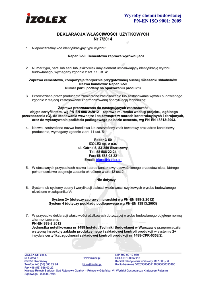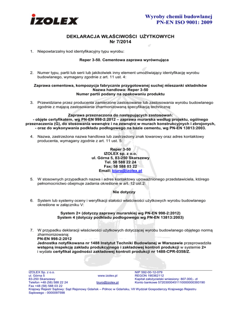 Wyroby chemii budowlanej PN-EN ISO 9001: 2009 DEKLARACJA WŁAŚCIWOŚCI UŻYTKOWYCH Nr 7/2014 1. Niepowtarzalny kod identyfikacyjny typu wyrobu: Reper 3-50. Cementowa zaprawa wyrównująca 2. Numer typu, partii lub serii lub jakikolwiek inny element umożliwiający identyfikację wyrobu budowlanego, wymagany zgodnie z art. 11 ust. 4: Zaprawa cementowa, kompozycja fabrycznie przygotowanej suchej mieszanki składników Nazwa handlowa: Reper 3-50 Numer partii podany na opakowaniu produktu 3. Przewidziane przez producenta zamierzone zastosowanie lub zastosowania wyrobu budowlanego zgodnie z mającą zastosowanie zharmonizowaną specyfikacją techniczną: Zaprawa przeznaczona do następujących zastosowań: - objęte certyfikatem, wg PN-EN 998-2:2012 – zaprawa murarska według projektu, ogólnego przeznaczenia (G), do stosowania wewnątrz i na zewnątrz w murach konstrukcyjnych i zbrojonych, - oraz do wykonywania podkładu podłogowego na bazie cementu, wg PN-EN 13813:2003. 4. Nazwa, zastrzeżona nazwa handlowa lub zastrzeżony znak towarowy oraz adres kontaktowy producenta, wymagany zgodnie z art. 11 ust. 5: Reper 3-50 IZOLEX sp. z o.o. ul. Górna 5, 83-250 Skarszewy Tel. 58 588 22 24 Fax: 58 588 03 22 Email: [email protected] 5. W stosownych przypadkach nazwa i adres kontaktowy upoważnionego przedstawiciela, którego pełnomocnictwo obejmuje zadania określone w art. 12 ust.2: Nie dotyczy 6. System lub systemy oceny i weryfikacji stałości właściwości użytkowych wyrobu budowlanego określone w załączniku V: System 2+ (dotyczy zaprawy murarskiej wg PN-EN 998-2:2012) System 4 (dotyczy podkładu podłogowego wg PN-EN 13813:2003) 7. W przypadku deklaracji właściwości użytkowych dotyczącej wyrobu budowlanego objętego normą zharmonizowaną: PN-EN 998-2:2012 Jednostka notyfikowana nr 1488 Instytut Techniki Budowlanej w Warszawie przeprowadziła wstępną inspekcję zakładu produkcyjnego i zakładowej kontroli produkcji w systemie 2+ i wydała certyfikat zgodności zakładowej kontroli produkcji nr 1488-CPR-0358/Z. IZOLEX Sp. z o.o. NIP 592-00-12-079 ul. Górna 5 www.izolex.pl REGON 190362112 83-250 Skarszewy Kapitał założycielski wniesiony: 807.000,- zł Telefon +48 (58) 588 22 24 [email protected] Konto bankowe 57203000451110000000393190 Fax +48 (58) 588 03 22 Krajowy Rejestr Sądowy: Sąd Rejonowy Gdańsk – Północ w Gdańsku, VII Wydział Gospodarczy Krajowego Rejestru Sądowego - 0000097598 Wyroby chemii budowlanej PN-EN ISO 9001: 2009 8. W przypadku deklaracji właściwości użytkowych dotyczącej wyrobu budowlanego, dla którego wydana została europejska ocena techniczna: Nie dotyczy. 9. Deklarowane właściwości użytkowe: Zasadnicze charakterystyki Właściwości użytkowe Zharmonizowana specyfikacja techniczna Właściwości użytkowe w systemie 2+: Wytrzymałość na ściskanie Początkowa wytrzymałość na ścinanie Reakcja na ogień Klasa M 20 ≥ 0,15 MPa Zawartość chlorków Absorpcja wody Współczynnik przepuszczalności pary wodnej Współczynnik przewodzenia ciepła ≤ 0,1% ≤ 0,3 kg/(m² x min½) µ 15/35 (λ10, dry) 1,11 W/m · K Klasa A1 (średnia wartość tabelaryczna; PN-EN 998-2:2012 PN-EN 998-2:2012 PN-EN 998-2:2012 oraz 96/603/WE PN-EN 998-2:2012 PN-EN 998-2:2012 EN 1745:2012 Tablica A.12 EN 1745:2012 Tablica A.12 P = 50%) Trwałość (odporność na zamrażanieodmrażanie) mrozoodporna PN-EN 998-2:2012 Właściwości użytkowe w systemie 4: Wydzielanie substancji korozyjnych Wytrzymałość na ściskanie Wytrzymałość na zginanie CT C 20 F6 PN-EN 13813:2003 PN-EN 13813:2003 PN-EN 13813:2003 10. Właściwości użytkowe wyrobu określonego w pkt 1 i 2 są zgodne z właściwościami użytkowymi deklarowanymi w pkt 9. Niniejsza deklaracja właściwości użytkowych wydana zostaje na wyłączną odpowiedzialność producenta określonego w pkt 4. W imieniu producenta podpisał: Andrzej Horbaczewski, kierownik Laboratorium Kontroli Jakości Skarszewy, 04.06.2014. Niniejszy dokument wystawiono na podstawie rozporządzenia Parlamentu Europejskiego i Rady (UE) nr 305/2011 z dnia 09 marca 2011. IZOLEX Sp. z o.o. NIP 592-00-12-079 ul. Górna 5 www.izolex.pl REGON 190362112 83-250 Skarszewy Kapitał założycielski wniesiony: 807.000,- zł Telefon +48 (58) 588 22 24 [email protected] Konto bankowe 57203000451110000000393190 Fax +48 (58) 588 03 22 Krajowy Rejestr Sądowy: Sąd Rejonowy Gdańsk – Północ w Gdańsku, VII Wydział Gospodarczy Krajowego Rejestru Sądowego - 0000097598