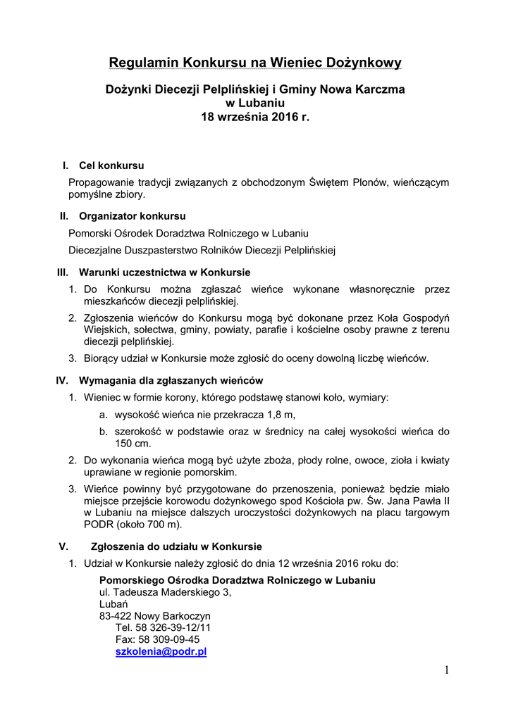 Regulamin Konkursu na Wieniec Dożynkowy Dożynki Diecezji Pelplińskiej i Gminy Nowa Karczma w Lubaniu 18 września 2016 r. I. Cel konkursu Propagowanie tradycji związanych z obchodzonym Świętem Plonów, wieńczącym pomyślne zbiory. II. Organizator konkursu Pomorski Ośrodek Doradztwa Rolniczego w Lubaniu Diecezjalne Duszpasterstwo Rolników Diecezji Pelplińskiej III. Warunki uczestnictwa w Konkursie 1. Do Konkursu można zgłaszać wieńce wykonane własnoręcznie przez mieszkańców diecezji pelplińskiej. 2. Zgłoszenia wieńców do Konkursu mogą być dokonane przez Koła Gospodyń Wiejskich, sołectwa, gminy, powiaty, parafie i kościelne osoby prawne z terenu diecezji pelplińskiej. 3. Biorący udział w Konkursie może zgłosić do oceny dowolną liczbę wieńców. IV. Wymagania dla zgłaszanych wieńców 1. Wieniec w formie korony, którego podstawę stanowi koło, wymiary: a. wysokość wieńca nie przekracza 1,8 m, b. szerokość w podstawie oraz w średnicy na całej wysokości wieńca do 150 cm. 2. Do wykonania wieńca mogą być użyte zboża, płody rolne, owoce, zioła i kwiaty uprawiane w regionie pomorskim. 3. Wieńce powinny być przygotowane do przenoszenia, ponieważ będzie miało miejsce przejście korowodu dożynkowego spod Kościoła pw. Św. Jana Pawła II w Lubaniu na miejsce dalszych uroczystości dożynkowych na placu targowym PODR (około 700 m). V. Zgłoszenia do udziału w Konkursie 1. Udział w Konkursie należy zgłosić do dnia 12 września 2016 roku do: Pomorskiego Ośrodka Doradztwa Rolniczego w Lubaniu ul. Tadeusza Maderskiego 3, Lubań 83-422 Nowy Barkoczyn Tel. 58 326-39-12/11 Fax: 58 309-09-45 [email protected] 1 2. Zgłoszenia do udziału konkursie należy dokonać za pomocą karty zgłoszenia 3. Kartę zgłoszenia można złożyć elektronicznie (wiadomość e-mail) osobiście, listownie, faxem lub 4. W zgłoszeniu należy podać: a) nazwę wykonawcy wieńca wraz z danymi kontaktowymi - adres, telefon b) nazwę zgłaszającego udział w Konkursie wraz z danymi kontaktowymi adres, telefon. 2. Wzór karty zgłoszenia stanowi załącznik nr 1 do niniejszego Regulaminu. VI. Kryteria oceny Ocenie będzie podlegać w szczególności: a) zgodność wieńca z wymogami regulaminu Konkursu; b) zgodność wykonania wieńca z tradycyjną techniką wicia; c) różnorodność użytych do wykonania wieńca podstawowych materiałów naturalnych; d) ogólny wyraz artystyczny, forma plastyczna; e) sposób prezentacji wieńca, w tym stroje grupy wieńcowej; f) pomysłowość wykonania wieńca. VII. Komisja konkursowa 1. Oceny wieńców i przyznania nagród dokona Komisja Konkursowa powołana przez Dyrektora PODR w Lubaniu. 2. Członkom Komisji Konkursowej nie przysługuje wynagrodzenie za udział w pracach Komisji. 3. Udział Członków Komisji Konkursowej w pracach Komisji następuje za ich uprzednią zgodą. VIII. Przebieg Konkursu 1. Każdy zgłoszony wieniec otrzyma numer porządkowy, o którym biorący udział w Konkursie, zostaną poinformowani w dniu 18 września 2016 roku na placu przed kościołem. 2. Organizator Konkursu nie pokrywa kosztów przyjazdu na miejsce uroczystości dożynkowych i transportu wieńca zgłoszonego do Konkursu, jak również żadnych innych kosztów z tym związanych. 3. Wieniec należy dostarczyć na plac przed Kościołem pw. Św. Jana Pawła II w Lubaniu (Gmina Nowa Karczma) w dniu 18 września 2016 roku do godziny 9.30. 4. Komisja Konkursowa dokona oceny zgłoszonych wieńców poprzez wskazanie trzech najładniejszych wieńców i przyznanie I, II i III miejsca. 5. Po dokonaniu oceny wieńców przez Komisję Konkursową i zakończonej mszy Św., biorący udział w Konkursie, przejdą w korowodzie dożynkowym wraz z wieńcami na teren wystawienniczo-targowy Pomorskiego Ośrodka Doradztwa 2 Rolniczego w Lubaniu, gdzie zostaną ogłoszone wyniki Konkursu oraz nastąpi wręczenie nagród. 6. Odbiór wieńców będzie mieć miejsce w dniu 18 września 2016 roku od godziny 14.30, po zakończeniu uroczystości na scenie. 7. Z przebiegu Konkursu Komisja Konkursowa sporządzi protokół. IX. Nagrody 1. Organizator przewiduje dla laureatów Konkursu nagrody rzeczowe 2. Laureaci Konkursu nie mają prawa wnoszenia roszczeń, co do otrzymanych nagród rzeczowych. 3. Wszyscy uczestnicy otrzymają dyplom za udział w konkursie. X. Ochrona danych osobowych 1. Pomorski Ośrodek Doradztwa Rolniczego w Lubaniu przetwarza dane osobowe osób biorących udział w Konkursie. 2. Zakres przetwarzania danych osobowych obejmuje dane niezbędne do realizacji Konkursu i oznacza w szczególności: a) b) c) nazwisko i imię osoby zgłaszającej wieniec, ulica, kod pocztowy, miejscowość, gmina, telefon, fax, adres e-mail. 3. Kategoria osób, których dane dotyczą, to osoby biorące udział w Konkursie. 4. Celem przetwarzania danych osobowych jest realizacja Konkursu. 5. Pomorski Ośrodek Doradztwa Rolniczego w Lubaniu oświadcza, że jest Administratorem danych. 6. Pomorski Ośrodek Doradztwa Rolniczego w Lubaniu zobowiązuje się do: XI. a) podjęcia środków zabezpieczających zbiory danych, o których mowa w art. 36 – 39 ustawy z dnia 29 sierpnia 1997r. o ochronie danych osobowych (tj. Dz. U. z 2002r. Nr 101 poz. 926 ze zm.) oraz spełnienia wymagań określonych w przepisach, o których mowa w art. 39a ww. ustawy przed rozpoczęciem przetwarzania danych osobowych, b) zapewnienia, że dane będą przechowywane w postaci umożliwiającej identyfikację osób, których dotyczą, nie dłużej niż jest to niezbędne do osiągnięcia celu przetwarzania, c) realizacji obowiązku informacyjnego wobec osób, od których zbiera dane osobowe. Dane kontaktowe w sprawach organizacyjnych Pomorskiego Ośrodka Doradztwa Rolniczego w Lubaniu ul. Tadeusza Maderskiego 3 LUBAŃ 83-422 Nowy Barkoczyn Tel. 58 326-39-12/11 Fax: 58 309-09-45 [email protected] 3
